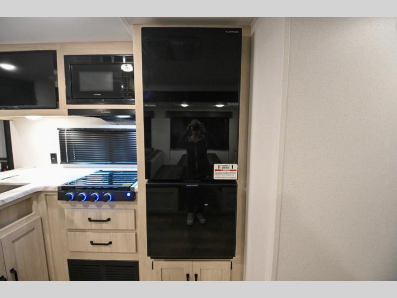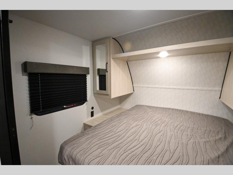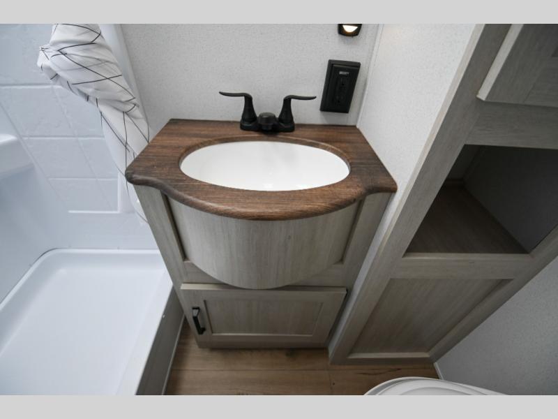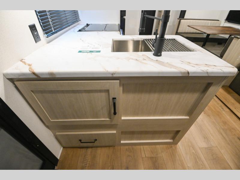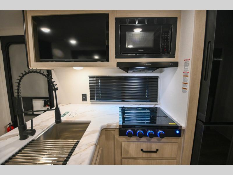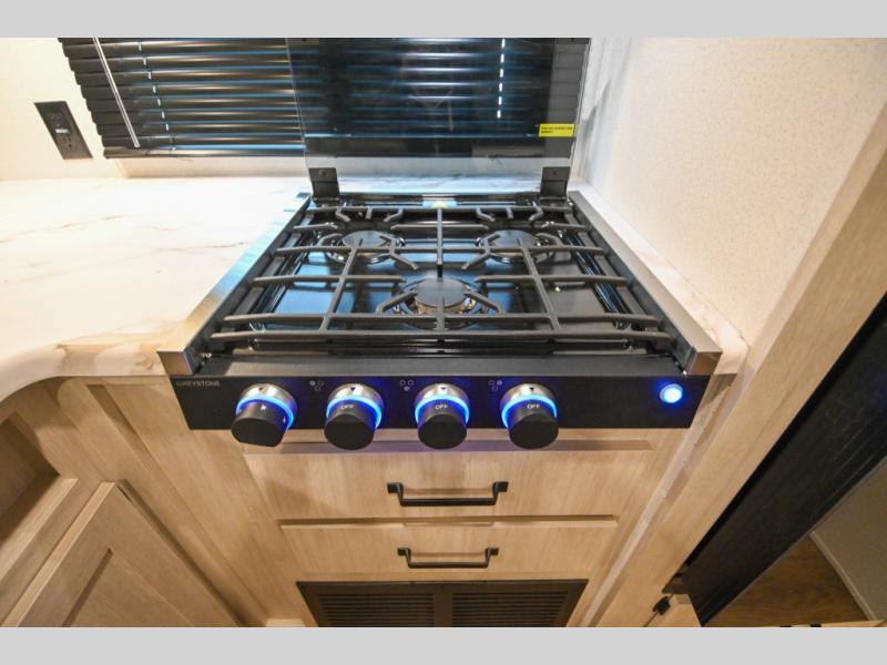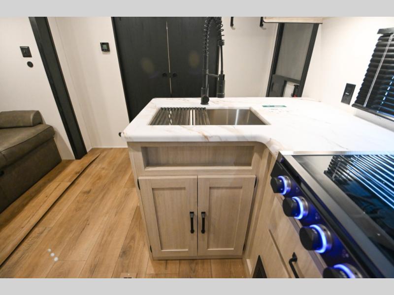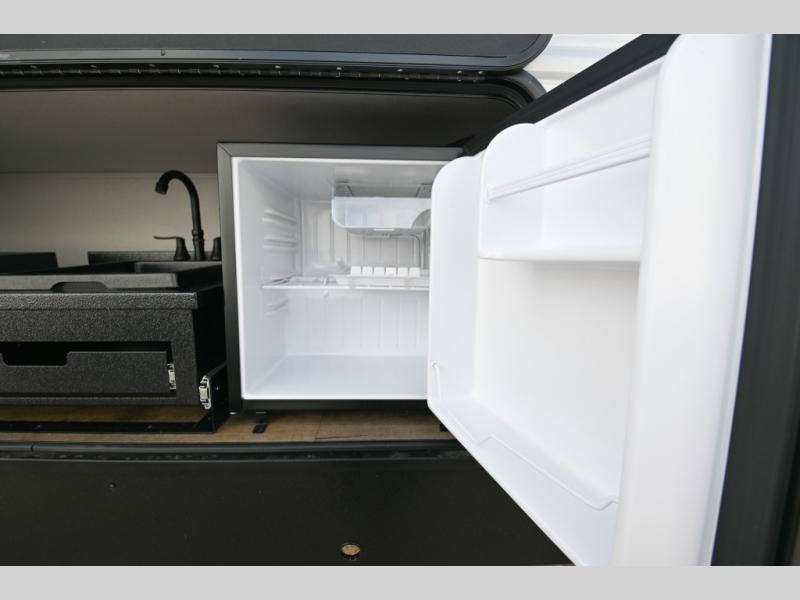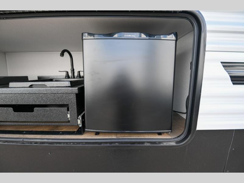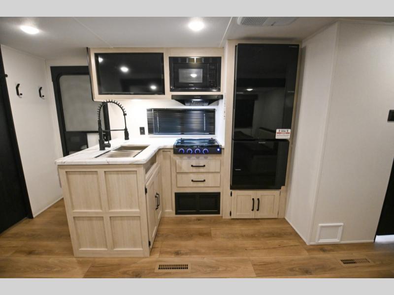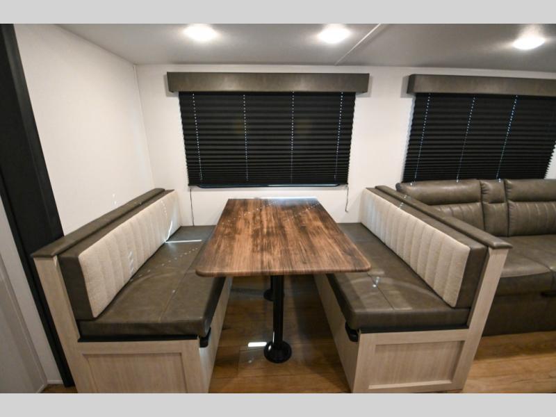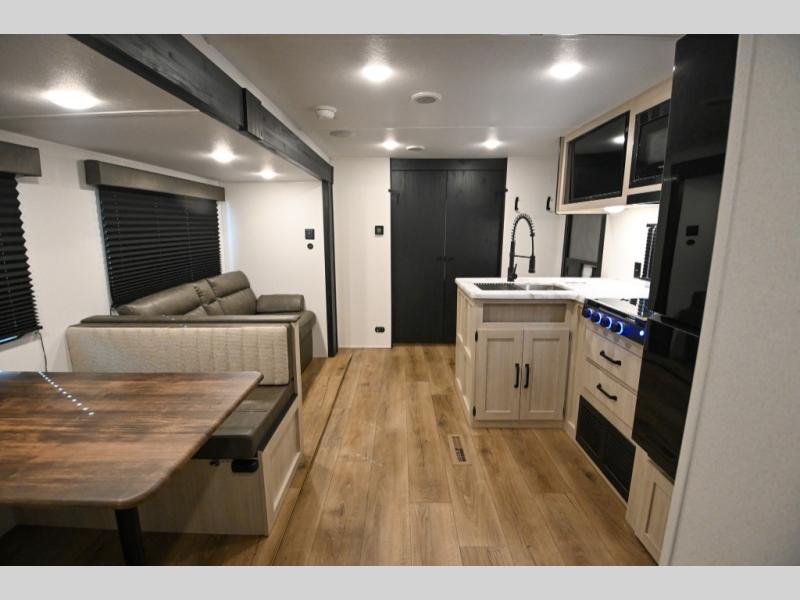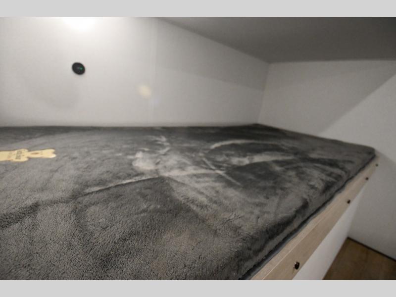 If you're looking for more space, this double axle, double slide out unit is perfect for your group of eight. Within the large slide in the living room, you'll find the booth dinette and sofa, which sit across from the optional TV if you want to enjoy movie nights. The full kitchen includes a stainless microwave and three burner cooktop to make meals, plus a pantry and 12V refrigerator for food storage. And an optional outside kitchen with a griddle can be added if you enjoy cooking outdoors! Your guests or littles are sure to enjoy the rear private bunkhouse that features a set of 38" x 76" bunks across from the third bunk and jiffy sofa within a slide out!