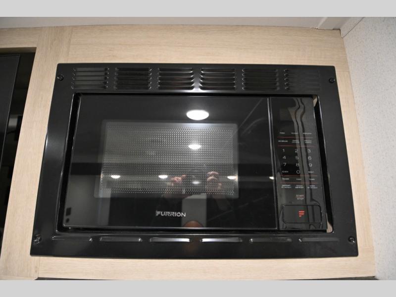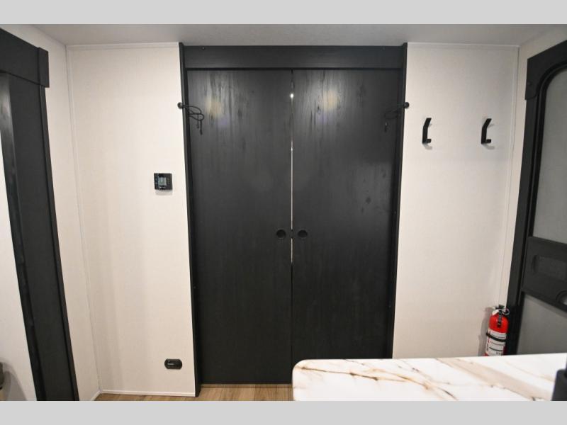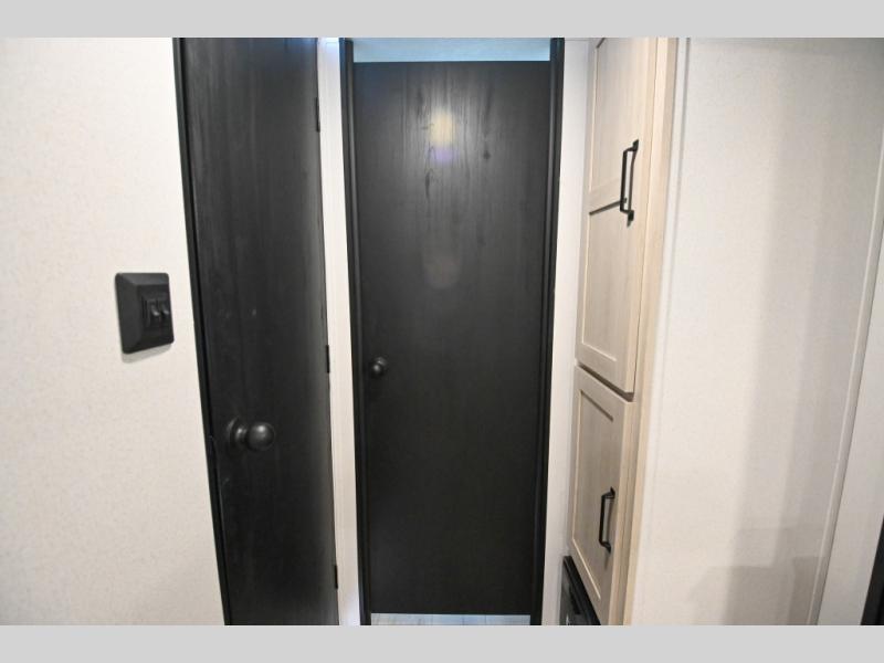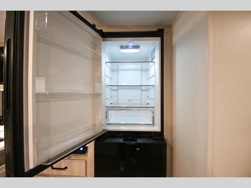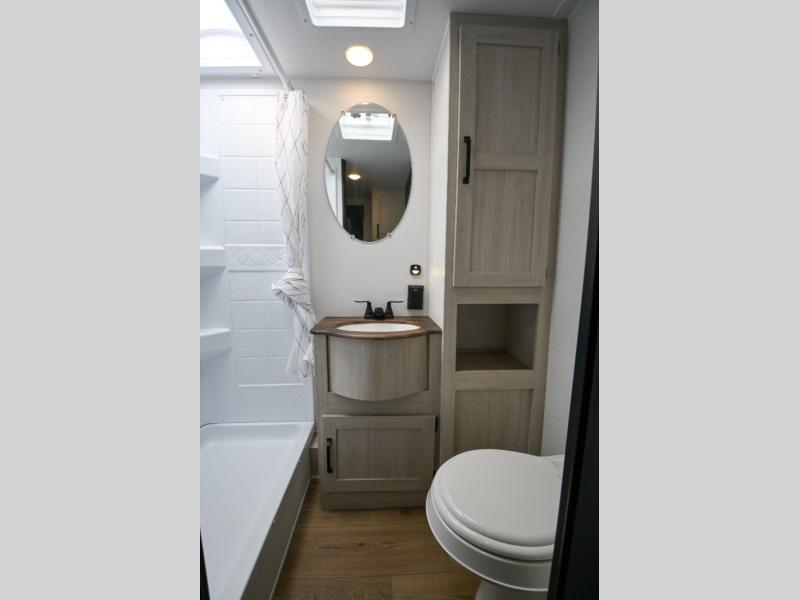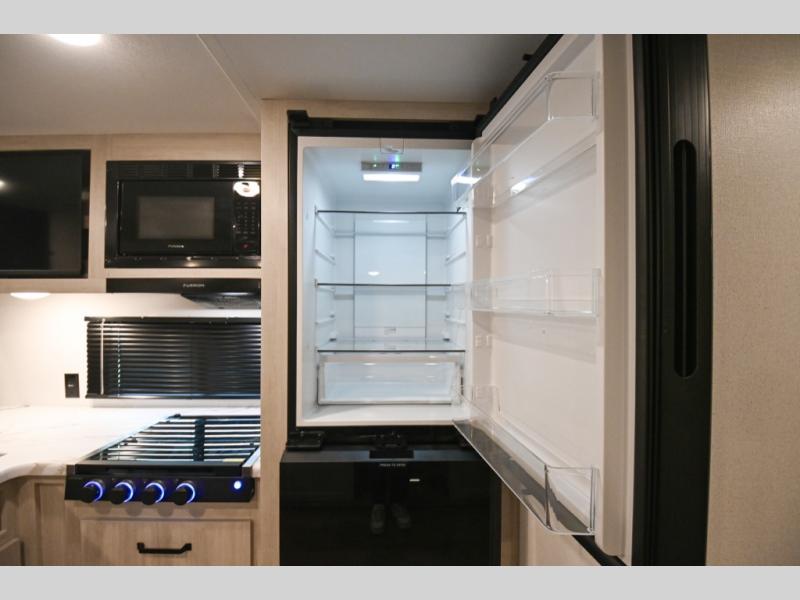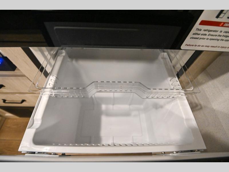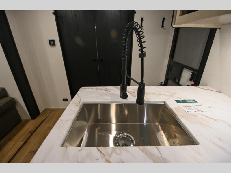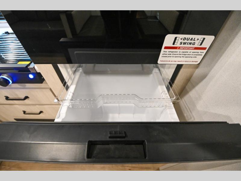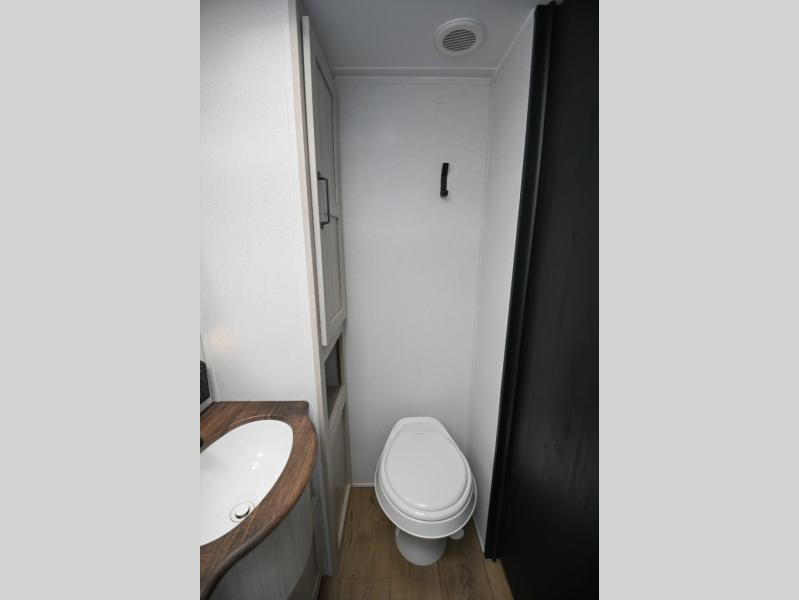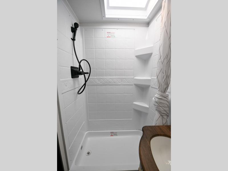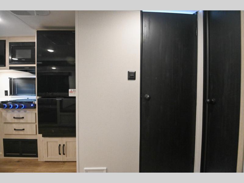 If you're looking for more space, this double axle, double slide out unit is perfect for your group of eight. Within the large slide in the living room, you'll find the booth dinette and sofa, which sit across from the optional TV if you want to enjoy movie nights. The full kitchen includes a stainless microwave and three burner cooktop to make meals, plus a pantry and 12V refrigerator for food storage. And an optional outside kitchen with a griddle can be added if you enjoy cooking outdoors! Your guests or littles are sure to enjoy the rear private bunkhouse that features a set of 38" x 76" bunks across from the third bunk and jiffy sofa within a slide out!