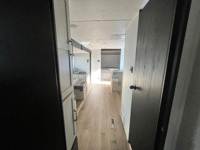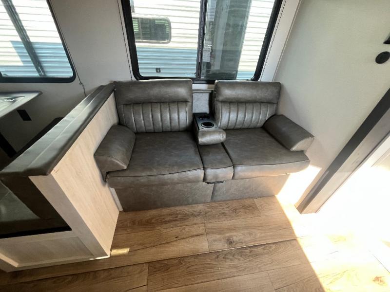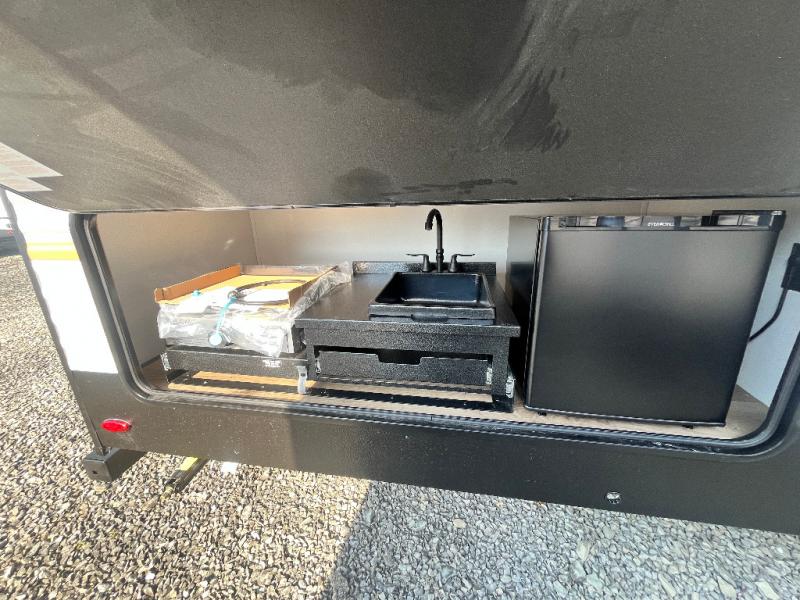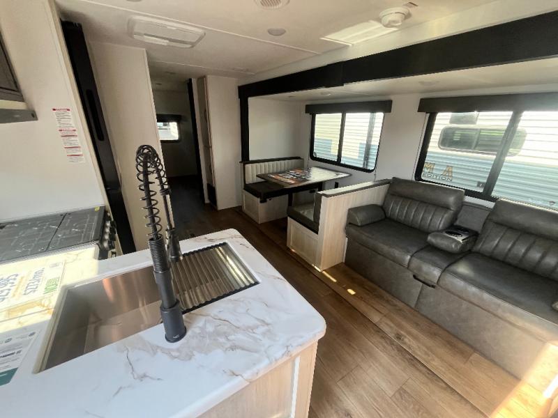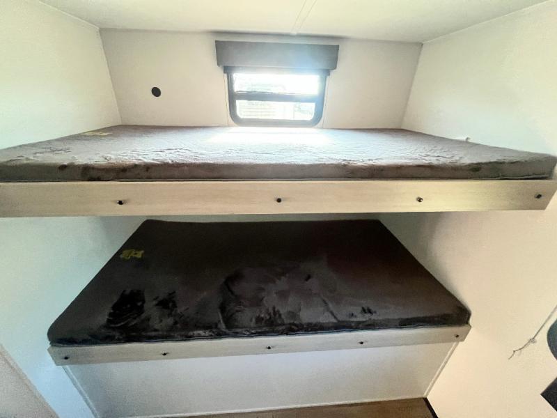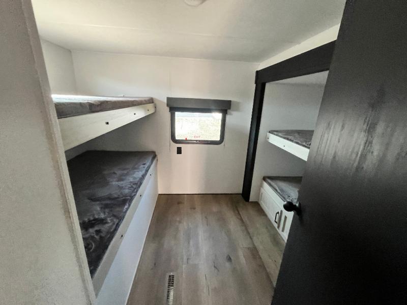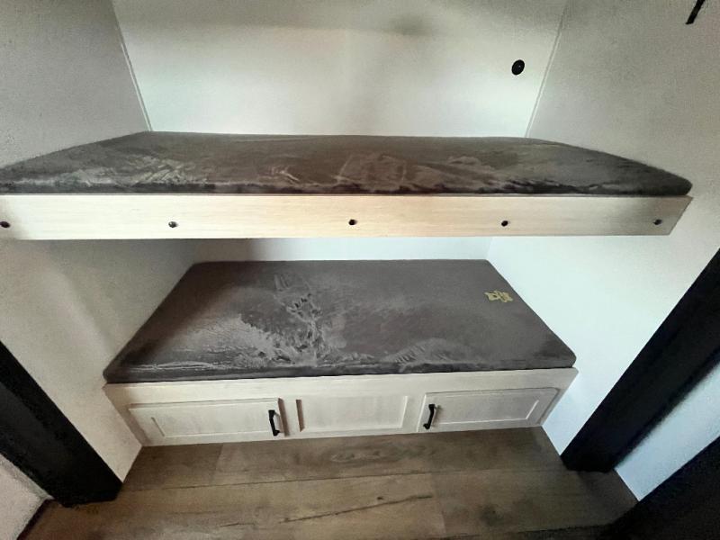 If you're looking for more space, this double axle, double slide out unit is perfect for your group of eight. Within the large slide in the living room, you'll find the booth dinette and sofa, which sit across from the optional TV if you want to enjoy movie nights. The full kitchen includes a stainless microwave and three burner cooktop to make meals, plus a pantry and 12V refrigerator for food storage. And an optional outside kitchen with a griddle can be added if you enjoy cooking outdoors! Your guests or littles are sure to enjoy the rear private bunkhouse that features a set of 38" x 76" bunks across from the third bunk and jiffy sofa within a slide out!