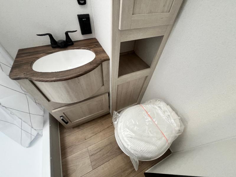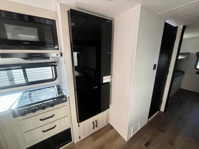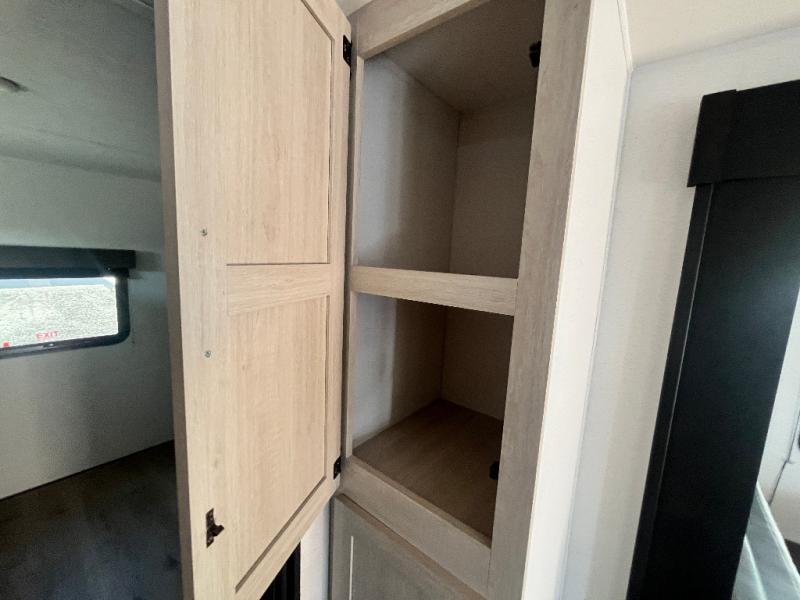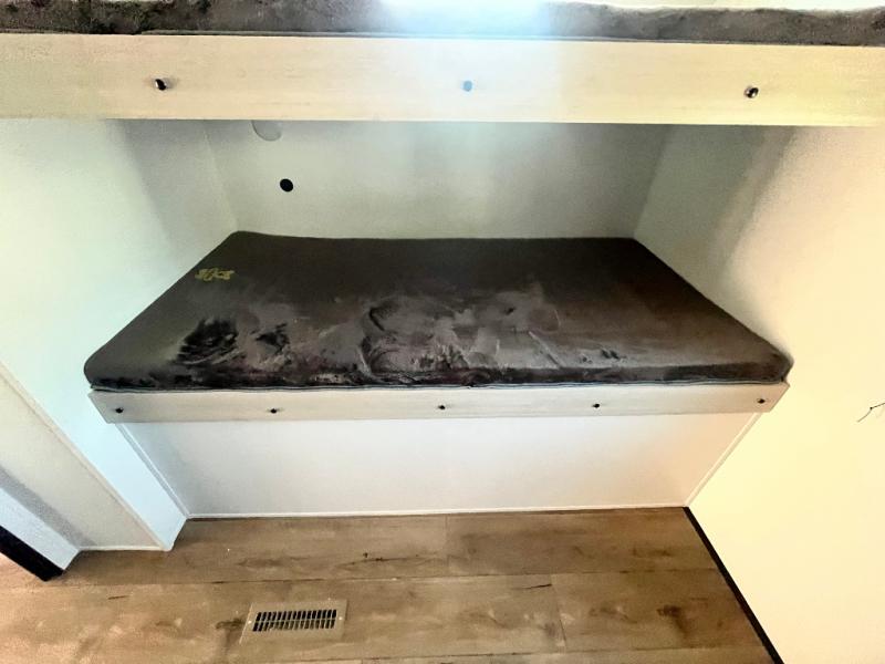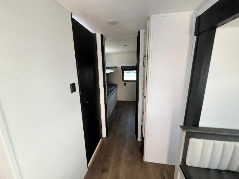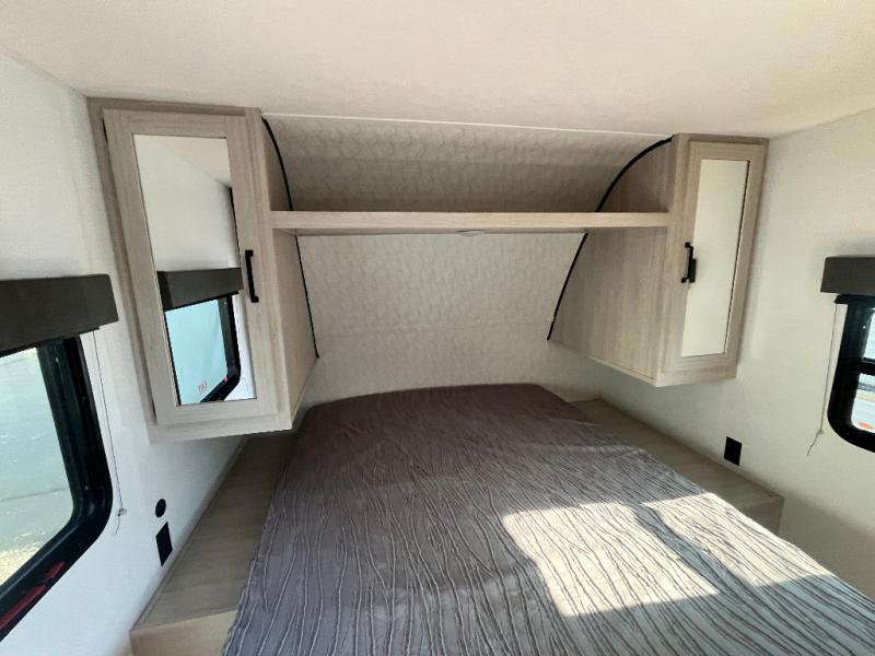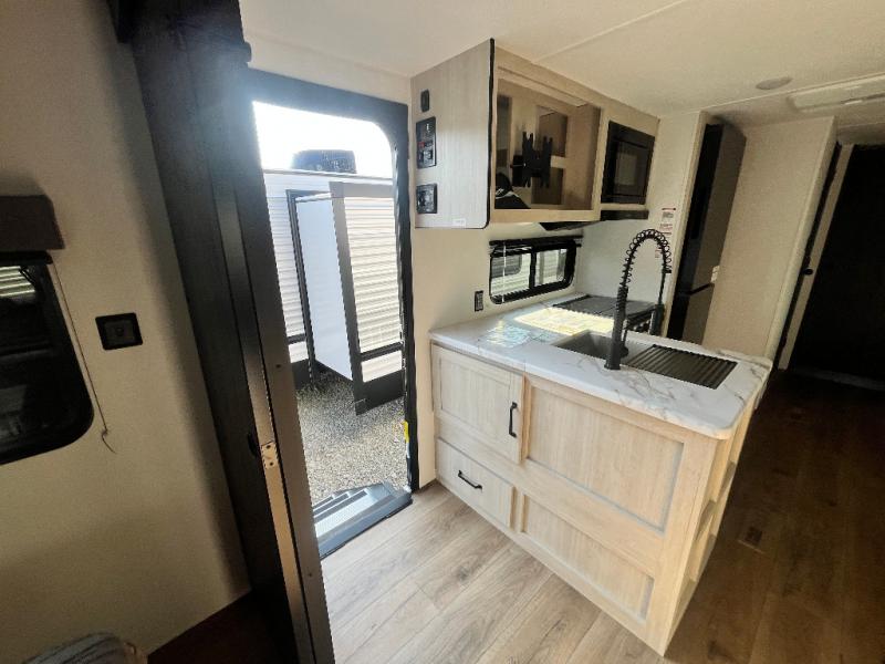 If you're looking for more space, this double axle, double slide out unit is perfect for your group of eight. Within the large slide in the living room, you'll find the booth dinette and sofa, which sit across from the optional TV if you want to enjoy movie nights. The full kitchen includes a stainless microwave and three burner cooktop to make meals, plus a pantry and 12V refrigerator for food storage. And an optional outside kitchen with a griddle can be added if you enjoy cooking outdoors! Your guests or littles are sure to enjoy the rear private bunkhouse that features a set of 38" x 76" bunks across from the third bunk and jiffy sofa within a slide out!