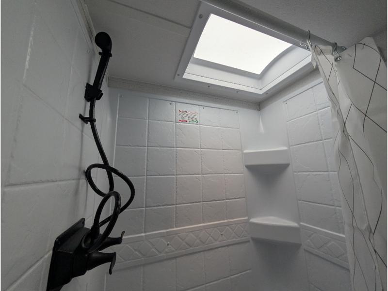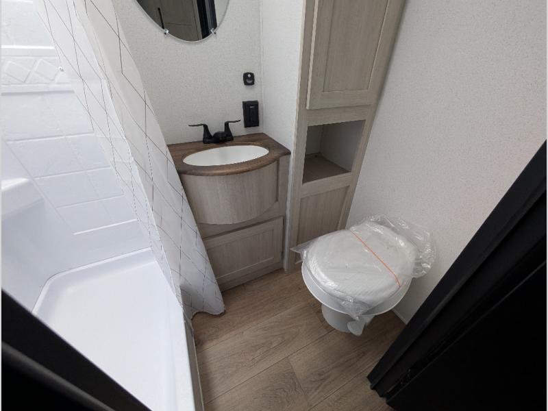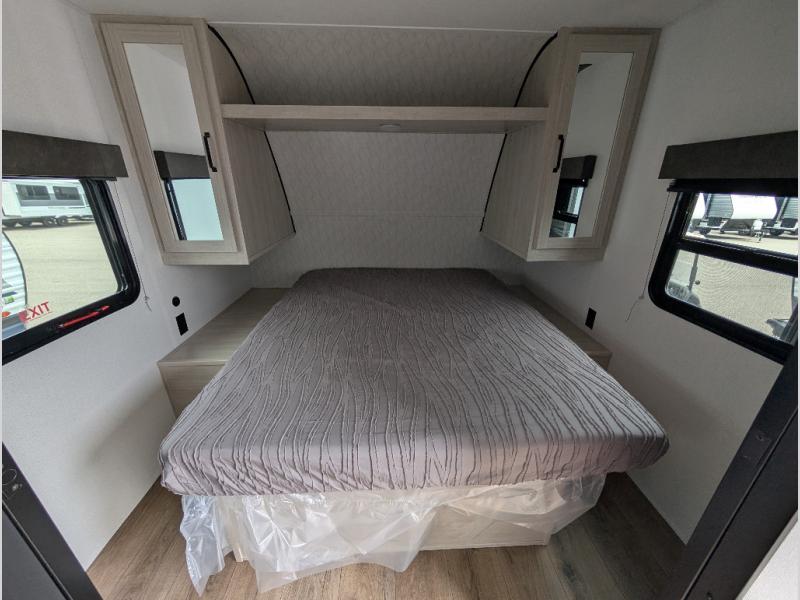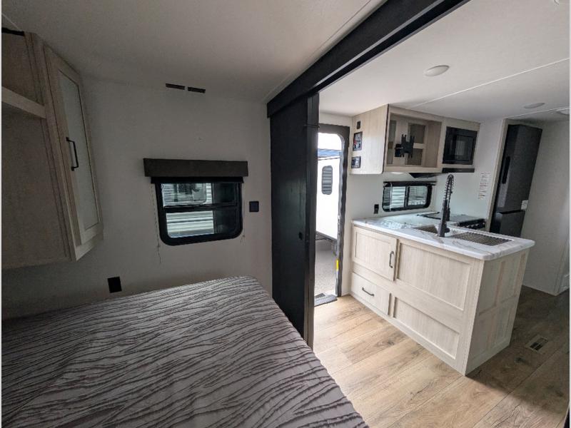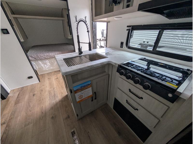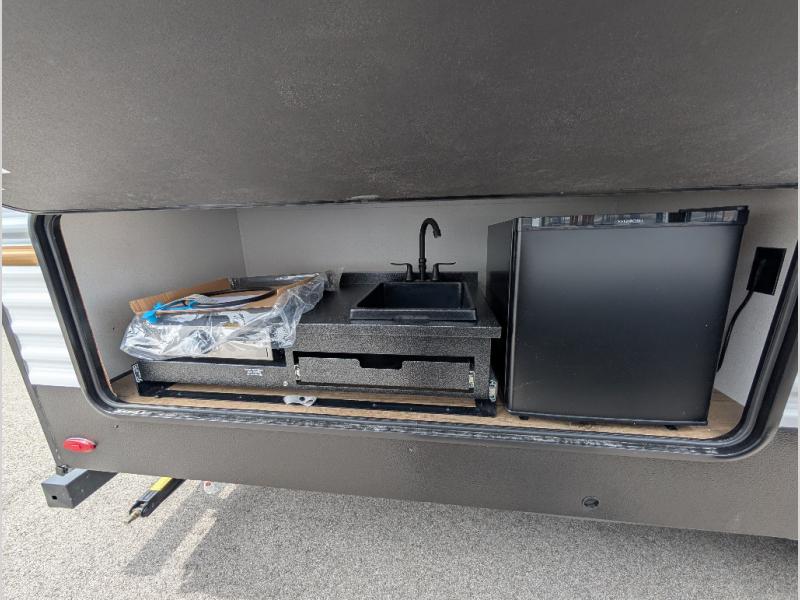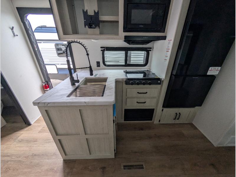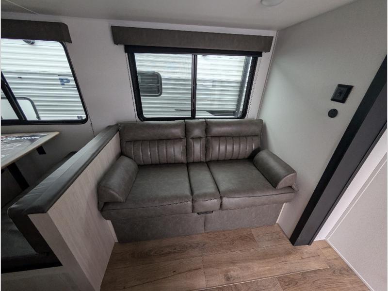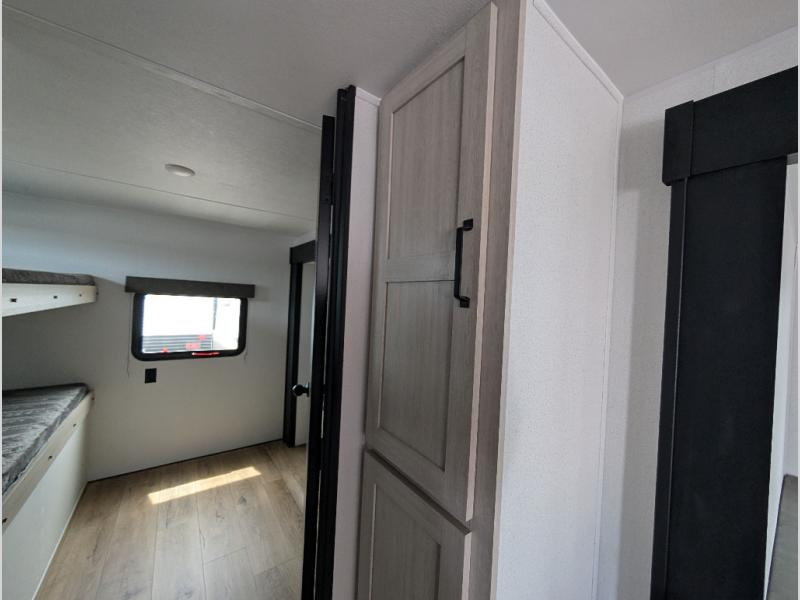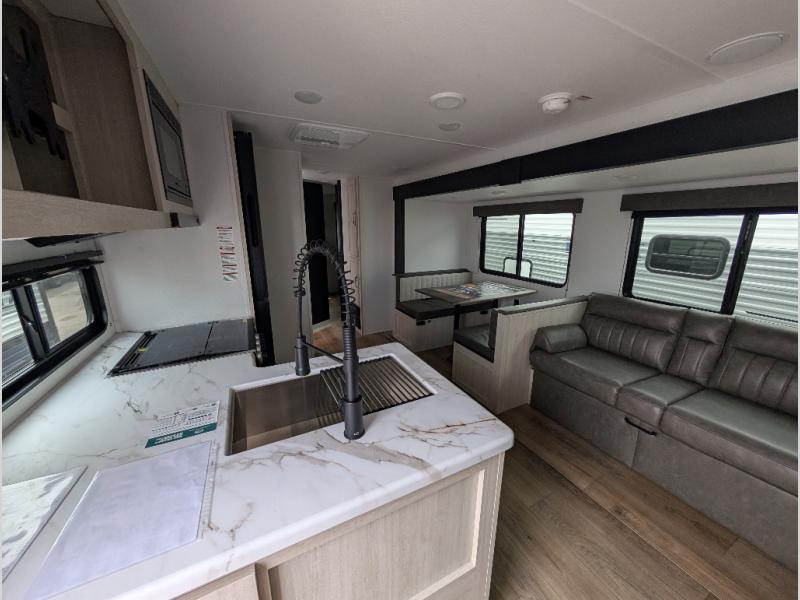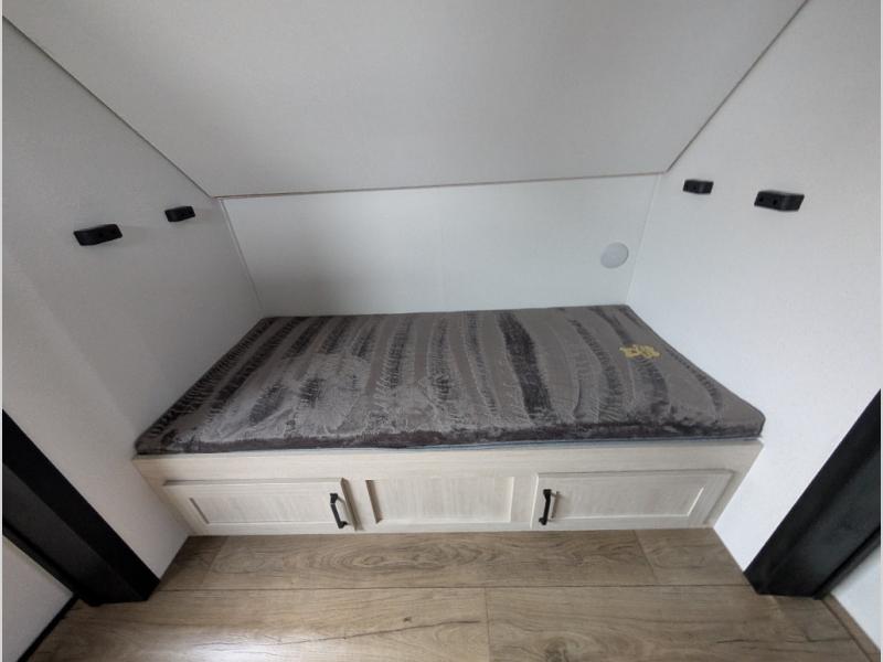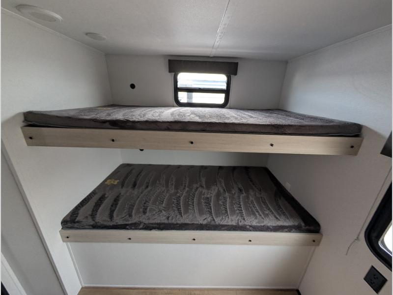If you're looking for more space, this double axle, double slide out unit is perfect for your group of eight. Within the large slide in the living room, you'll find the booth dinette and sofa, which sit across from the optional TV if you want to enjoy movie nights. The full kitchen includes a stainless microwave and three burner cooktop to make meals, plus a pantry and 12V refrigerator for food storage. And an optional outside kitchen with a griddle can be added if you enjoy cooking outdoors! Your guests or littles are sure to enjoy the rear private bunkhouse that features a set of 38" x 76" bunks across from the third bunk and jiffy sofa within a slide out!
