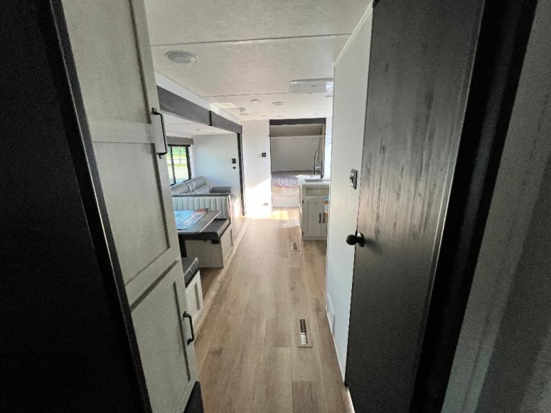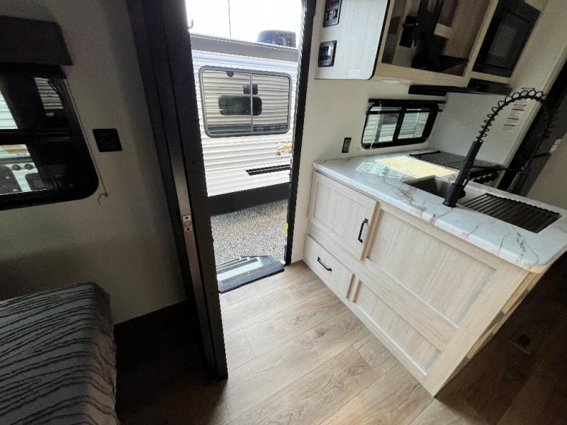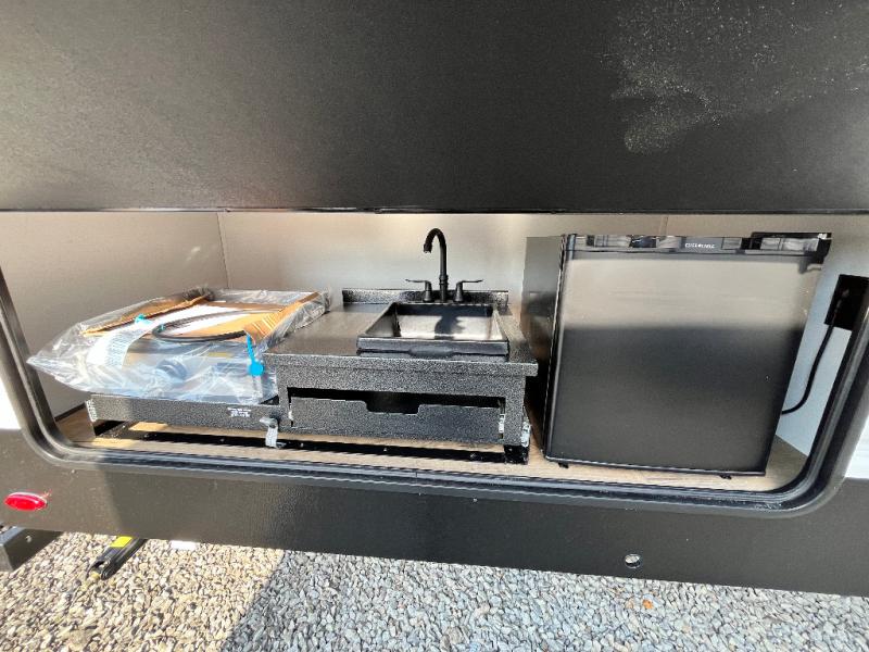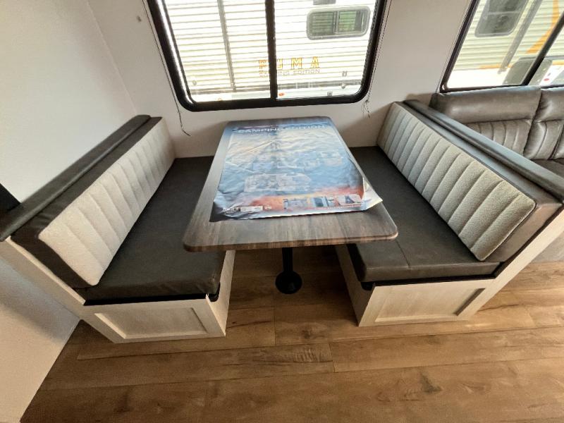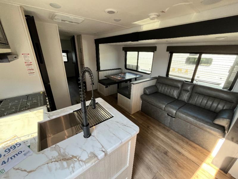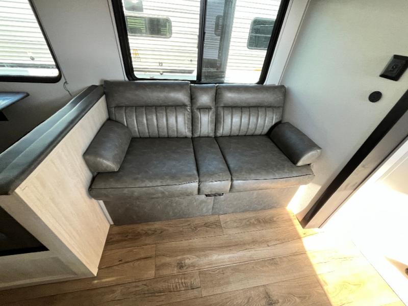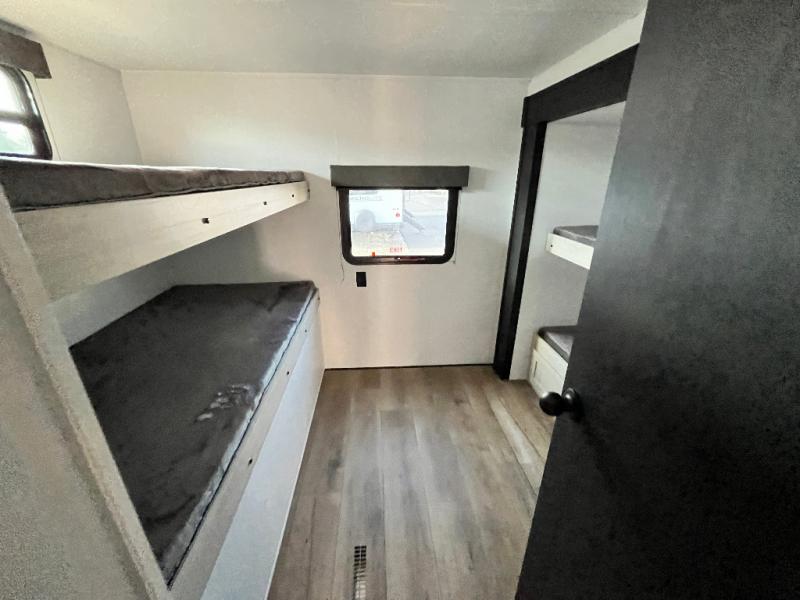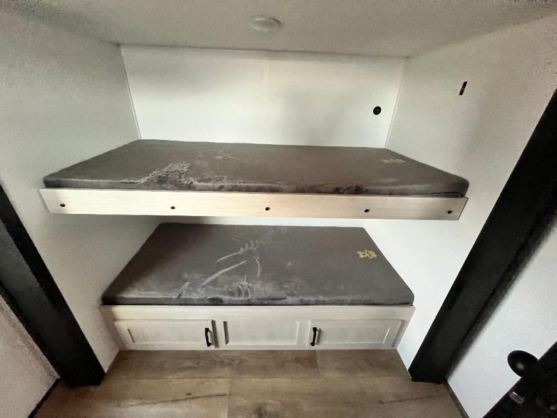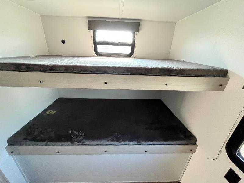 If you're looking for more space, this double axle, double slide out unit is perfect for your group of eight. Within the large slide in the living room, you'll find the booth dinette and sofa, which sit across from the optional TV if you want to enjoy movie nights. The full kitchen includes a stainless microwave and three burner cooktop to make meals, plus a pantry and 12V refrigerator for food storage. And an optional outside kitchen with a griddle can be added if you enjoy cooking outdoors! Your guests or littles are sure to enjoy the rear private bunkhouse that features a set of 38" x 76" bunks across from the third bunk and jiffy sofa within a slide out!