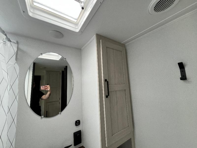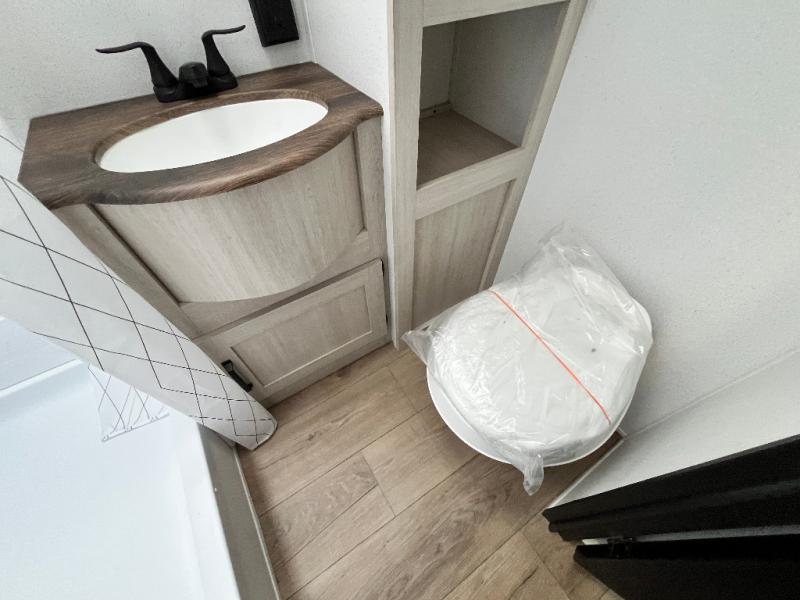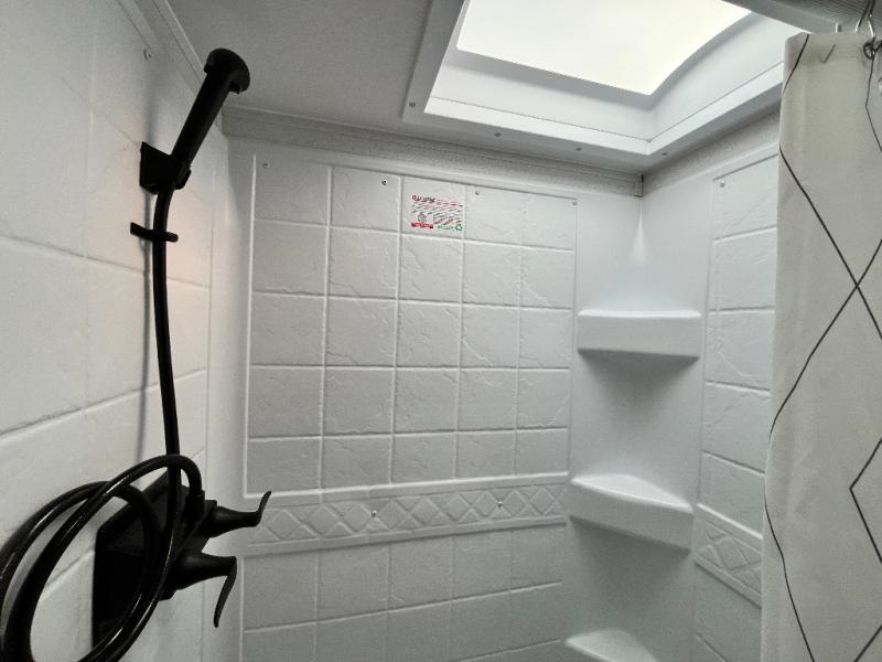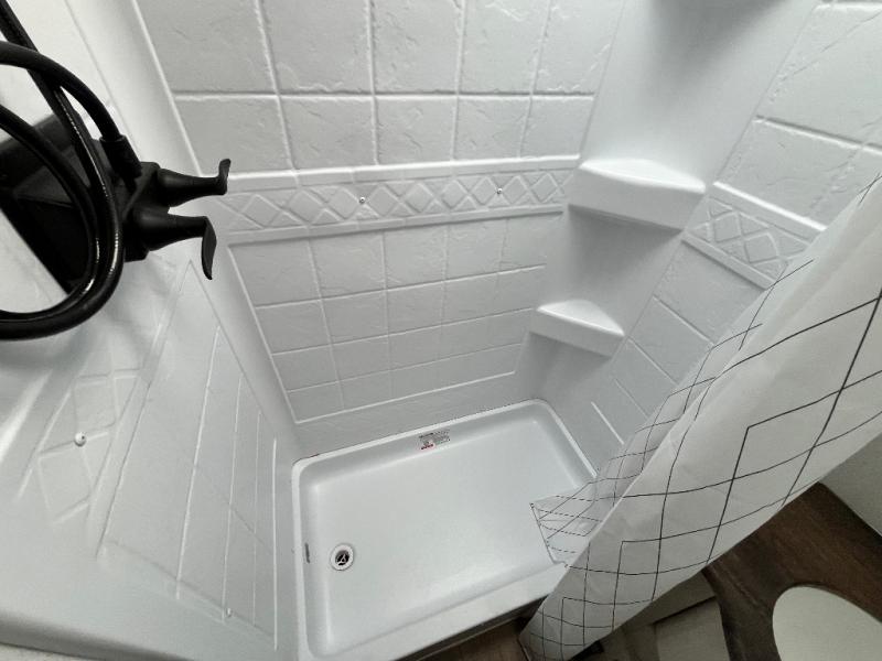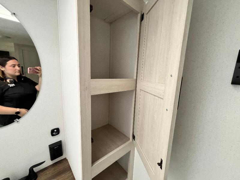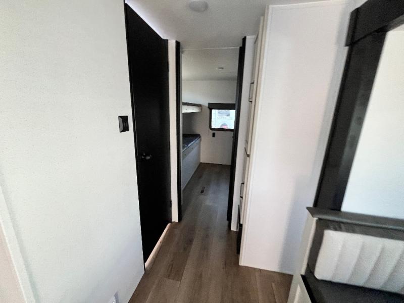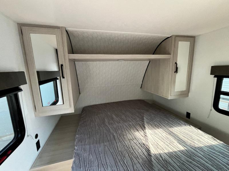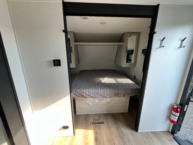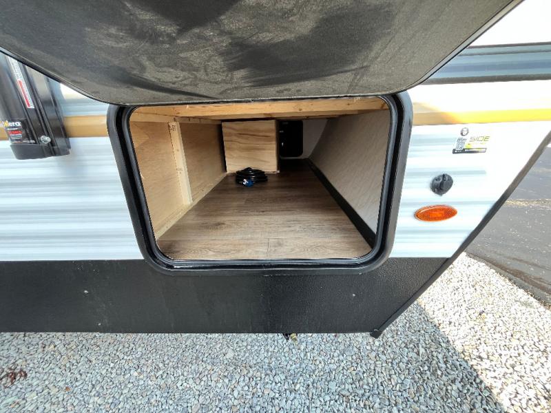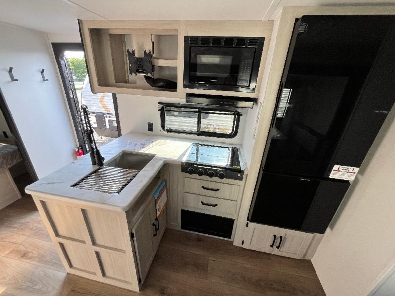 If you're looking for more space, this double axle, double slide out unit is perfect for your group of eight. Within the large slide in the living room, you'll find the booth dinette and sofa, which sit across from the optional TV if you want to enjoy movie nights. The full kitchen includes a stainless microwave and three burner cooktop to make meals, plus a pantry and 12V refrigerator for food storage. And an optional outside kitchen with a griddle can be added if you enjoy cooking outdoors! Your guests or littles are sure to enjoy the rear private bunkhouse that features a set of 38" x 76" bunks across from the third bunk and jiffy sofa within a slide out!