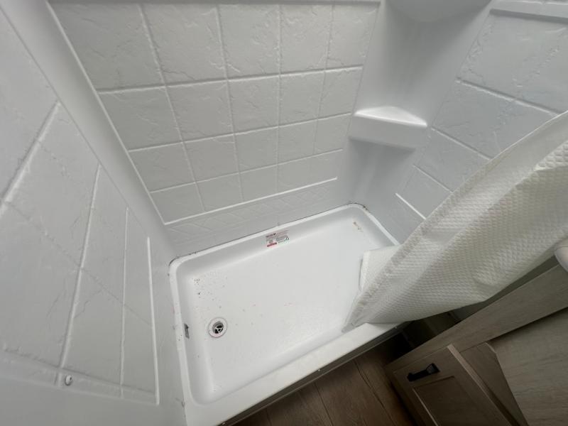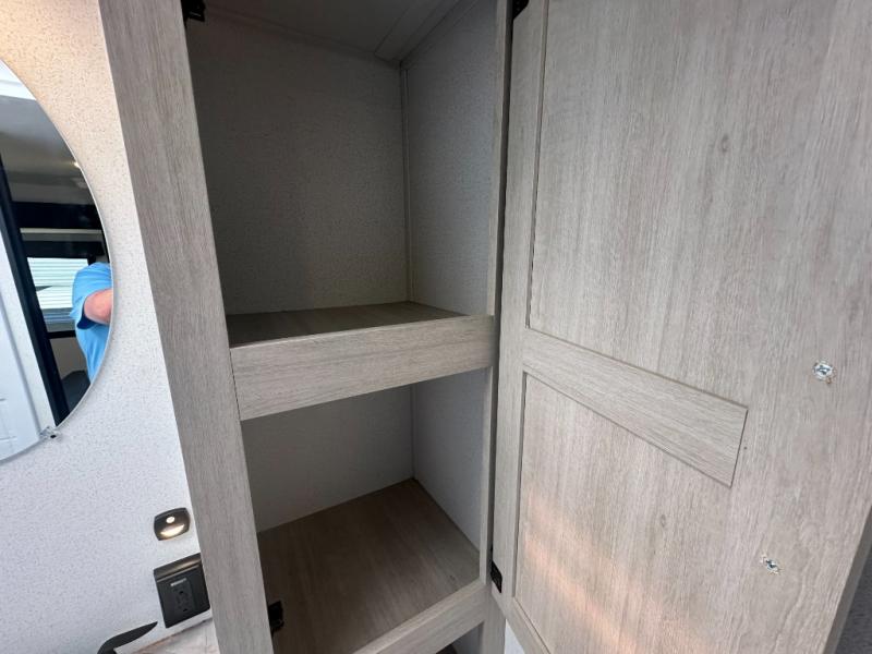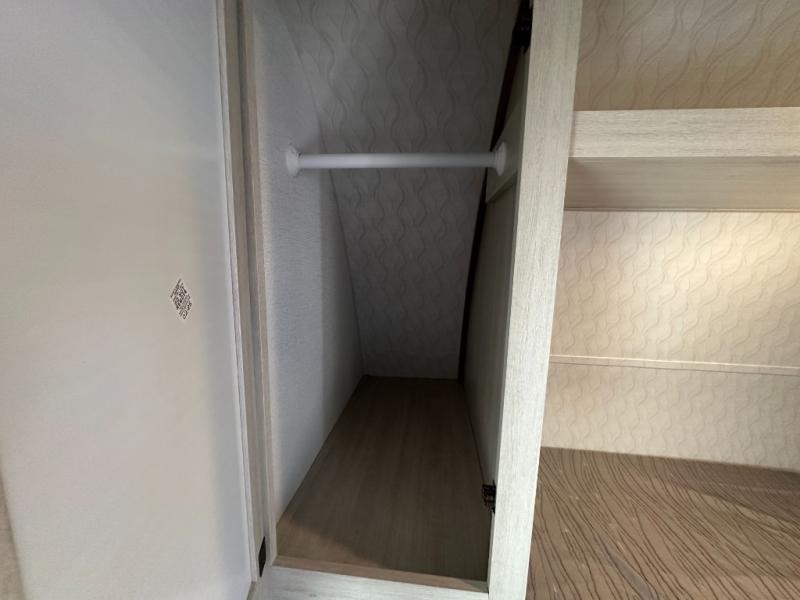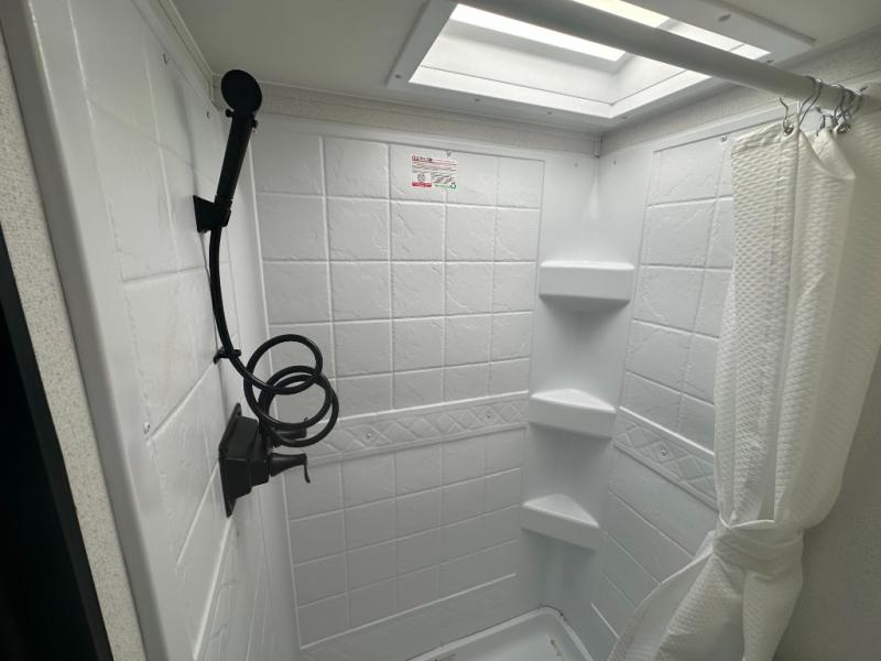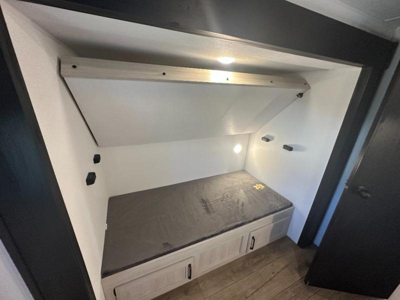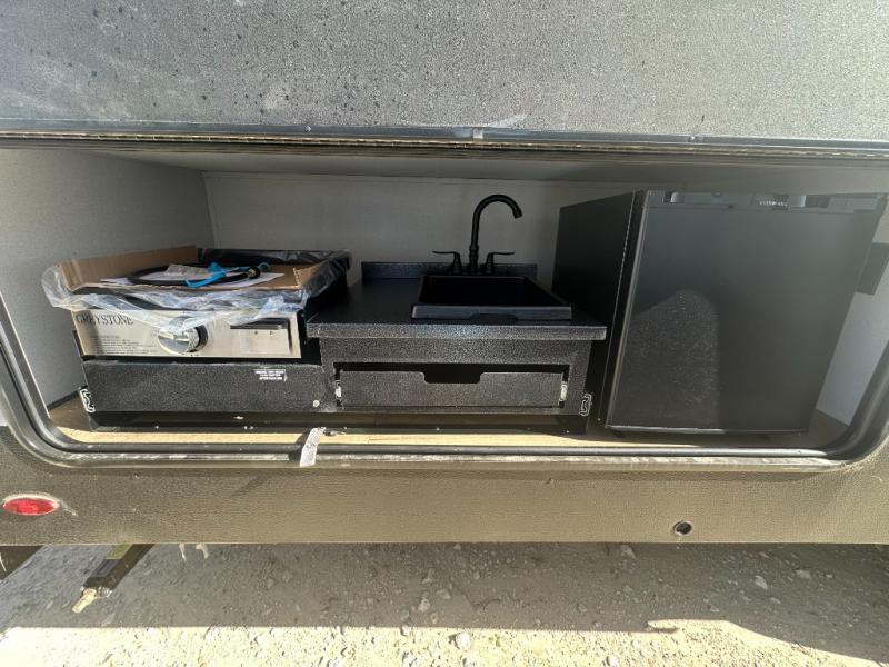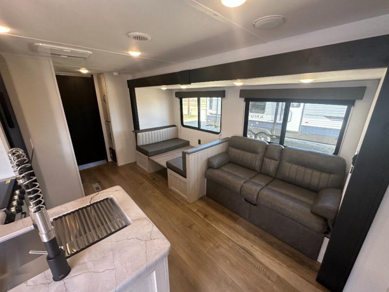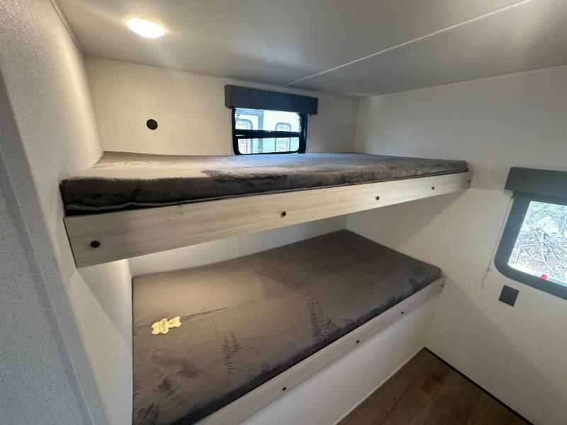 If you're looking for more space, this double axle, double slide out unit is perfect for your group of eight. Within the large slide in the living room, you'll find the booth dinette and sofa, which sit across from the optional TV if you want to enjoy movie nights. The full kitchen includes a stainless microwave and three burner cooktop to make meals, plus a pantry and 12V refrigerator for food storage. And an optional outside kitchen with a griddle can be added if you enjoy cooking outdoors! Your guests or littles are sure to enjoy the rear private bunkhouse that features a set of 38" x 76" bunks across from the third bunk and jiffy sofa within a slide out!