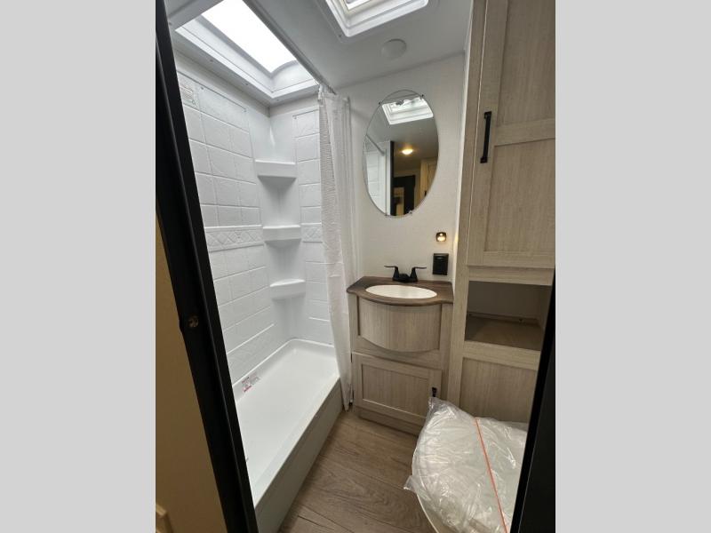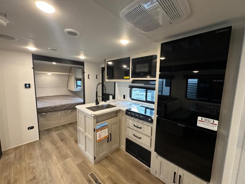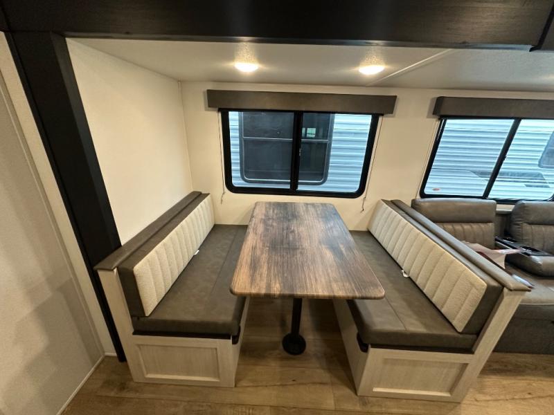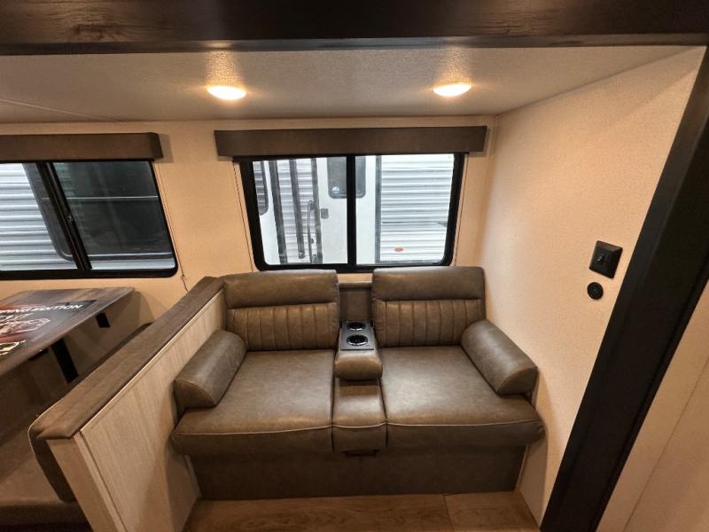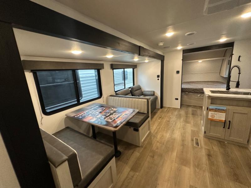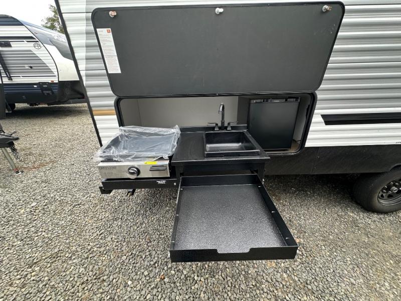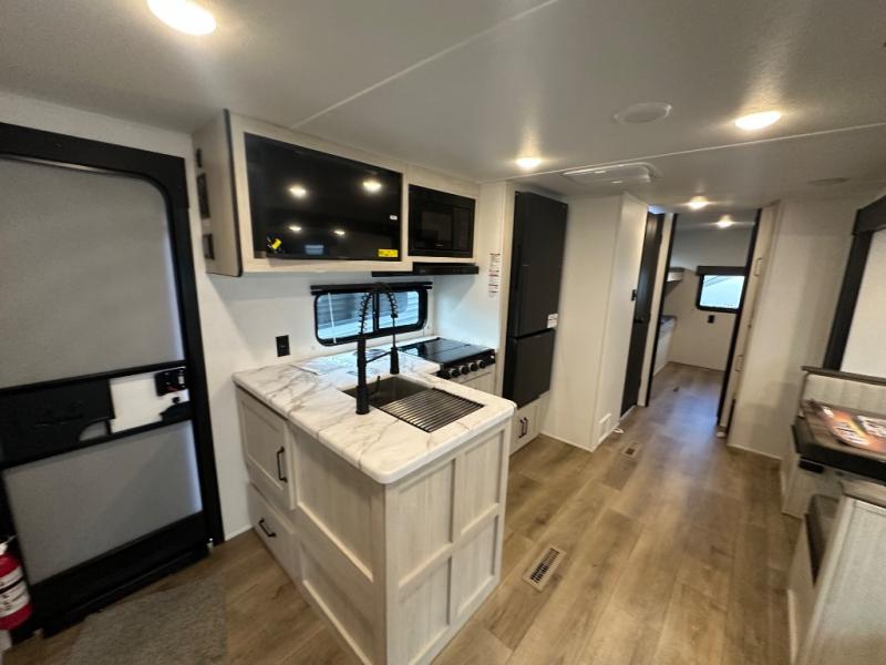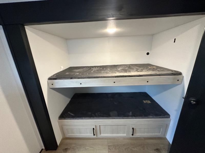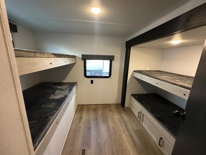 If you're looking for more space, this double axle, double slide out unit is perfect for your group of eight. Within the large slide in the living room, you'll find the booth dinette and sofa, which sit across from the optional TV if you want to enjoy movie nights. The full kitchen includes a stainless microwave and three burner cooktop to make meals, plus a pantry and 12V refrigerator for food storage. And an optional outside kitchen with a griddle can be added if you enjoy cooking outdoors! Your guests or littles are sure to enjoy the rear private bunkhouse that features a set of 38" x 76" bunks across from the third bunk and jiffy sofa within a slide out!