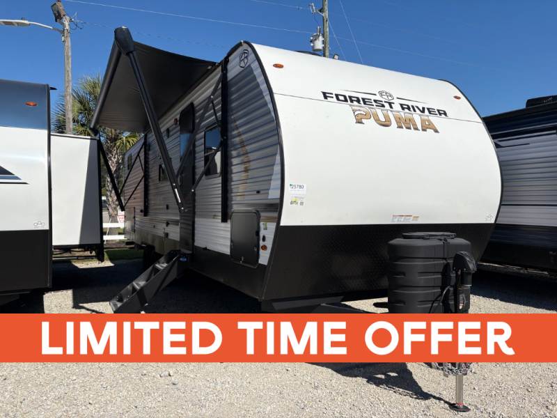 The Puma Camping Edition by Palomino offer an affordable travel trailer for rookie campers or seasoned RVers! They are built with 5/8" tongue and groove plywood flooring and a front diamond plate for added protection. There are also exterior clamp style door latches, back up camera prep, and 20 lb. LP bottles. Head inside to find Thermofoil countertops with a smooth drop edge, bedroom USB ports and outlets, and a GE appliance and kitchen package.
