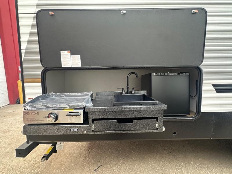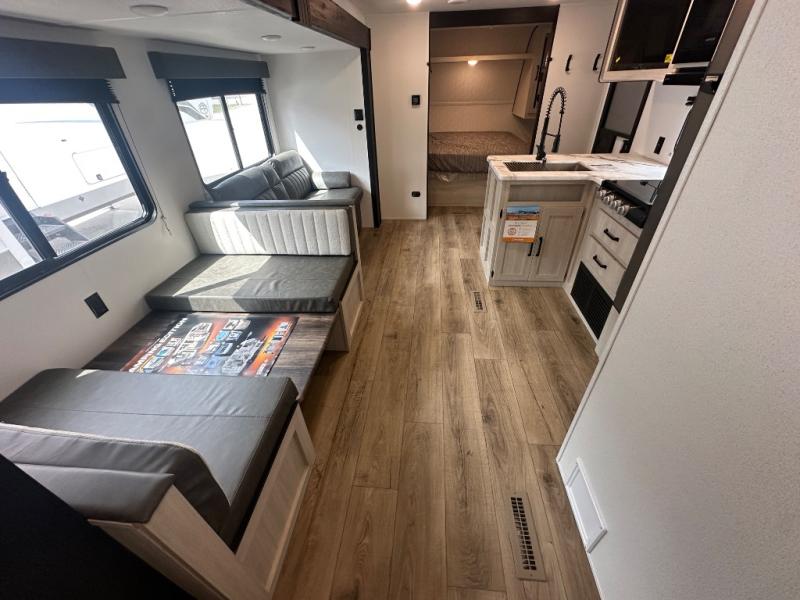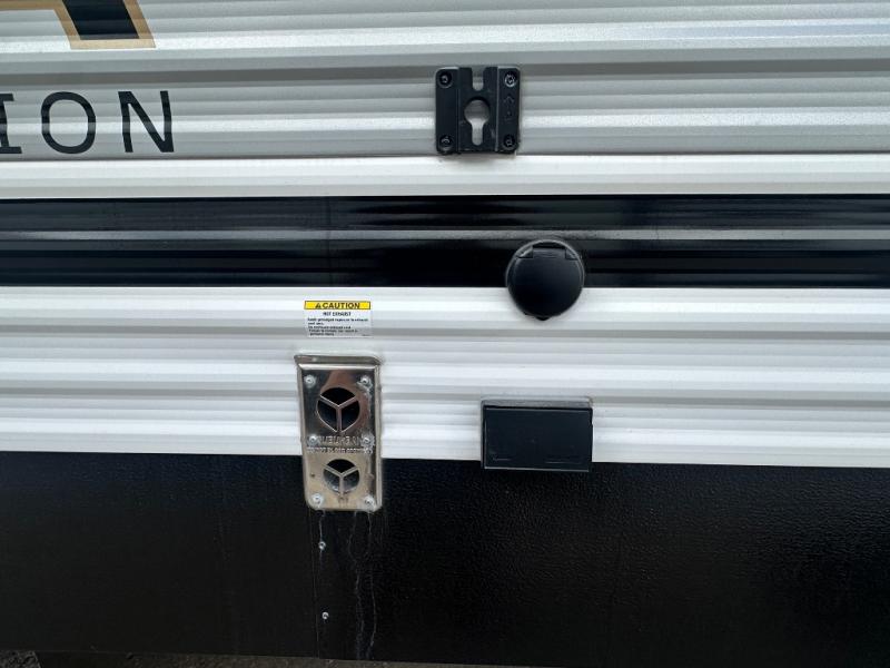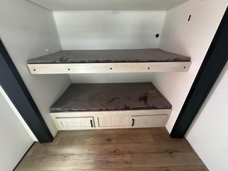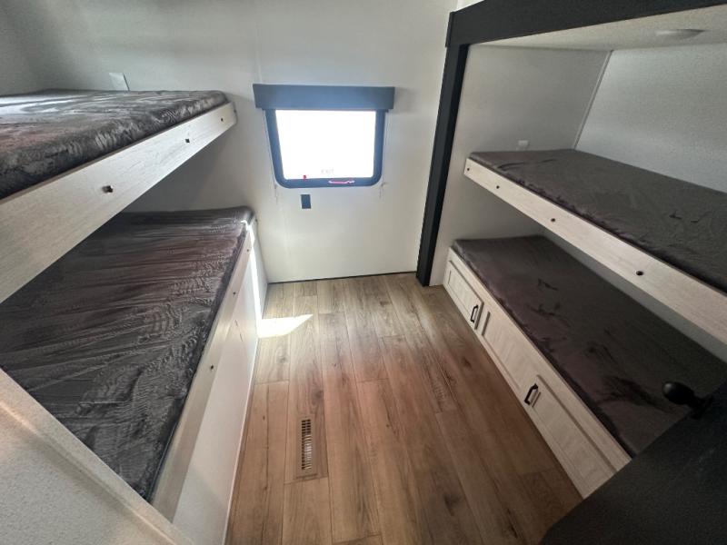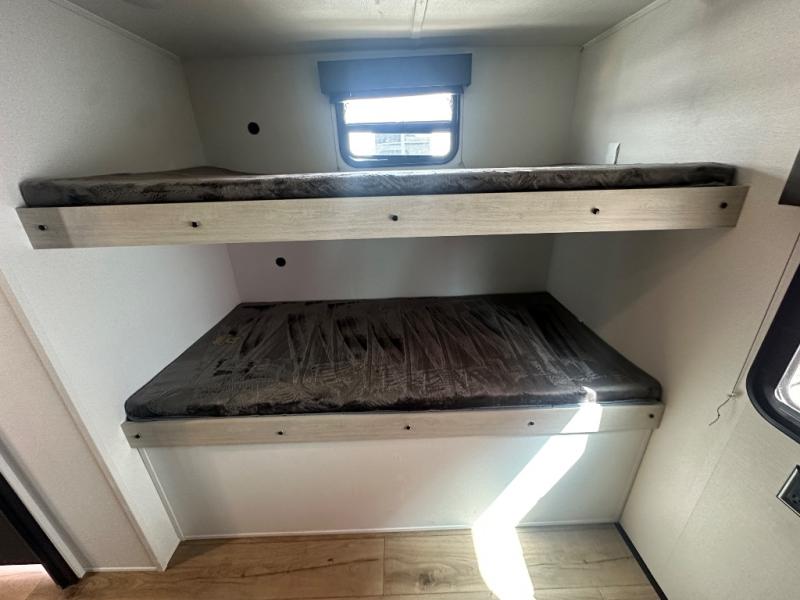 If you're looking for more space, this double axle, double slide out unit is perfect for your group of eight. Within the large slide in the living room, you'll find the booth dinette and sofa, which sit across from the optional TV if you want to enjoy movie nights. The full kitchen includes a microwave and three burner cooktop to make meals, plus a pantry and 12V refrigerator for food storage. And an optional outside mini kitchen with a grill can be added if you enjoy cooking outdoors! Your guests or littles are sure to enjoy the rear private bunkhouse that features a set of 38" x 76" bunks across from the third bunk and jiffy sofa within a slide out!