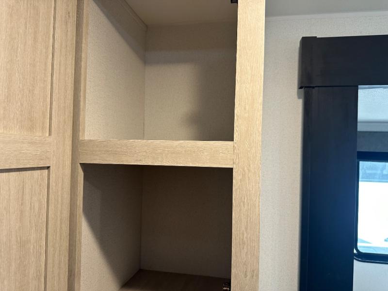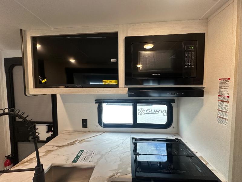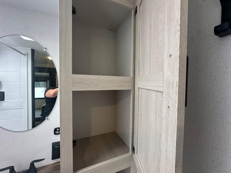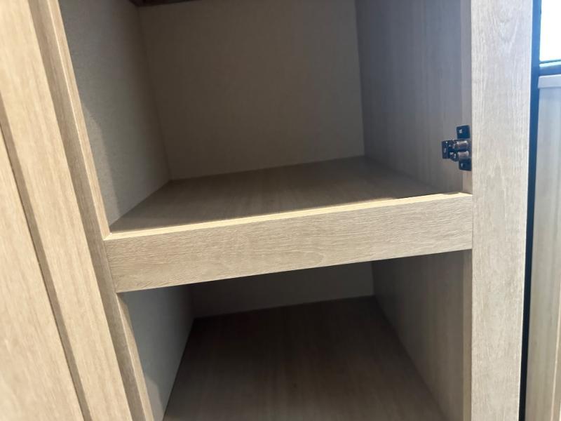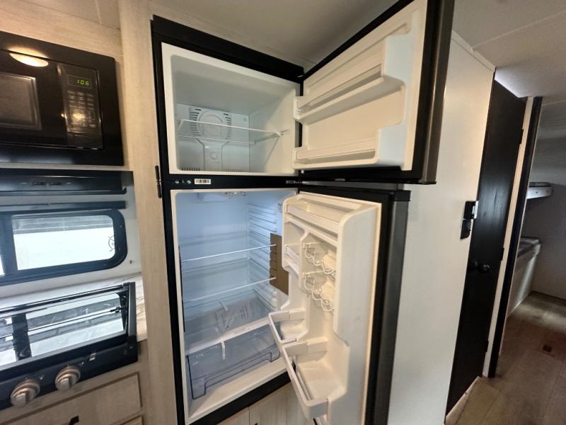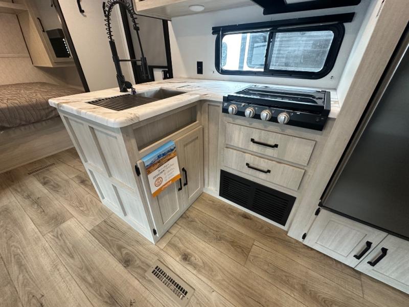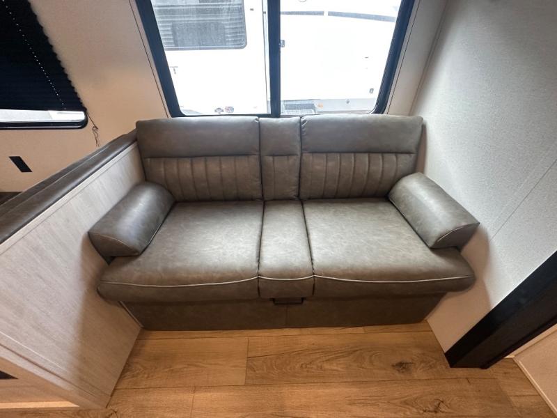 If you're looking for more space, this double axle, double slide out unit is perfect for your group of eight. Within the large slide in the living room, you'll find the booth dinette and sofa, which sit across from the optional TV if you want to enjoy movie nights. The full kitchen includes a microwave and three burner cooktop to make meals, plus a pantry and 12V refrigerator for food storage. And an optional outside mini kitchen with a grill can be added if you enjoy cooking outdoors! Your guests or littles are sure to enjoy the rear private bunkhouse that features a set of 38" x 76" bunks across from the third bunk and jiffy sofa within a slide out!