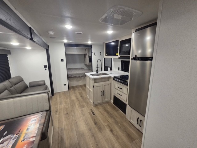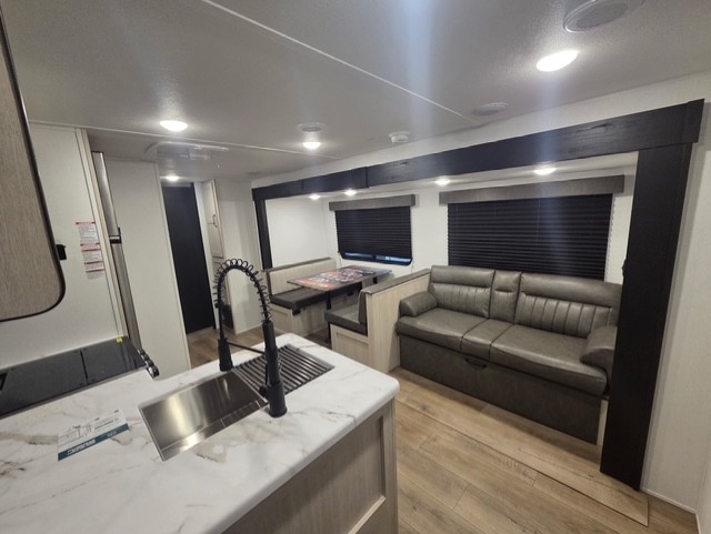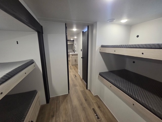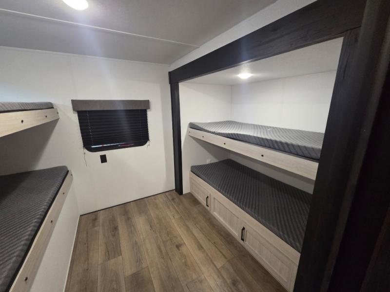If you're looking for more space, this double axle, double slide out unit is perfect for your group of eight. Within the large slide in the living room, you'll find the booth dinette and sofa, which sit across from the optional TV if you want to enjoy movie nights. The full kitchen includes a microwave and three burner cooktop to make meals, plus a pantry and 12V refrigerator for food storage. And an optional outside mini kitchen with a grill can be added if you enjoy cooking outdoors! Your guests or littles are sure to enjoy the rear private bunkhouse that features a set of 38" x 76" bunks across from the third bunk and jiffy sofa within a slide out!