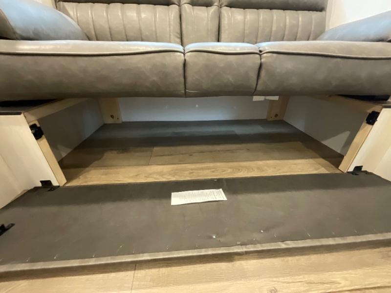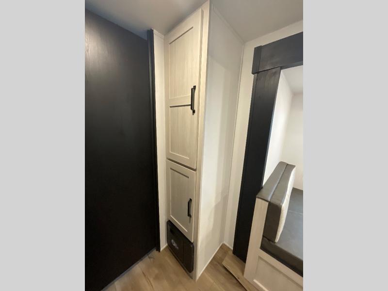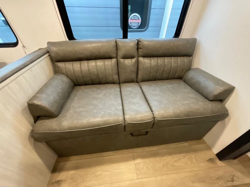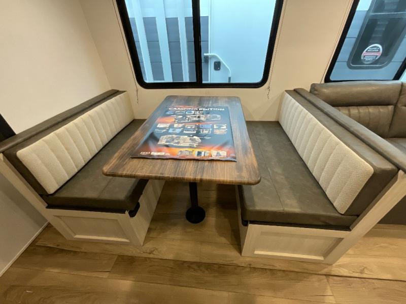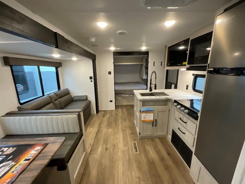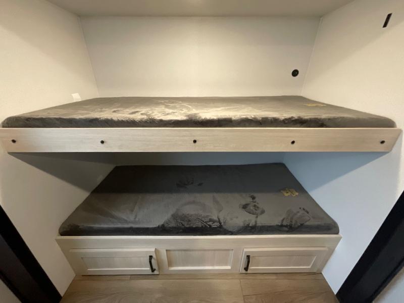 If you're looking for more space, this double axle, double slide out unit is perfect for your group of eight. Within the large slide in the living room, you'll find the booth dinette and sofa, which sit across from the optional TV if you want to enjoy movie nights. The full kitchen includes a microwave and three burner cooktop to make meals, plus a pantry and 12V refrigerator for food storage. And an optional outside mini kitchen with a grill can be added if you enjoy cooking outdoors! Your guests or littles are sure to enjoy the rear private bunkhouse that features a set of 38" x 76" bunks across from the third bunk and jiffy sofa within a slide out!