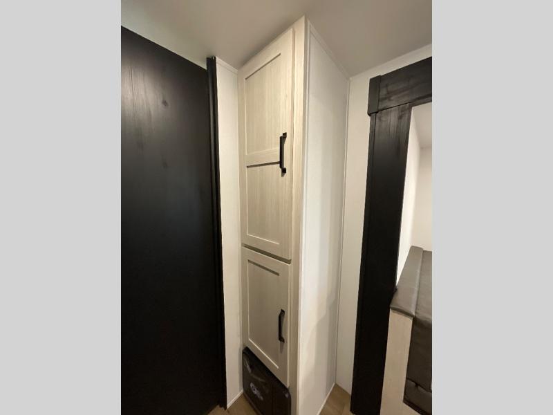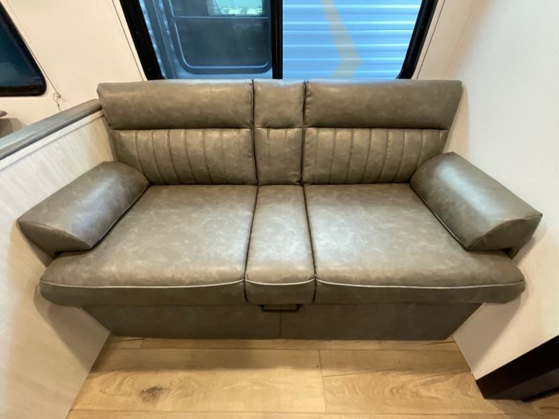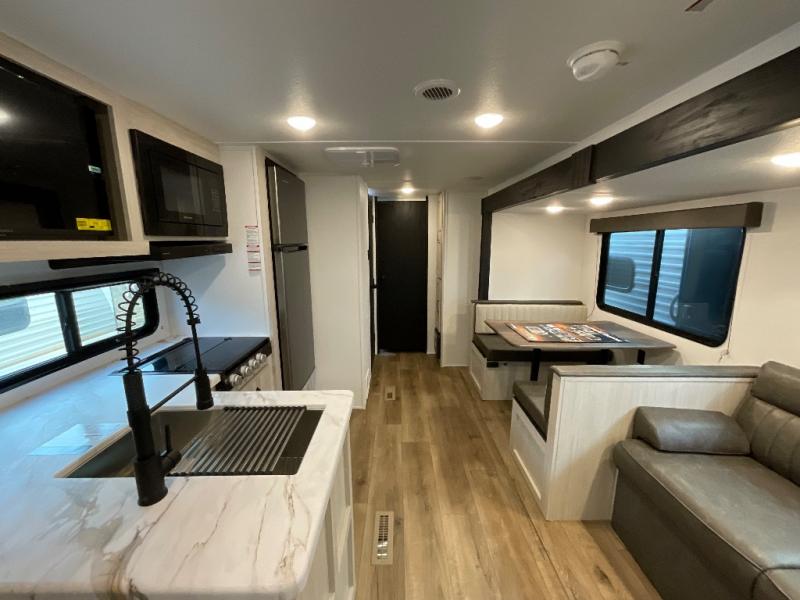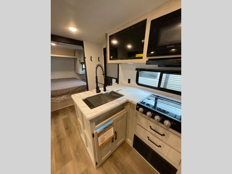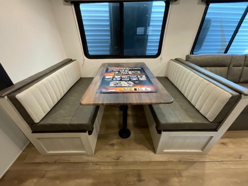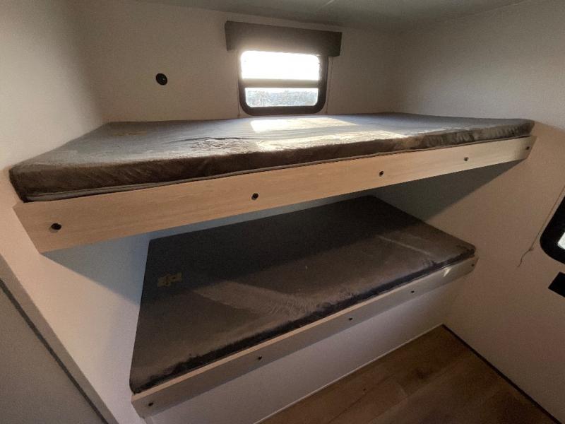 If you're looking for more space, this double axle, double slide out unit is perfect for your group of eight. Within the large slide in the living room, you'll find the booth dinette and sofa, which sit across from the optional TV if you want to enjoy movie nights. The full kitchen includes a microwave and three burner cooktop to make meals, plus a pantry and 12V refrigerator for food storage. And an optional outside mini kitchen with a grill can be added if you enjoy cooking outdoors! Your guests or littles are sure to enjoy the rear private bunkhouse that features a set of 38" x 76" bunks across from the third bunk and jiffy sofa within a slide out!