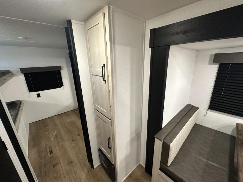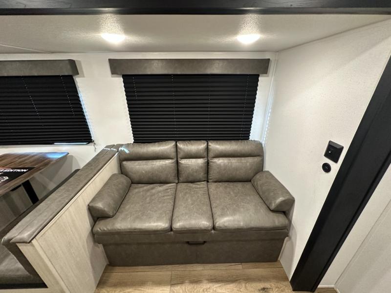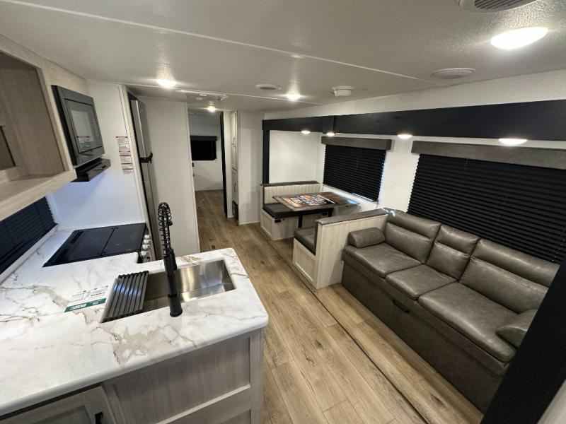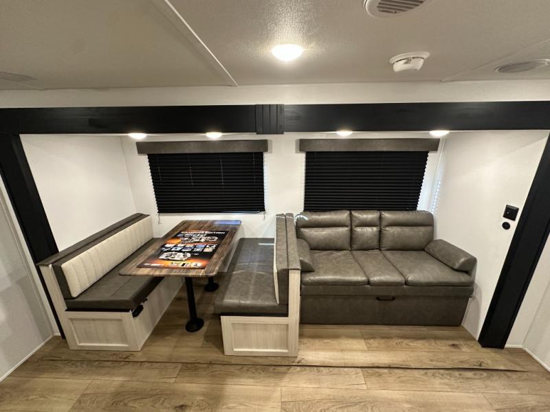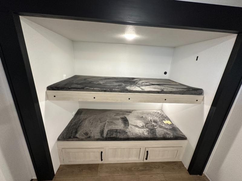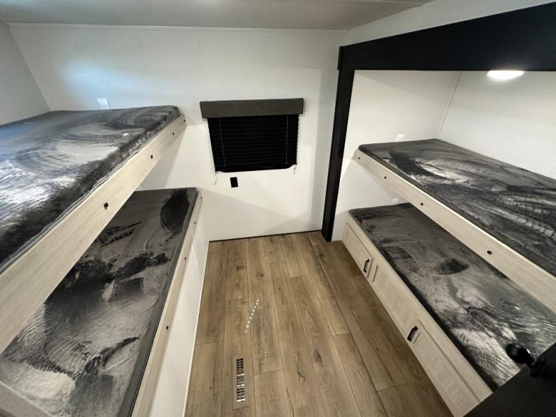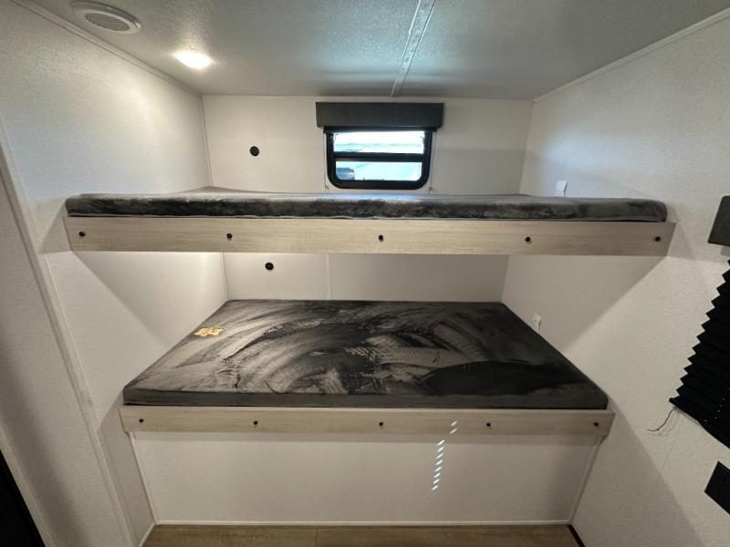 If you're looking for more space, this double axle, double slide out unit is perfect for your group of eight. Within the large slide in the living room, you'll find the booth dinette and sofa, which sit across from the optional TV if you want to enjoy movie nights. The full kitchen includes a microwave and three burner cooktop to make meals, plus a pantry and 12V refrigerator for food storage. And an optional outside mini kitchen with a grill can be added if you enjoy cooking outdoors! Your guests or littles are sure to enjoy the rear private bunkhouse that features a set of 38" x 76" bunks across from the third bunk and jiffy sofa within a slide out!