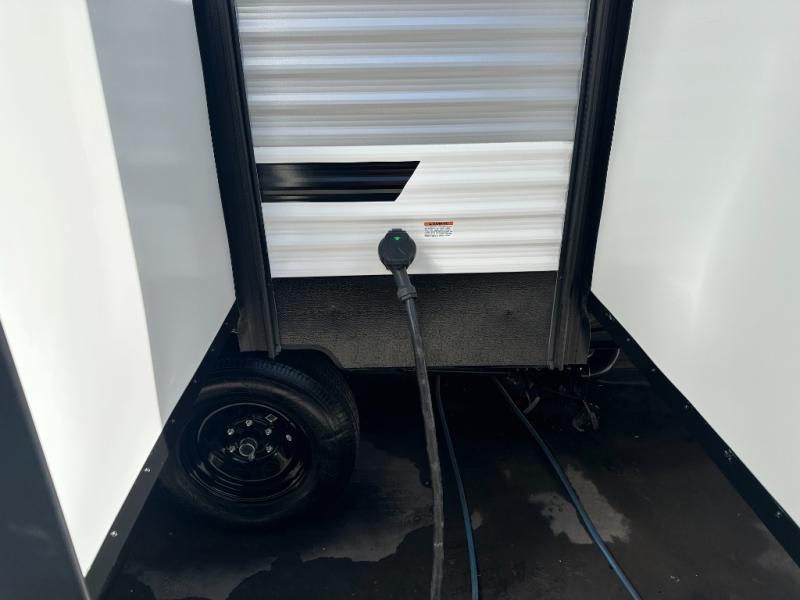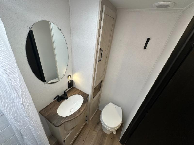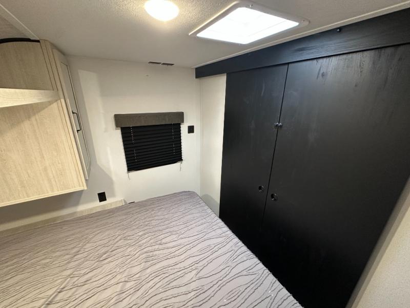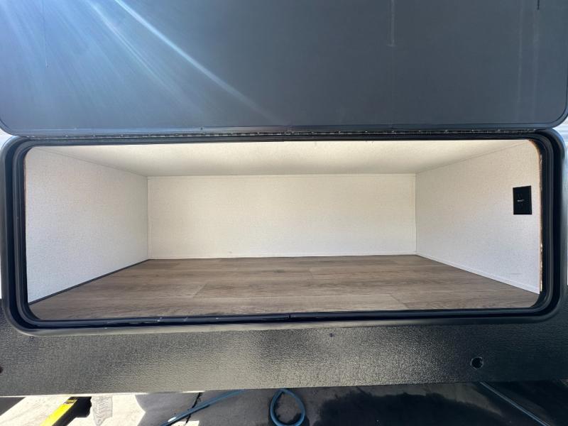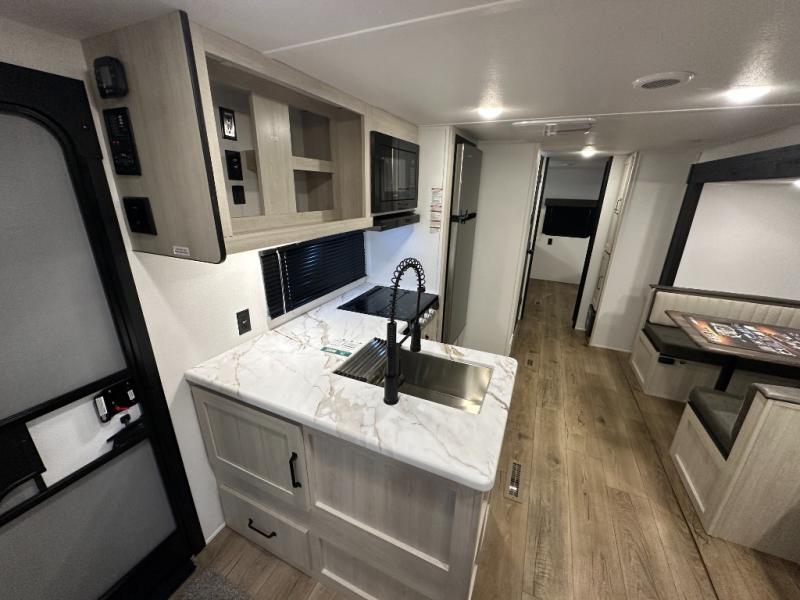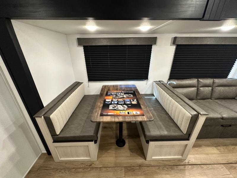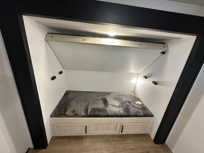 If you're looking for more space, this double axle, double slide out unit is perfect for your group of eight. Within the large slide in the living room, you'll find the booth dinette and sofa, which sit across from the optional TV if you want to enjoy movie nights. The full kitchen includes a microwave and three burner cooktop to make meals, plus a pantry and 12V refrigerator for food storage. And an optional outside mini kitchen with a grill can be added if you enjoy cooking outdoors! Your guests or littles are sure to enjoy the rear private bunkhouse that features a set of 38" x 76" bunks across from the third bunk and jiffy sofa within a slide out!