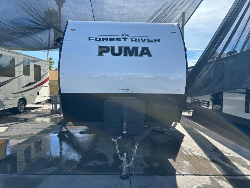 The Puma Camping Edition by Forest River offer an affordable travel trailer for rookie campers or seasoned RVers! They are built with 5/8" tongue and groove plywood flooring and a front diamond plate for added protection. There are also exterior magnetic baggage door latches, back up camera prep, a battery disconnect. Head inside to find Thermofoil countertops with a smooth drop edge, bedroom USB ports and outlets, and pleated shades in the living room.