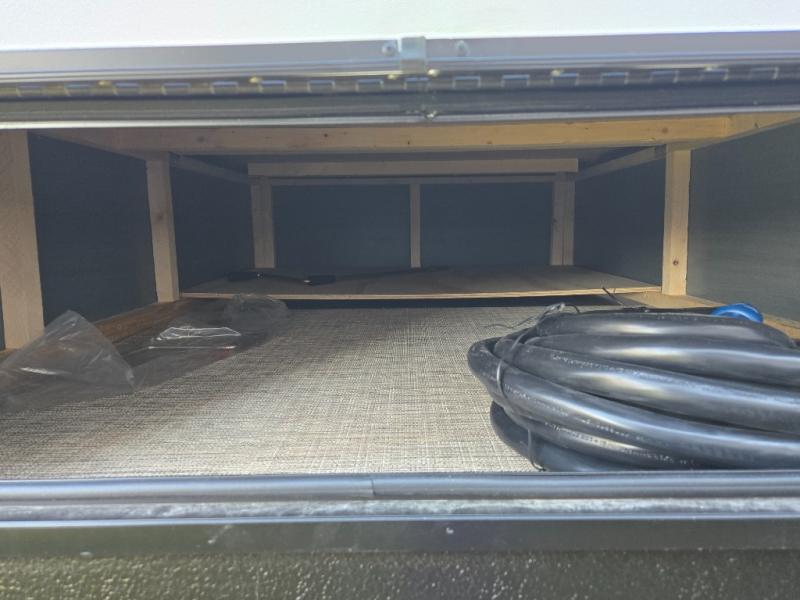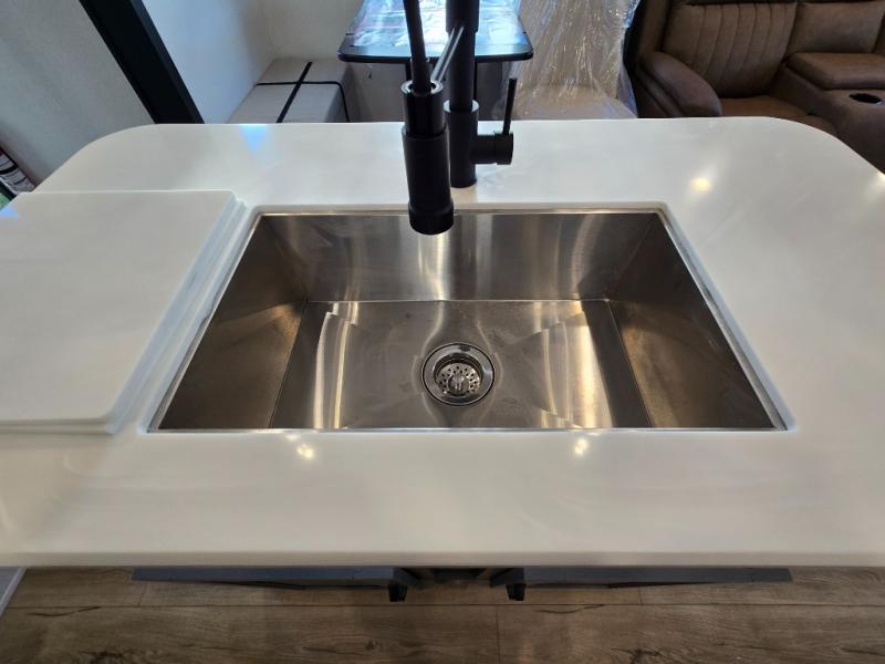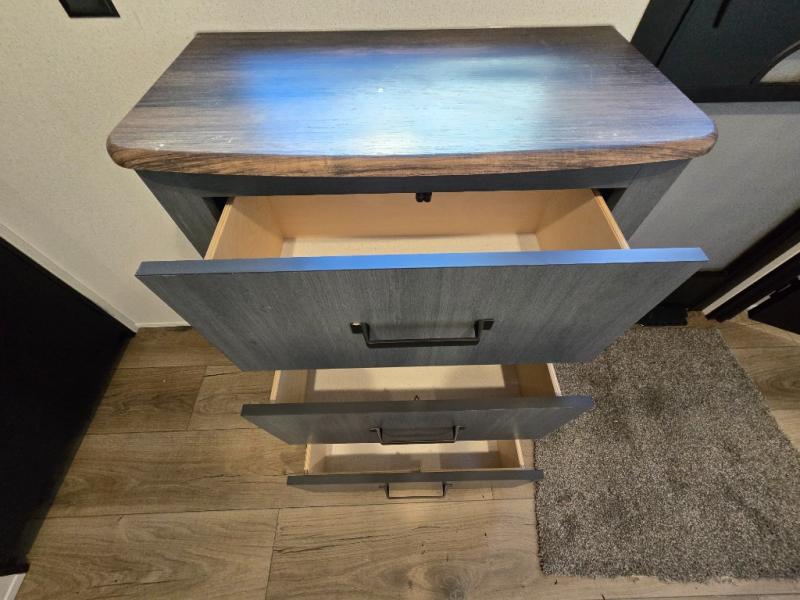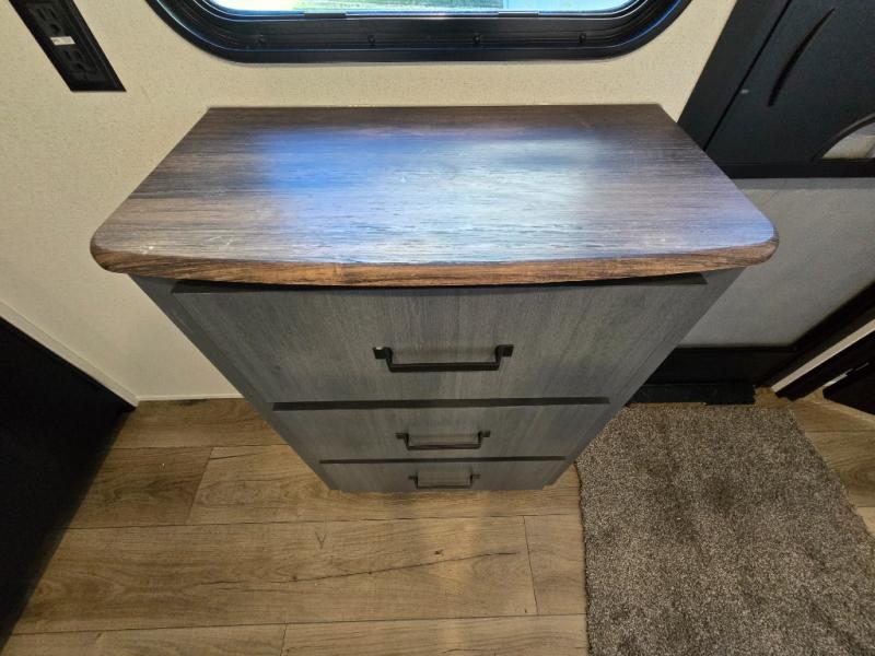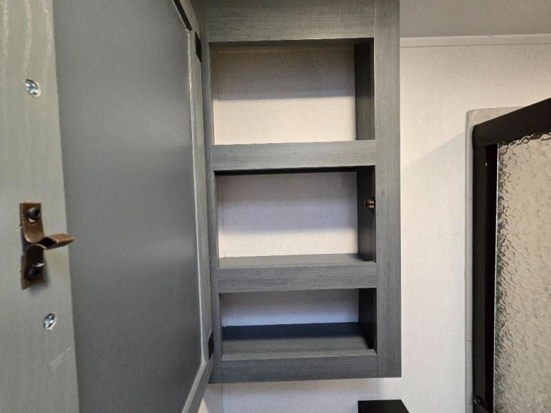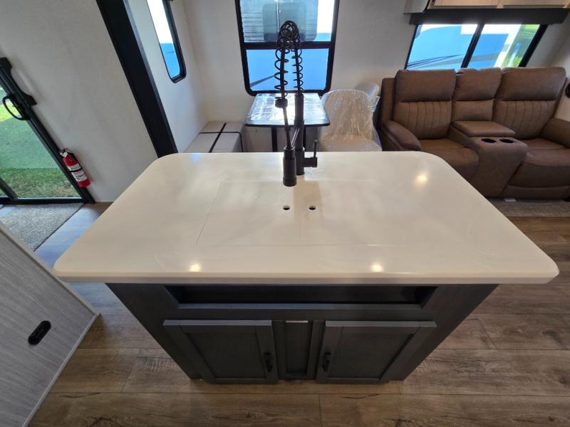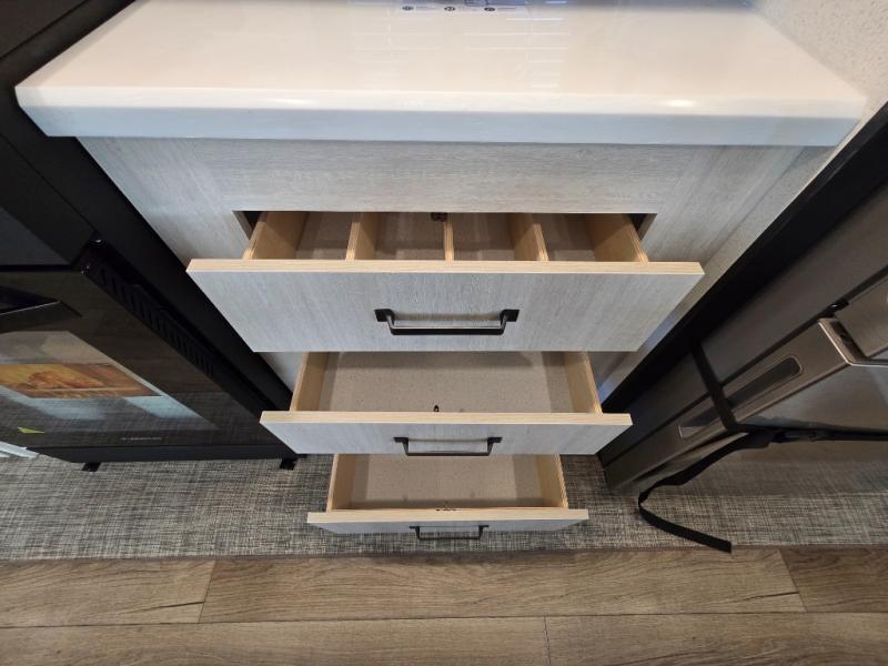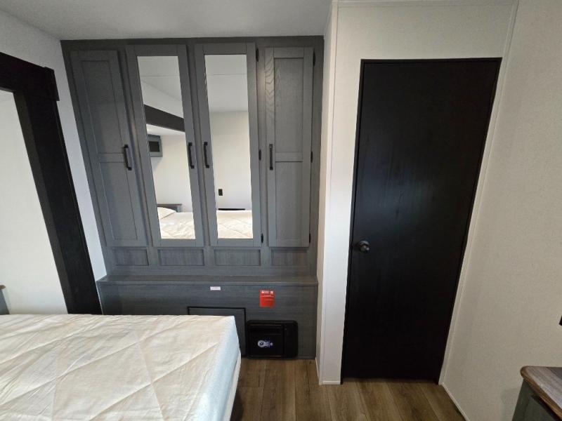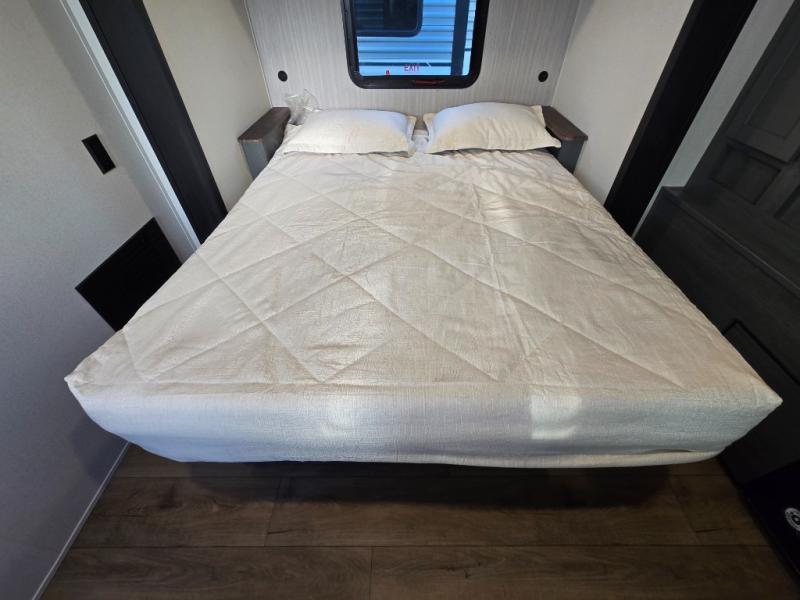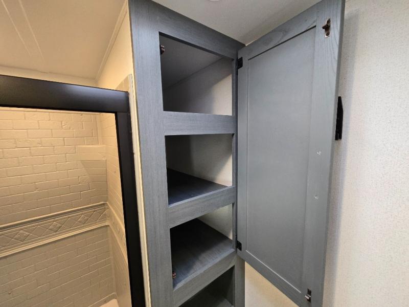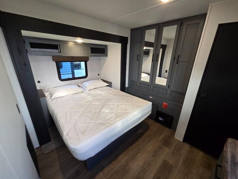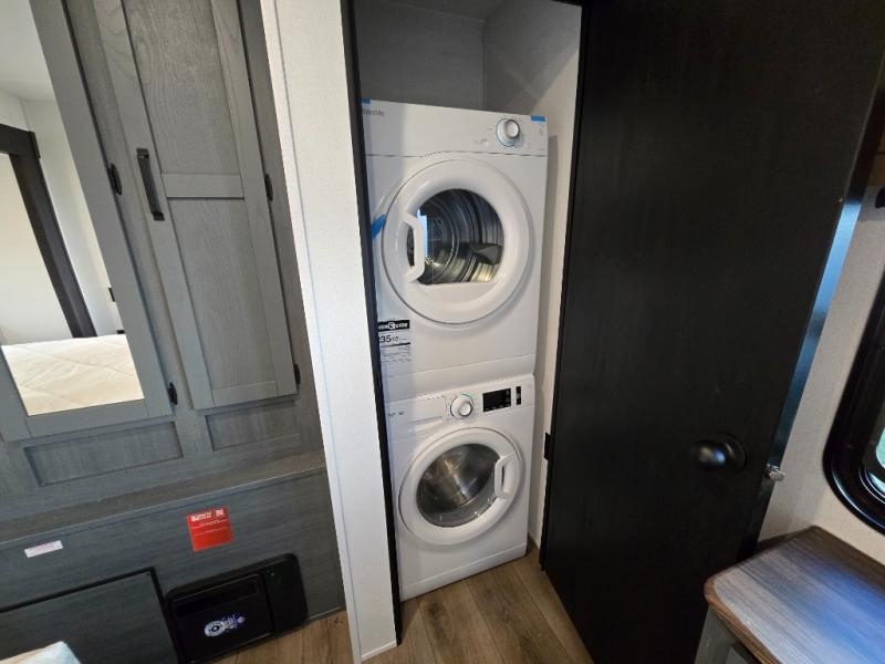 At the front of the trailer, you’ll find a private queen bed slide-out surrounded by ample storage, including dual closets, a dresser, and even washer/dryer prep for extended-stay convenience. The full bathroom, located centrally for easy access, offers residential comfort and practicality.