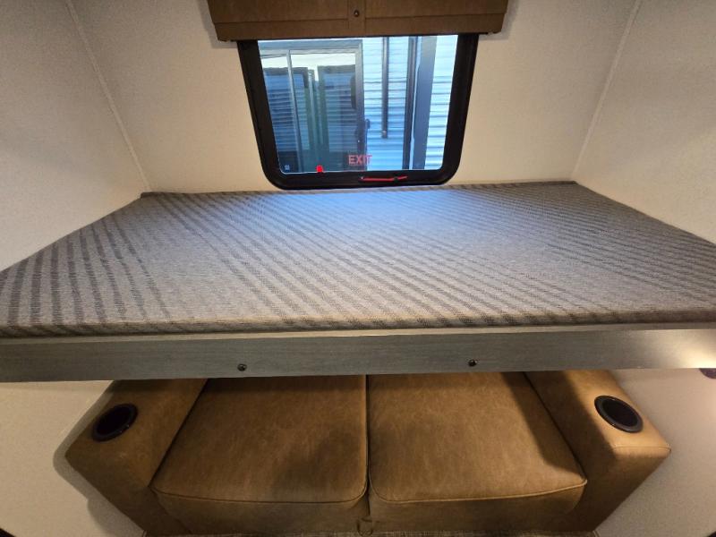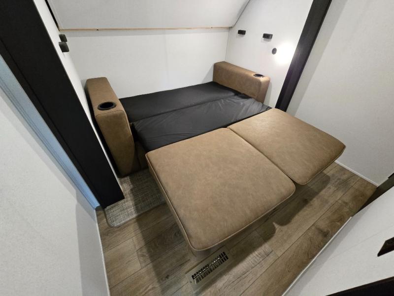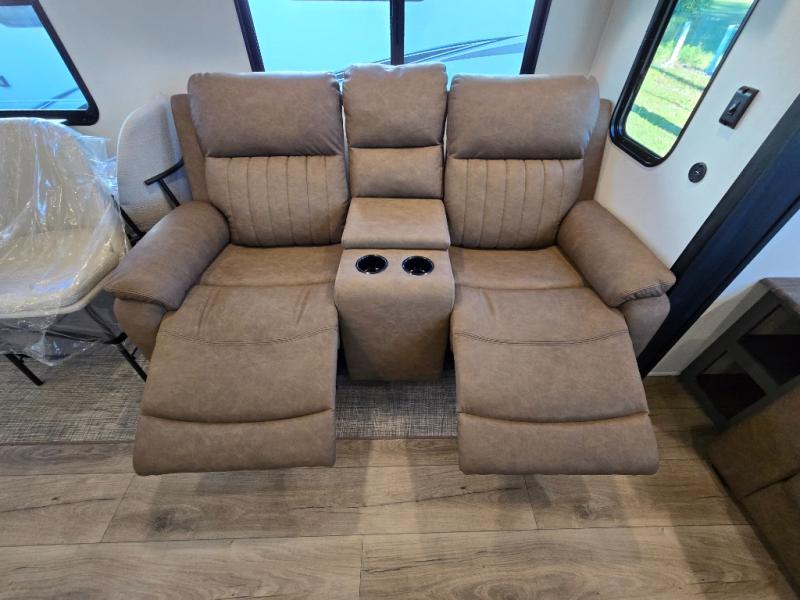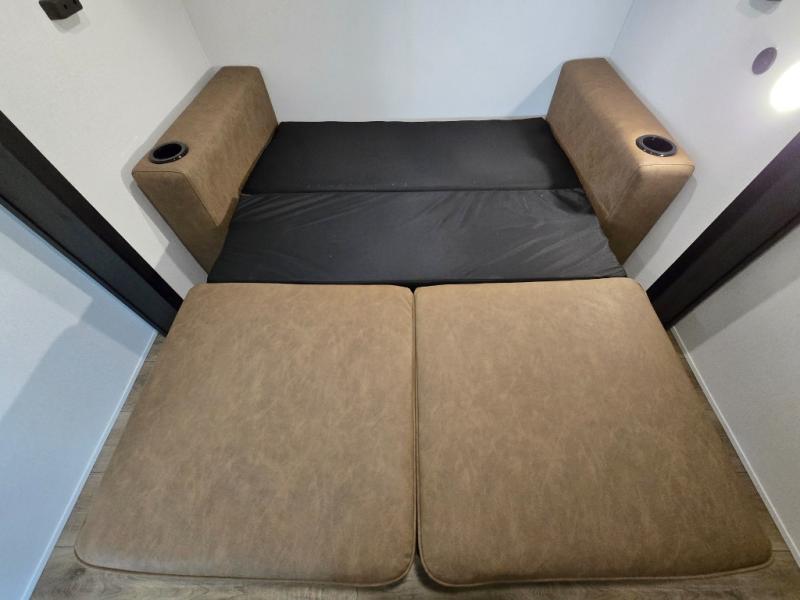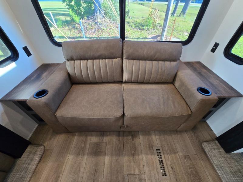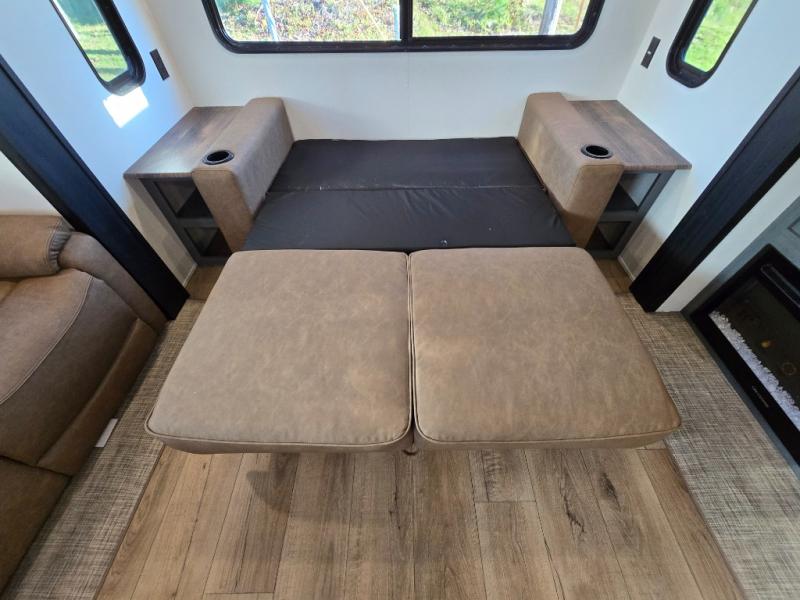 At the rear of the trailer, you’ll love the open-concept living and kitchen area, designed for both relaxation and entertaining. Dual opposing slides provide an expansive feel, surrounding the kitchen island and walk-in pantry. The chef in your group will appreciate the residential-style refrigerator, three-burner cooktop, and plenty of countertop space. After dinner, unwind in one of the two recliners, at the booth dinette, or on the sofa for a cozy evening indoors.