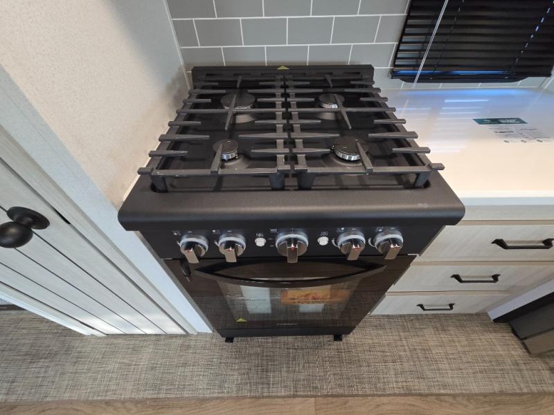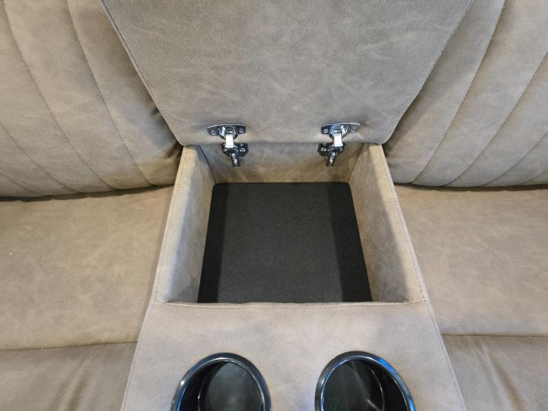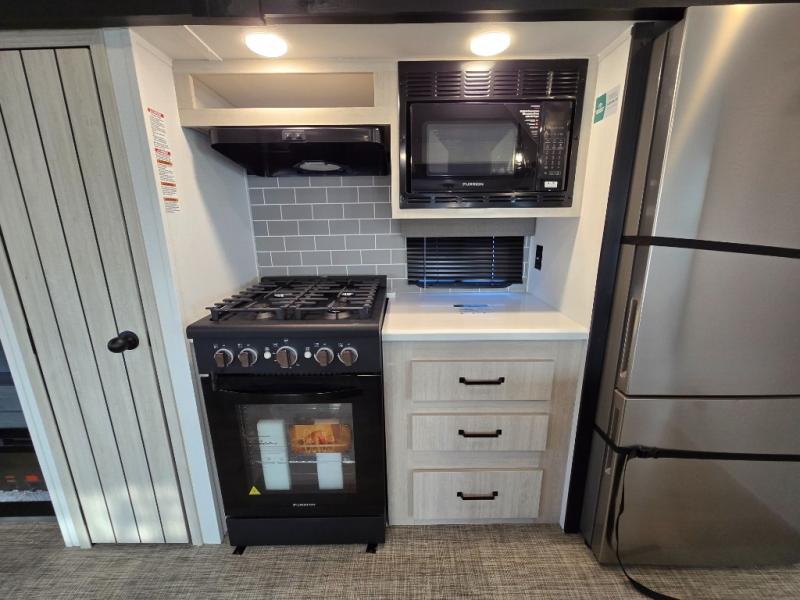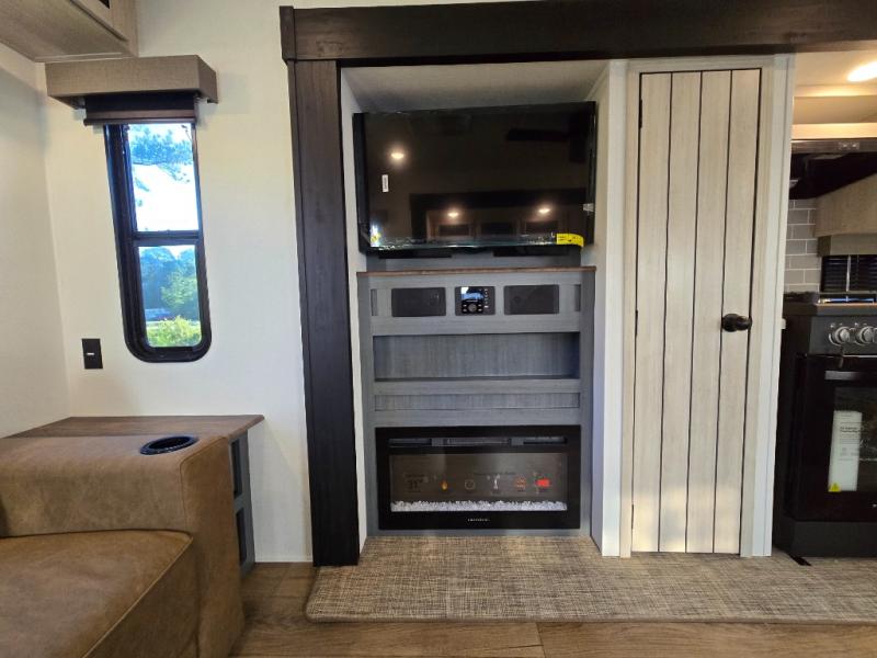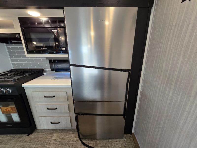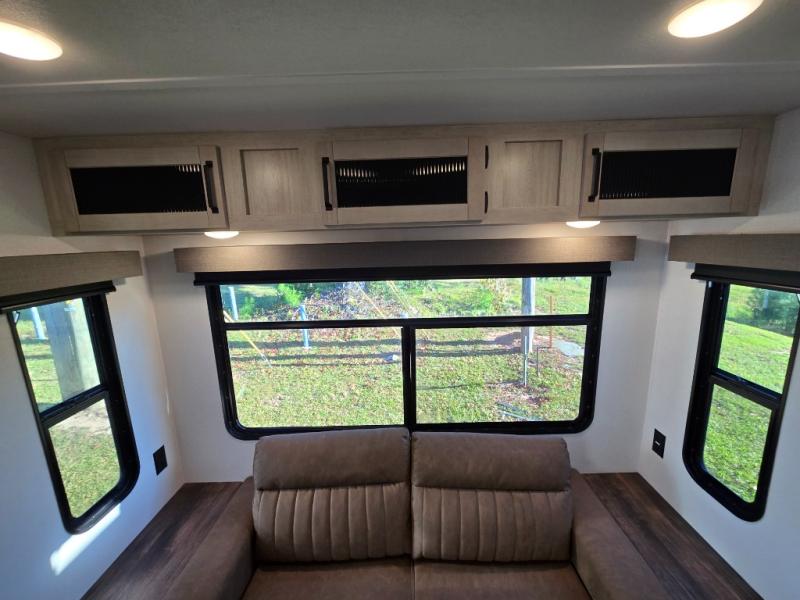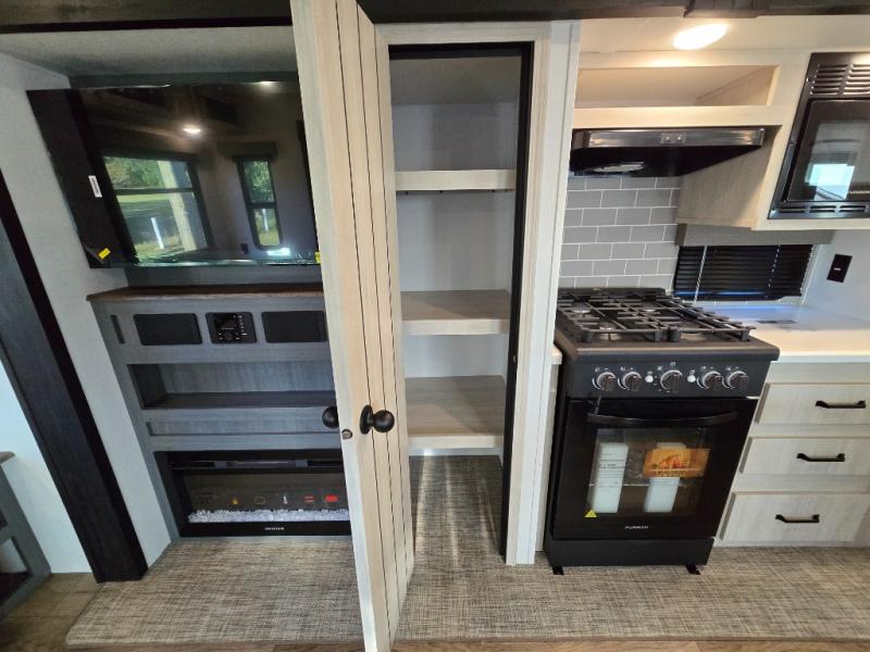 At the rear of the trailer, you’ll love the open-concept living and kitchen area, designed for both relaxation and entertaining. Dual opposing slides provide an expansive feel, surrounding the kitchen island and walk-in pantry. The chef in your group will appreciate the residential-style refrigerator, three-burner cooktop, and plenty of countertop space. After dinner, unwind in one of the two recliners, at the booth dinette, or on the sofa for a cozy evening indoors.