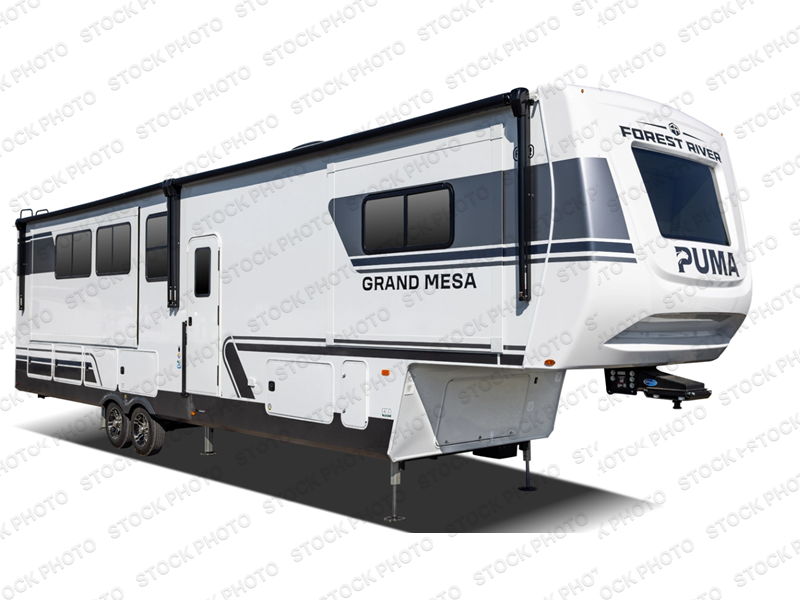 With the Puma Grand Mesa fifth wheel by Forest River, you will love the practical living, ample storage, the optimum towability, and the lavish style found throughout! There is a 7' interior height and a 101" wide body for added space, plus large, tinted windows throughout, worry-free composite floors, and vacuum bonded walls with Azdel for durability. The mandatory River Package includes features such as an upgraded suspension, a screenless operating system with Bluetooth, and three A/C units to keep you comfortable. These fifth wheels also include the mandatory Ranch Package that comes with a stainless-steel appliance package, day/night roller shades, a fiberglass shower surround, plus residential style dinette chairs. There are many more features to love about the Puma Grand Mesa fifth wheels, like the upgraded true solid surface countertops, the mirrored sliding closet doors, and the two-tone painted front cap!