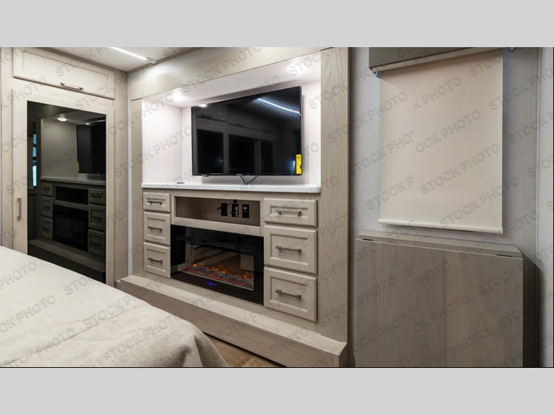 You will love every minute spent in this unique fifth wheel! As you enter the unit, you'll find a mud room with a bench seat, storage, plus washer and dryer prep. The front master bedroom will be your own oasis each day since there is an office space with a desk slide out and a hallway that leads to the front bedroom. Here, you'll find a king bed slide, a front bench, plus a slide out with a TV, fireplace and wardrobe; how convenient! When you've worked up an appetite, the rear kitchen includes everything you need to make home-cooked meals, along with a bar top that overlooks the living room, a spacious pantry, and a table with chairs to dine at. You can spend your evenings relaxing on the L-lounge by the entertainment center with a fireplace, or you can head outdoors to sit under the 19' power awning with LED lights!