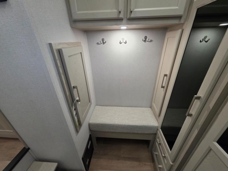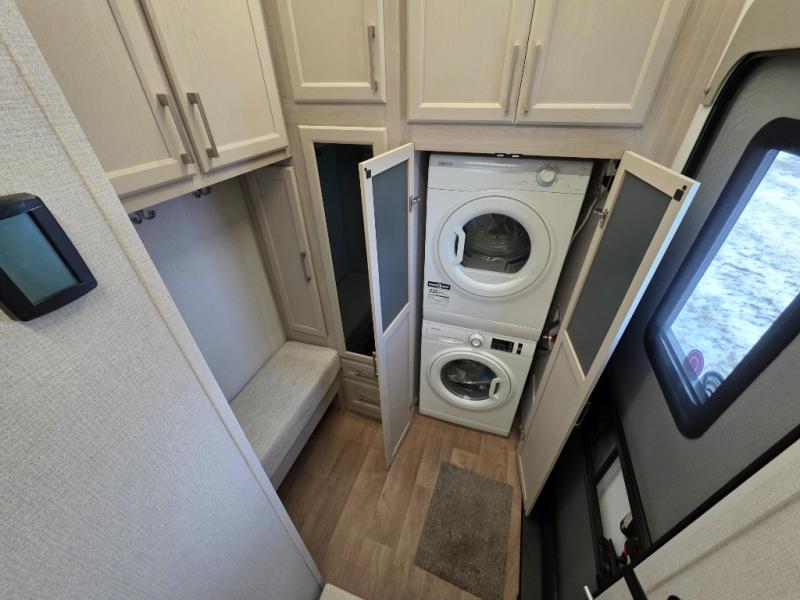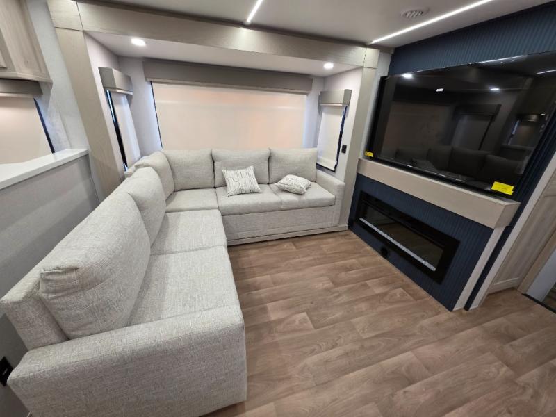 You will love every minute spent in this unique fifth wheel! As you enter the unit, you'll find a mud room with a bench seat, storage, plus washer and dryer prep. The front master bedroom will be your own oasis each day since there is an office space with a desk slide out and a hallway that leads to the front bedroom. Here, you'll find a king bed slide, a front bench, plus a slide out with a TV, fireplace and wardrobe; how convenient! When you've worked up an appetite, the rear kitchen includes everything you need to make home-cooked meals, along with a bar top that overlooks the living room, a spacious pantry, and a table with chairs to dine at. You can spend your evenings relaxing on the L-lounge by the entertainment center with a fireplace, or you can head outdoors to sit under the 19' power awning with LED lights!