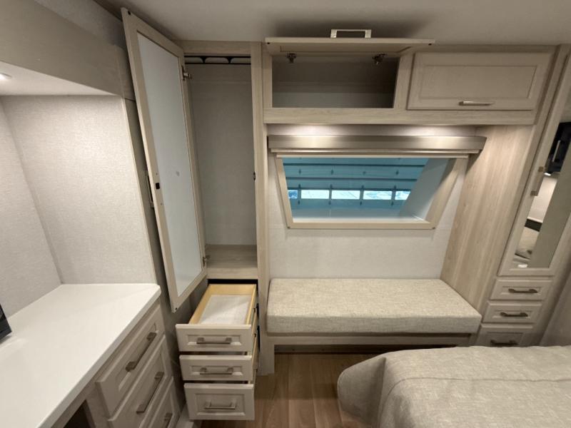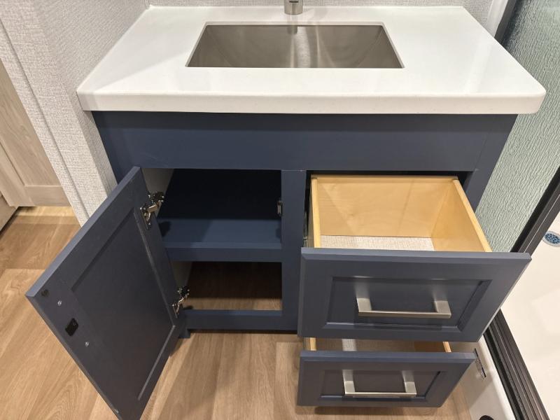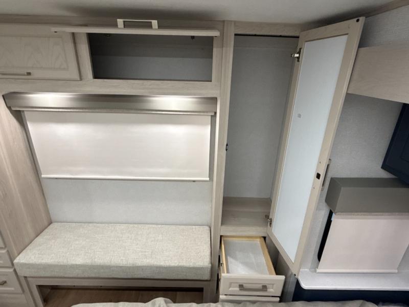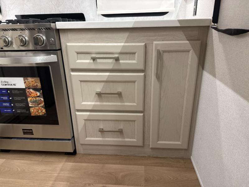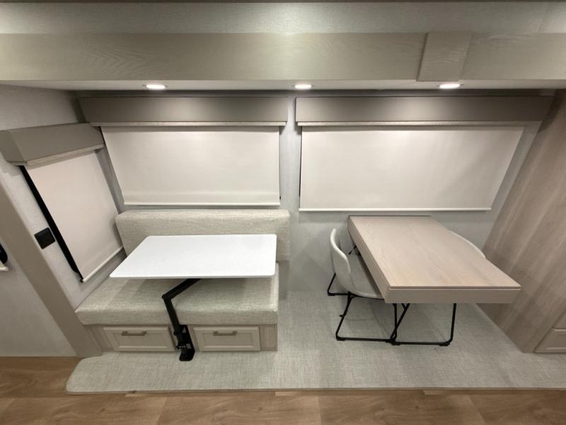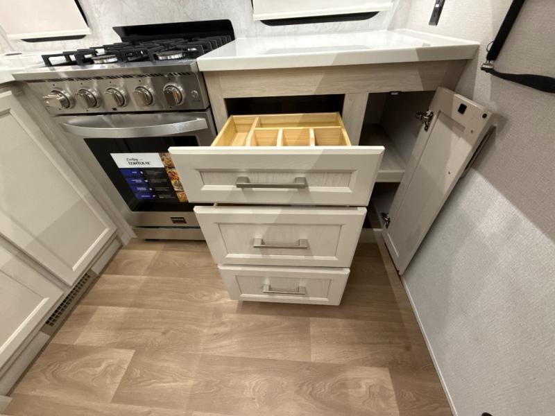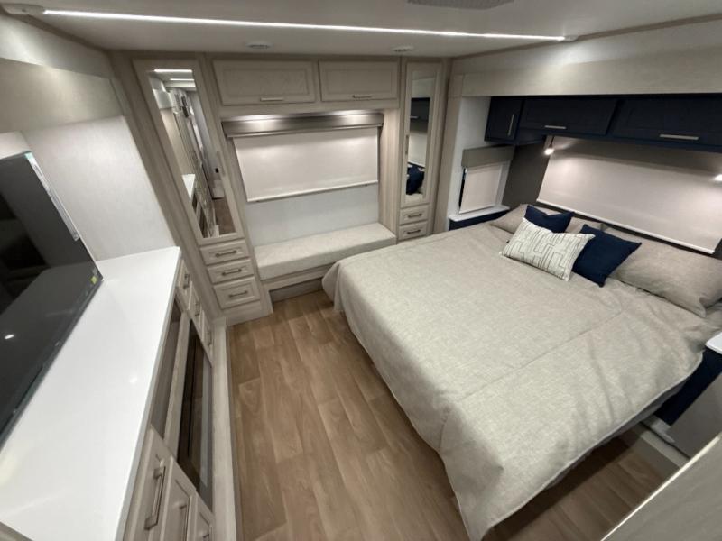 With the Puma Grand Mesa fifth wheel by Forest River, you will love the practical living, ample storage, the optimum towability, and the lavish style found throughout! There is a 7' interior height and a 101" wide body for added space, plus large, tinted windows throughout, worry-free composite floors, and vacuum bonded walls with Azdel for durability. The mandatory River Package includes features such as an upgraded suspension, a screenless operating system with Bluetooth, and three A/C units to keep you comfortable. These fifth wheels also include the mandatory Ranch Package that comes with a stainless-steel appliance package, day/night roller shades, a fiberglass shower surround, plus residential style dinette chairs. There are many more features to love about the Puma Grand Mesa fifth wheels, like the upgraded true solid surface countertops, the mirrored sliding closet doors, and the two-tone painted front cap!