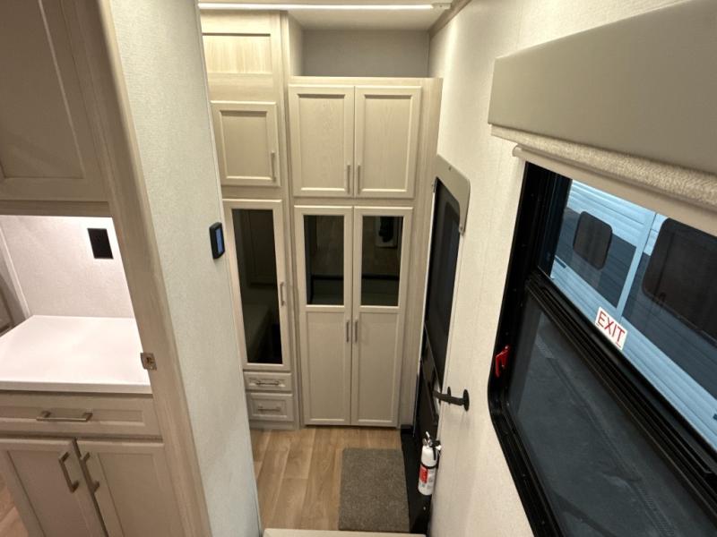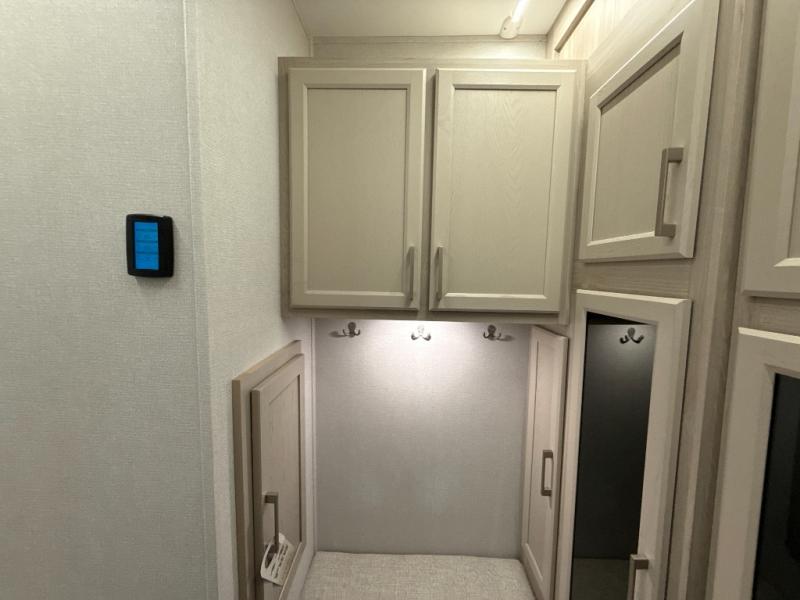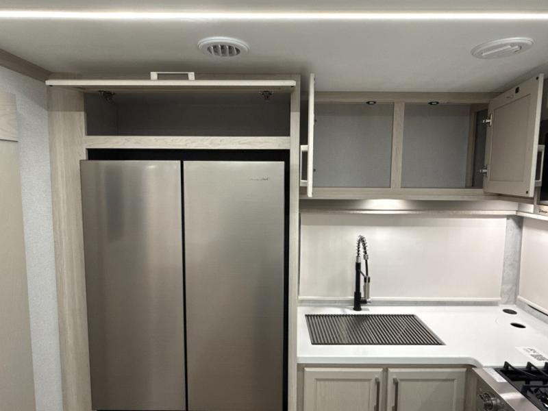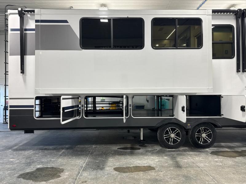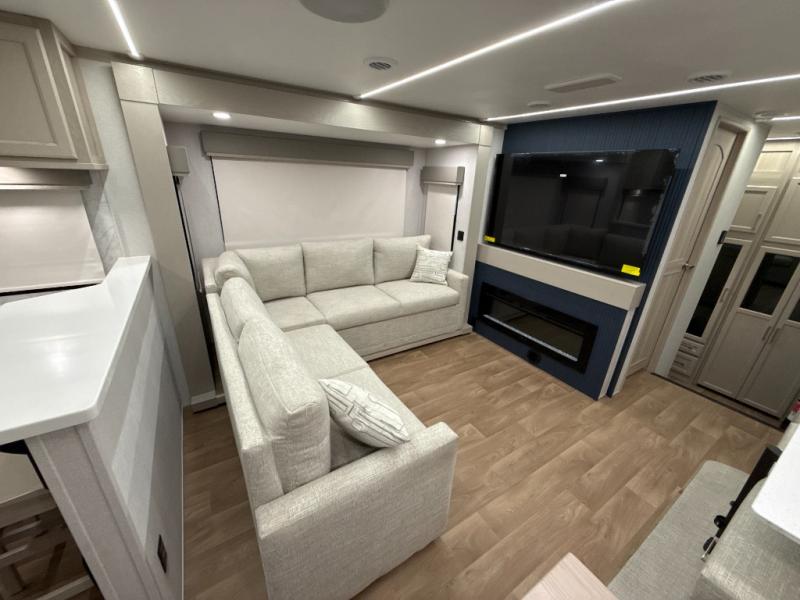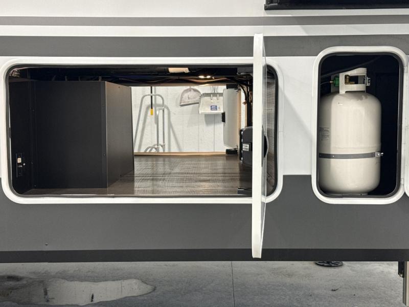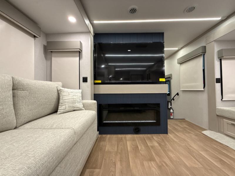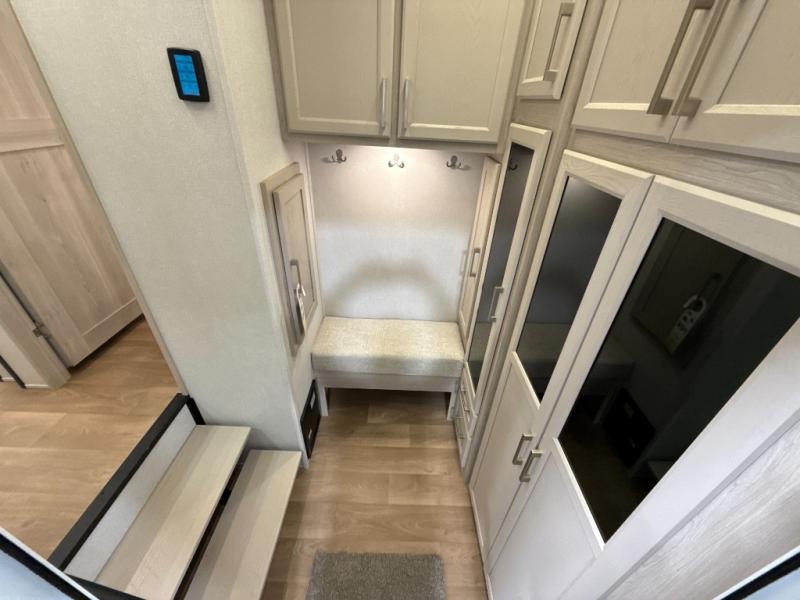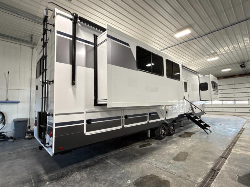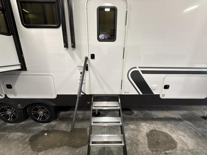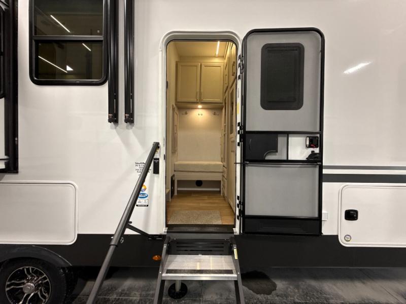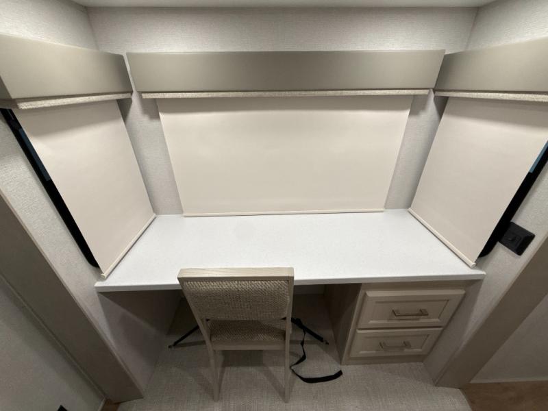 You will love every minute spent in this unique fifth wheel! As you enter the unit, you'll find a mud room with a bench seat, storage, plus washer and dryer prep. The front master bedroom will be your own oasis each day since there is an office space with a desk slide out and a hallway that leads to the front bedroom. Here, you'll find a king bed slide, a front bench, plus a slide out with a TV, fireplace and wardrobe; how convenient! When you've worked up an appetite, the rear kitchen includes everything you need to make home-cooked meals, along with a bar top that overlooks the living room, a spacious pantry, and a table with chairs to dine at. You can spend your evenings relaxing on the L-lounge by the entertainment center with a fireplace, or you can head outdoors to sit under the 19' power awning with LED lights!