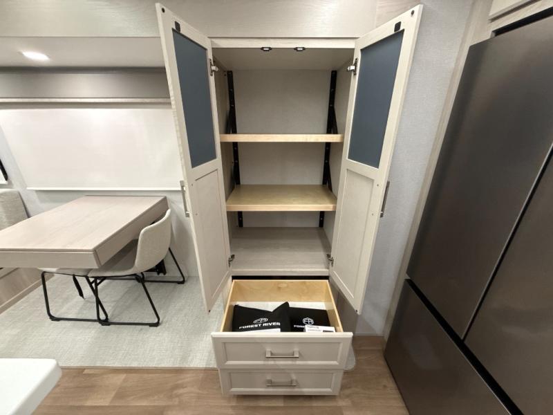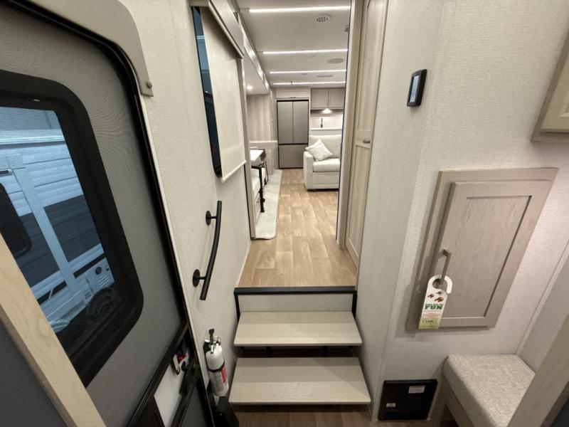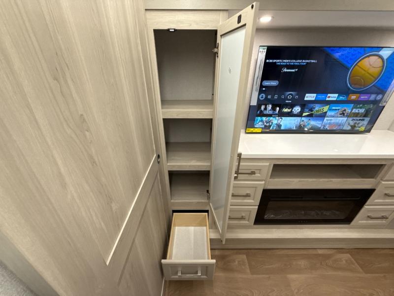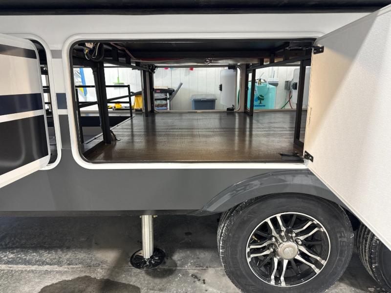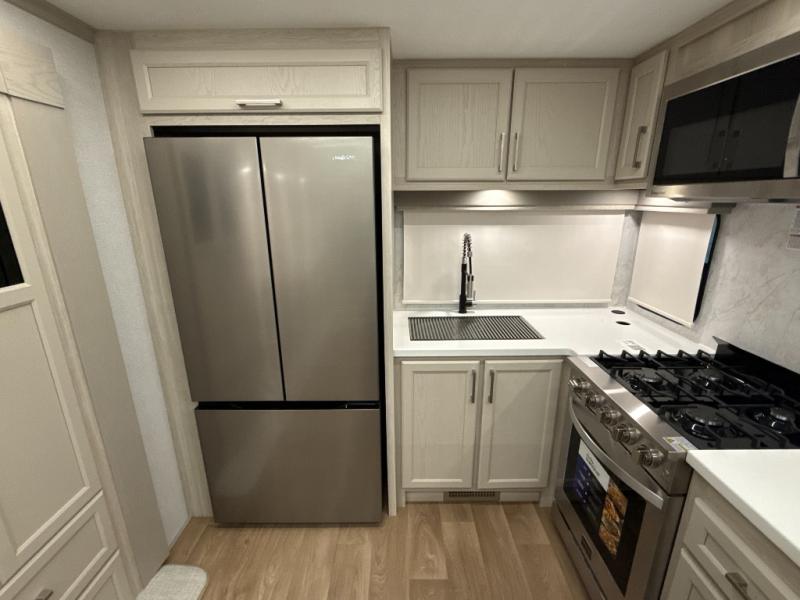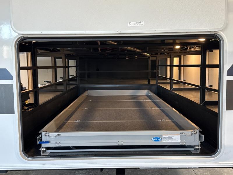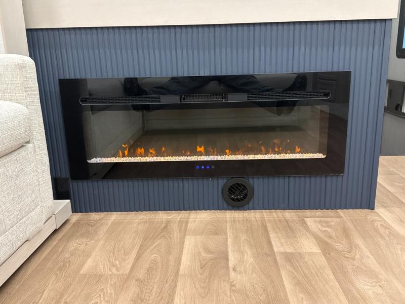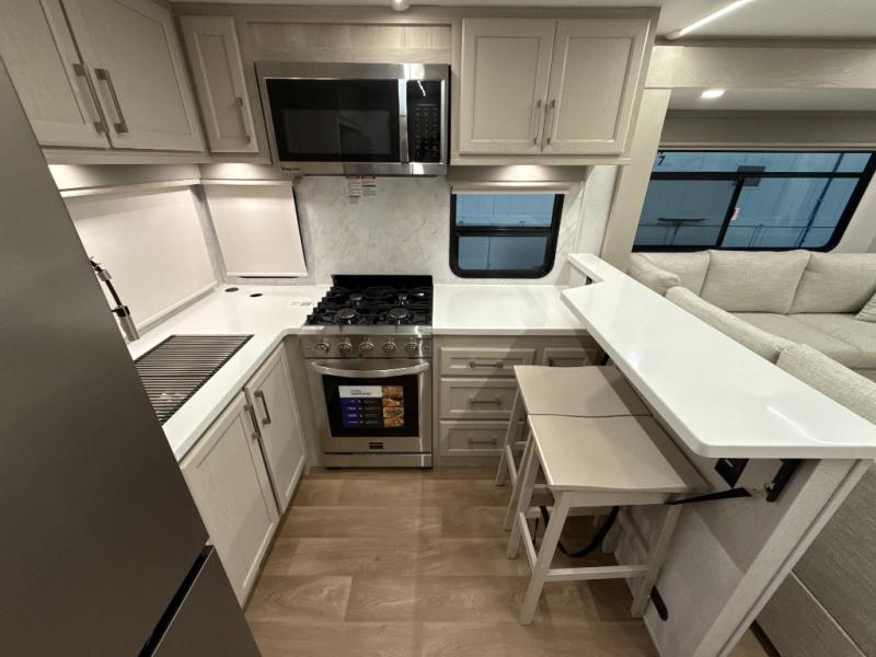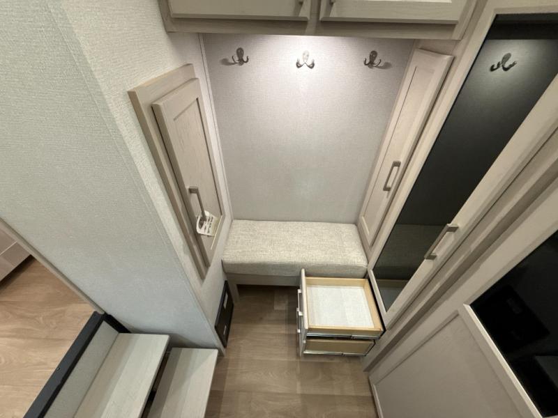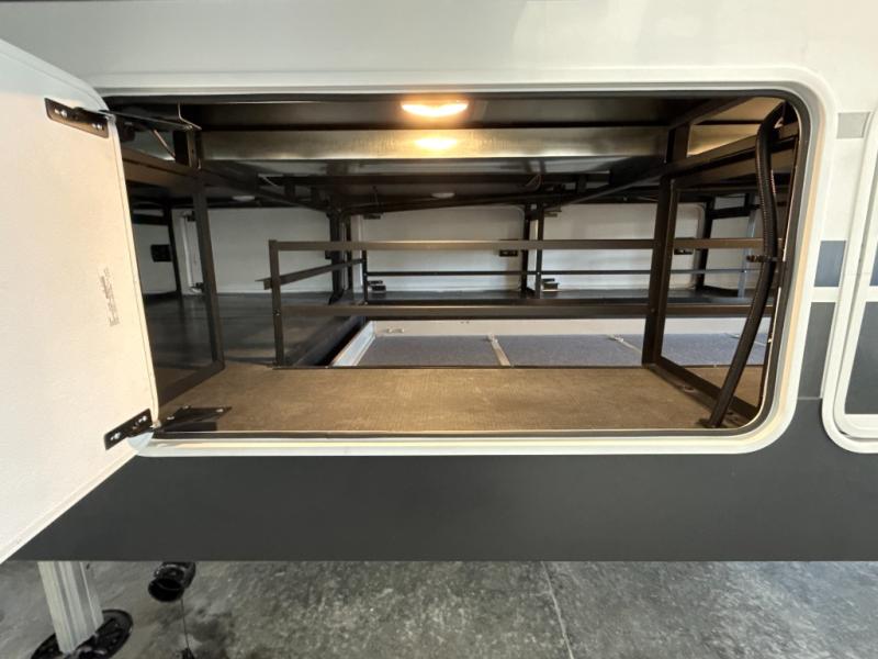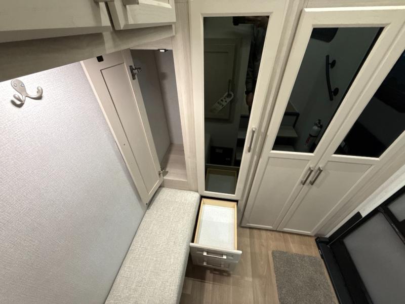 You will love every minute spent in this unique fifth wheel! As you enter the unit, you'll find a mud room with a bench seat, storage, plus washer and dryer prep. The front master bedroom will be your own oasis each day since there is an office space with a desk slide out and a hallway that leads to the front bedroom. Here, you'll find a king bed slide, a front bench, plus a slide out with a TV, fireplace and wardrobe; how convenient! When you've worked up an appetite, the rear kitchen includes everything you need to make home-cooked meals, along with a bar top that overlooks the living room, a spacious pantry, and a table with chairs to dine at. You can spend your evenings relaxing on the L-lounge by the entertainment center with a fireplace, or you can head outdoors to sit under the 19' power awning with LED lights!