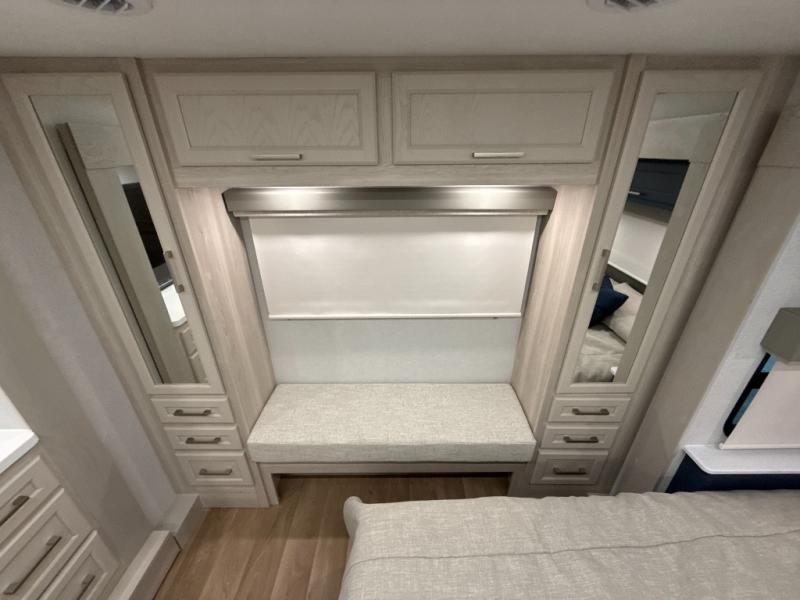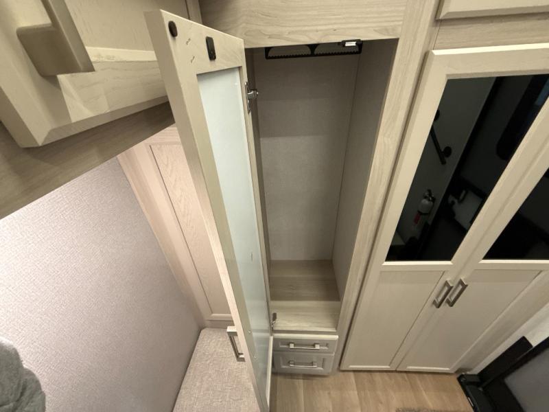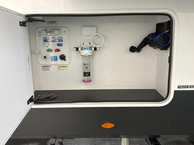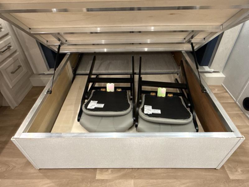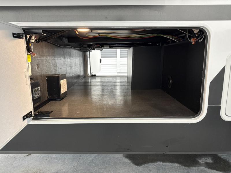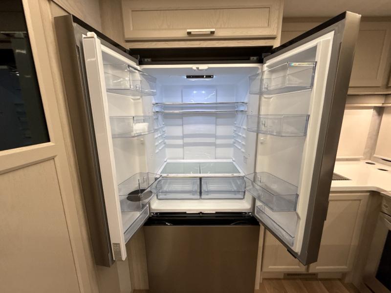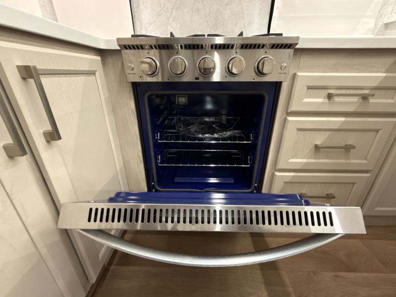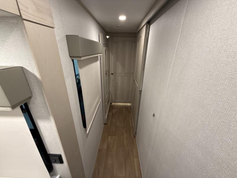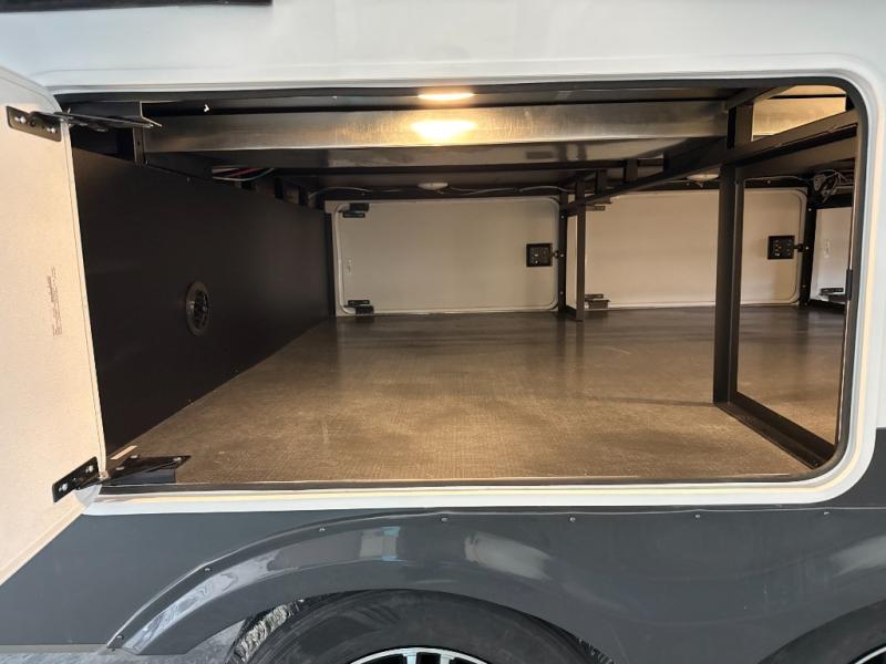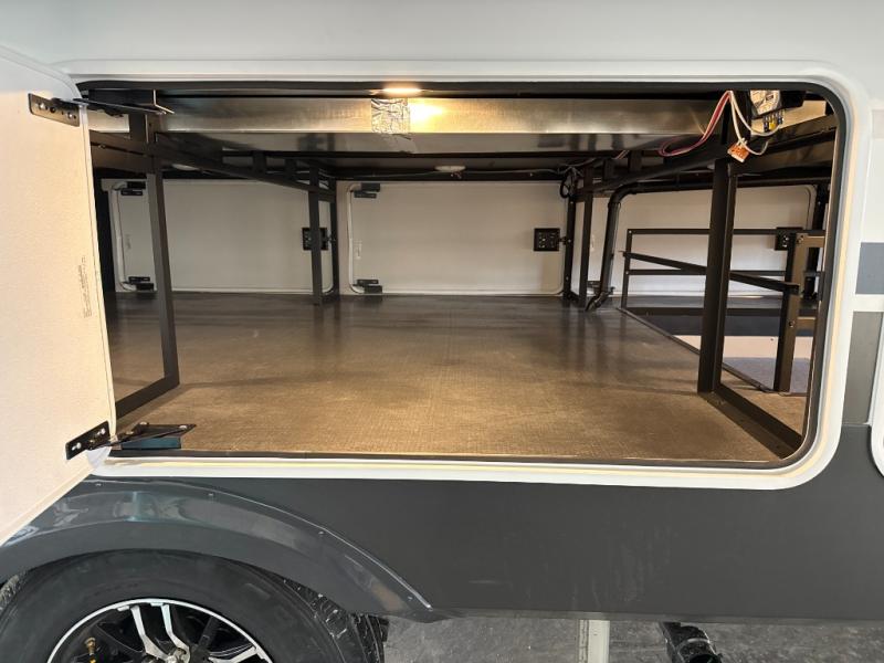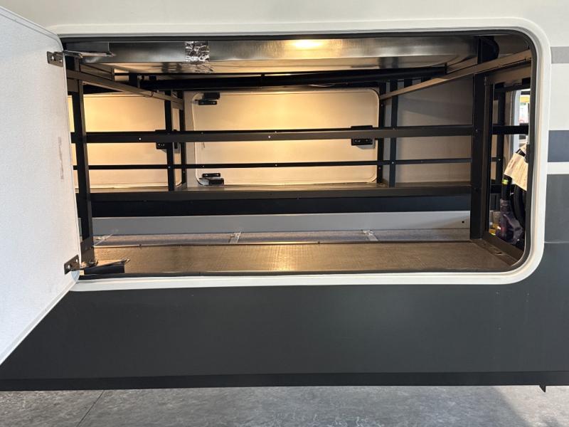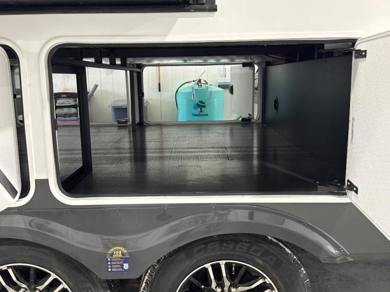 You will love every minute spent in this unique fifth wheel! As you enter the unit, you'll find a mud room with a bench seat, storage, plus washer and dryer prep. The front master bedroom will be your own oasis each day since there is an office space with a desk slide out and a hallway that leads to the front bedroom. Here, you'll find a king bed slide, a front bench, plus a slide out with a TV, fireplace and wardrobe; how convenient! When you've worked up an appetite, the rear kitchen includes everything you need to make home-cooked meals, along with a bar top that overlooks the living room, a spacious pantry, and a table with chairs to dine at. You can spend your evenings relaxing on the L-lounge by the entertainment center with a fireplace, or you can head outdoors to sit under the 19' power awning with LED lights!