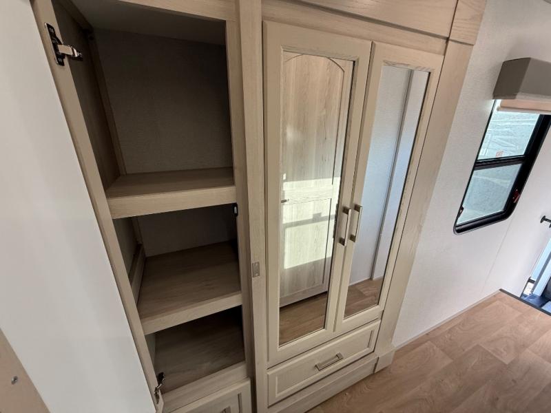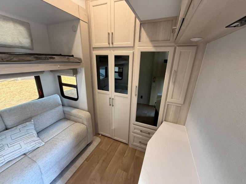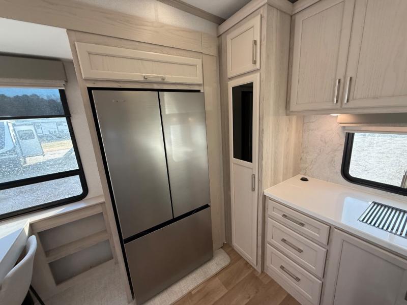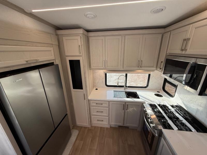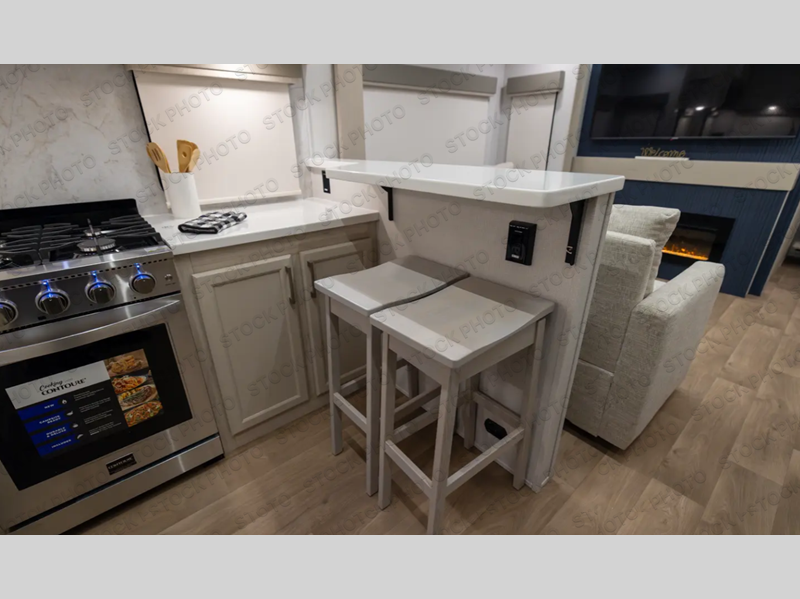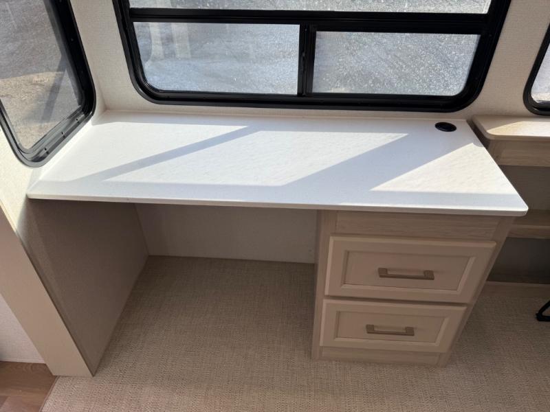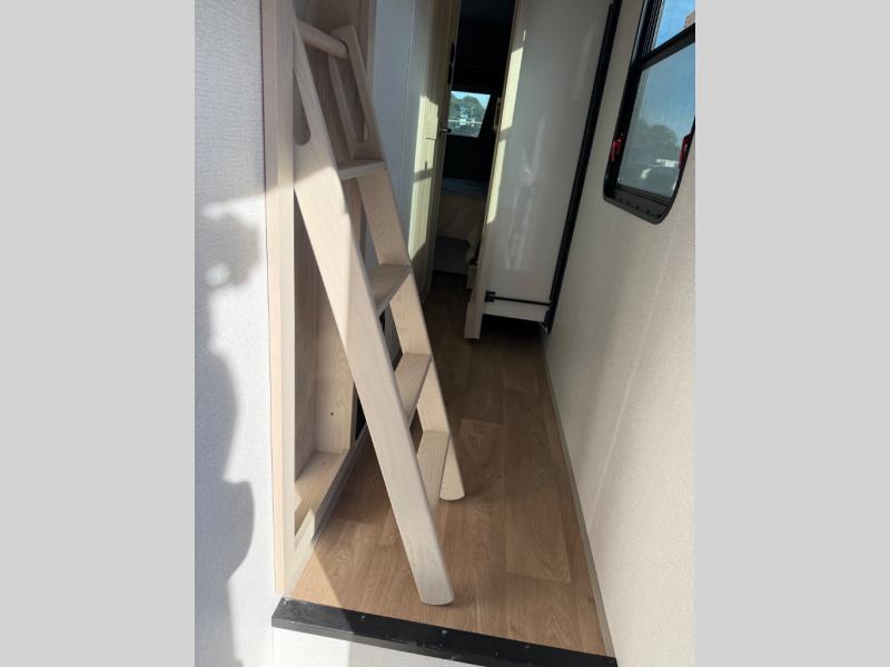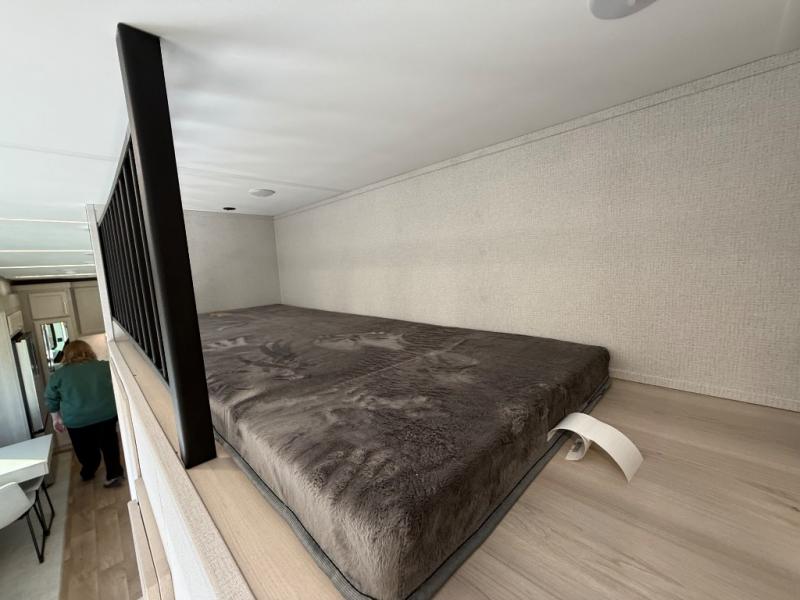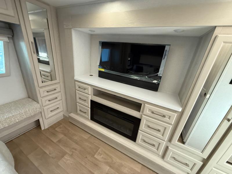If you enjoy camping with a large group of family or friends, this fifth wheel will be perfect for you! There are five slides, giving your crew plenty of space to relax, plus there is a mid-bunk room with a tri-fold sofa, a 30" x 68" bunk, and a desk. And above this room is a 30" x 68" loft for even more sleeping or storage space. You can claim the front private bedroom all to yourselves which includes a king bed, front bench with dual wardrobes, plus a bedroom fireplace and Smart TV. Everyone can enjoy visiting together in the middle living room on the L-lounge by the entertainment center with a second fireplace. There is a table and chairs for dining space, plus a desk with a chair if you need to get some work done. And don't overlook the rear kitchen with a large refrigerator and pantry, all the appliances to make meals, plus ample counter space, including a bar top that overlooks the main living area!