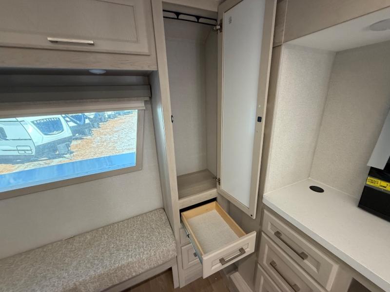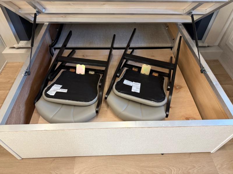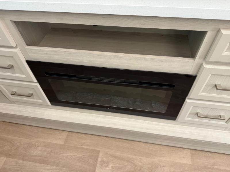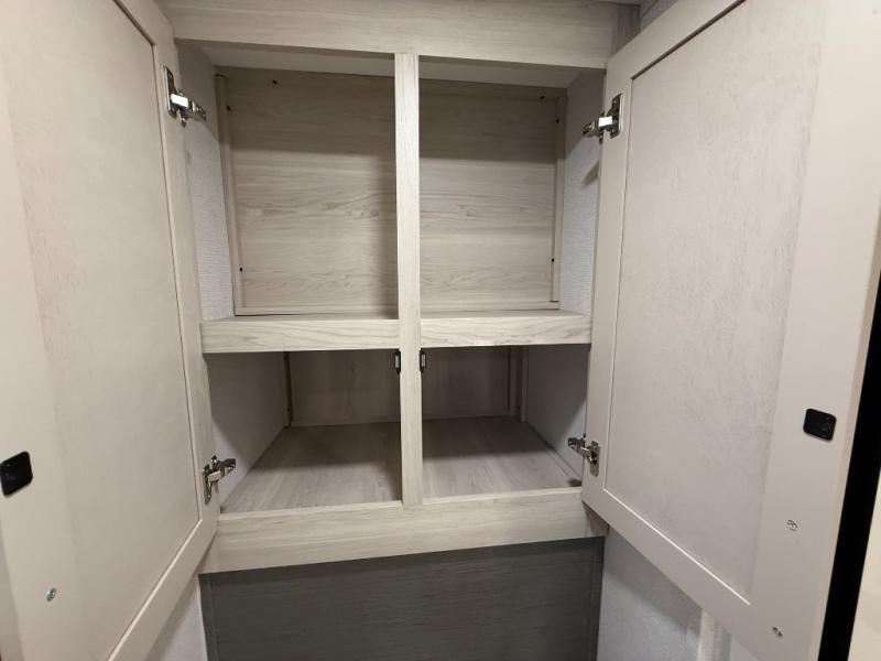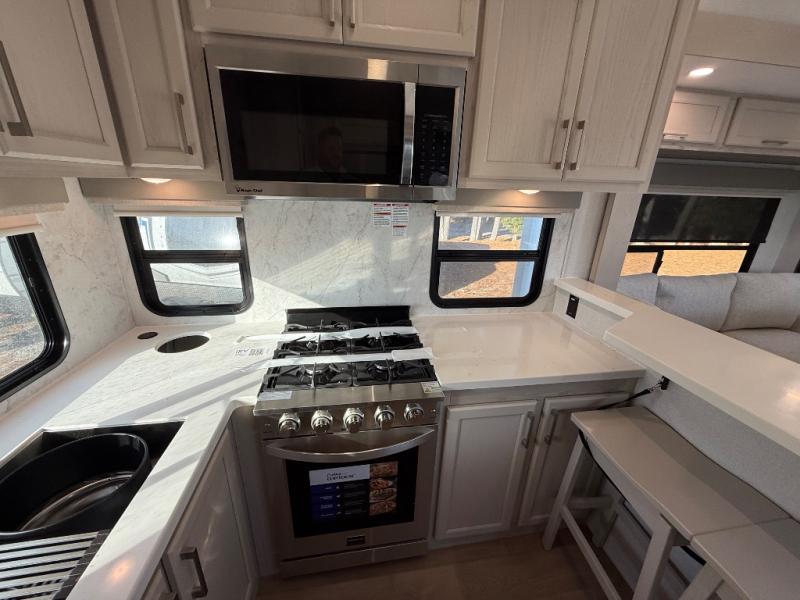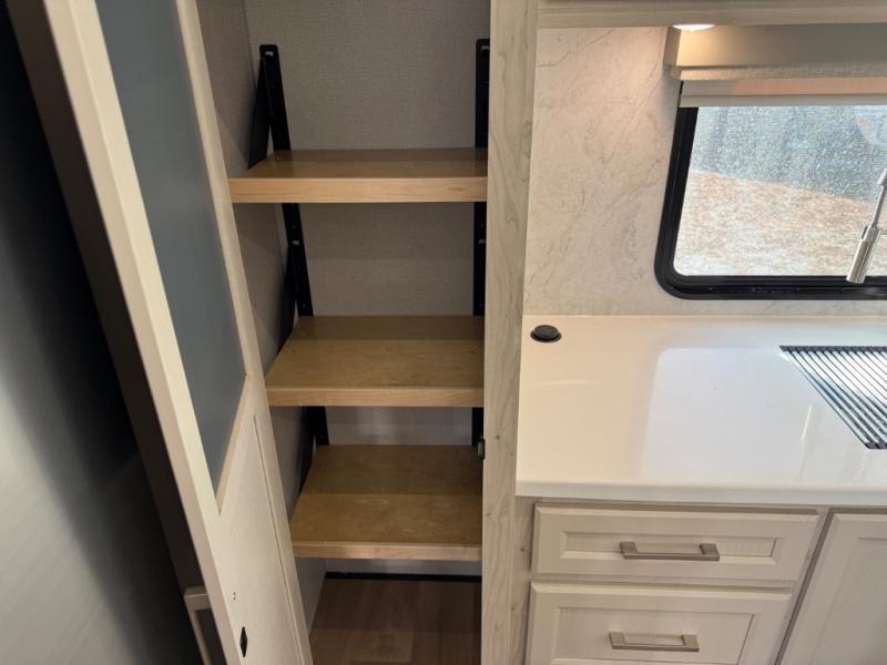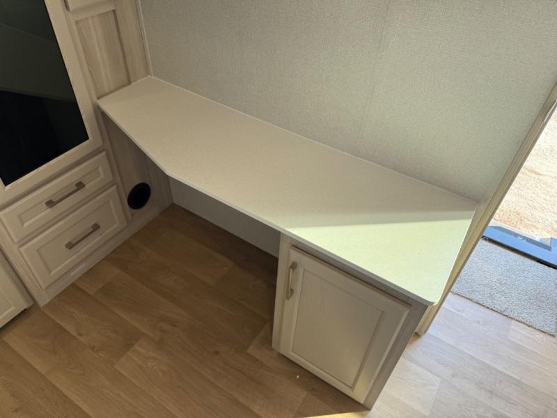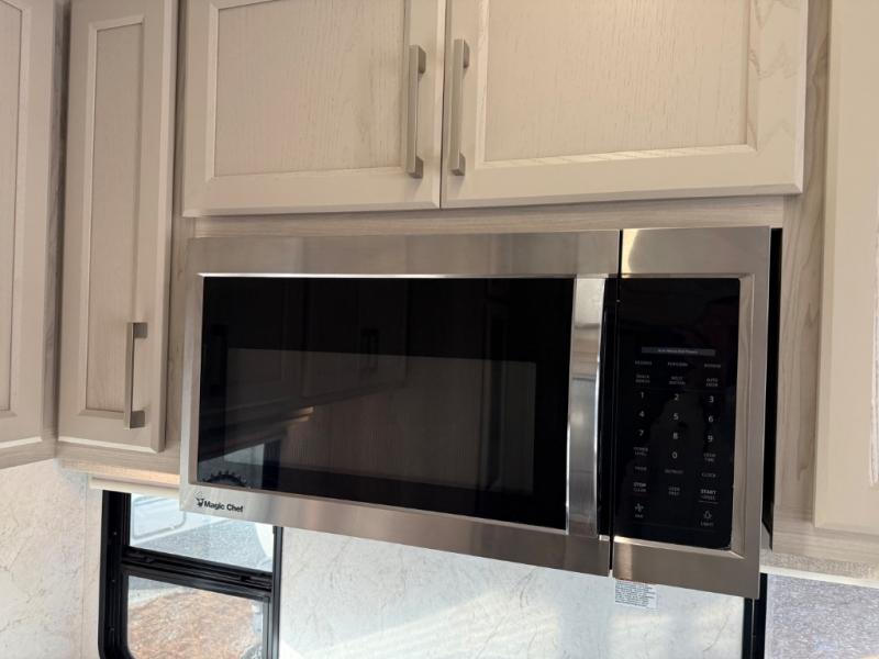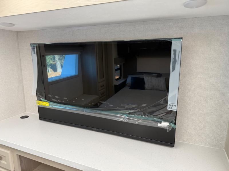 If you enjoy camping with a large group of family or friends, this fifth wheel will be perfect for you! There are five slides, giving your crew plenty of space to relax, plus there is a mid-bunk room with a tri-fold sofa, a 30" x 68" bunk, and a desk. And above this room is a 30" x 68" loft for even more sleeping or storage space. You can claim the front private bedroom all to yourselves which includes a king bed, front bench with dual wardrobes, plus a bedroom fireplace and Smart TV. Everyone can enjoy visiting together in the middle living room on the L-lounge by the entertainment center with a second fireplace. There is a table and chairs for dining space, plus a desk with a chair if you need to get some work done. And don't overlook the rear kitchen with a large refrigerator and pantry, all the appliances to make meals, plus ample counter space, including a bar top that overlooks the main living area!