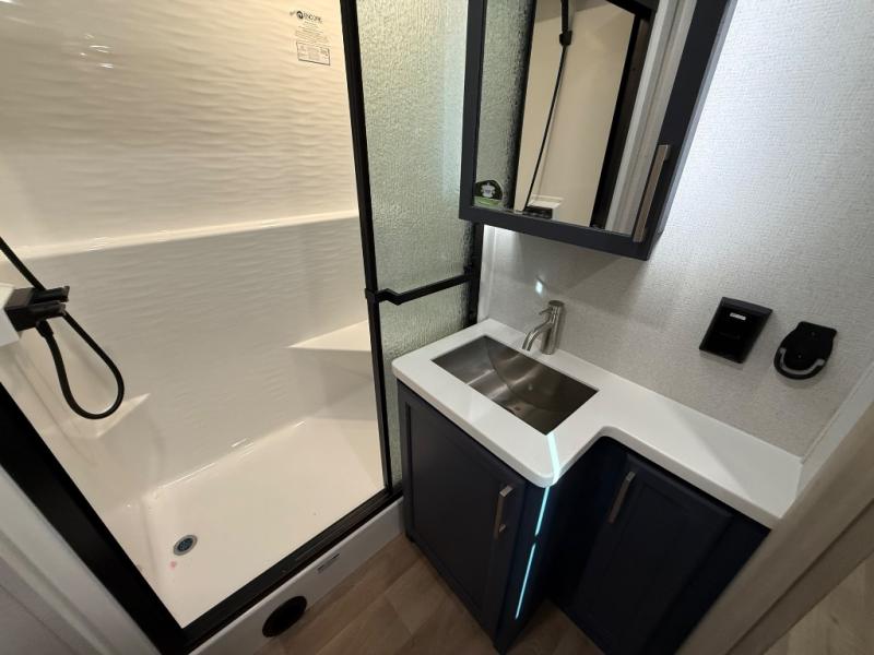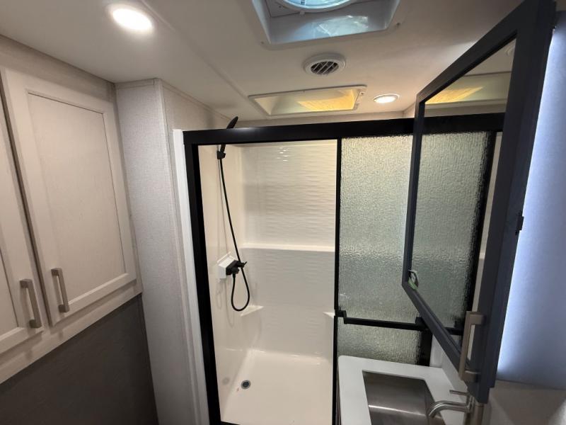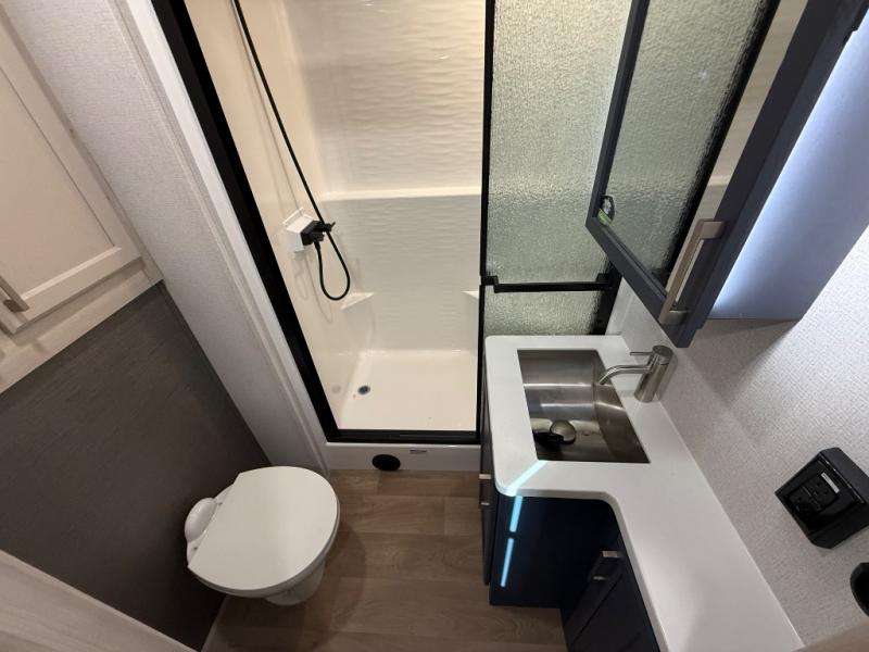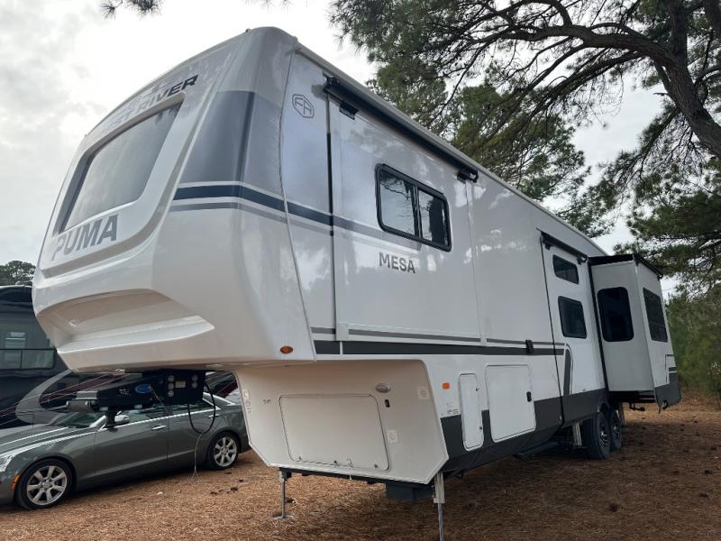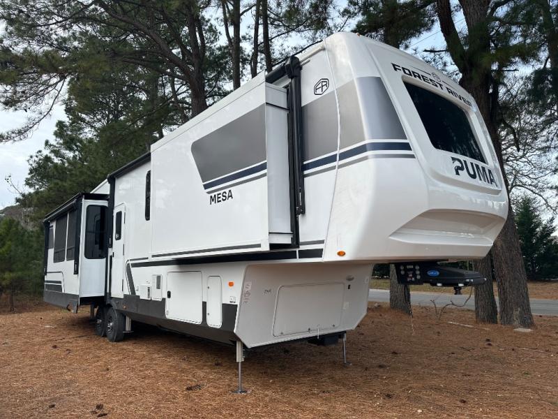 With the Puma Mesa fifth wheel by Forest River redefine your camping experience with a perfect blend of practical living, durable construction, and high-end style! These models are built on a rock-solid foundation featuring an all-welded aluminum frame superstructure and high gloss fiberglass vacuum bonded walls with Dual Azdel for long-lasting quality. The expansive 101" wide-body design maximizes interior space, and the worry-free composite slide floors provide excellent stability. Outside, the Puma Mesa ensures effortless travel and setup with a standard 6-point hydraulic leveling system and reliable 7,000 lb. axles with ABS and a Tire Pressure Monitoring System (TPMS). These fifth wheels also include practical features like a heated utility convenience center, 12V heat pads on all holding tanks for extended season use, and convenient slam latches on all storage doors. You will also love the outdoor living space created by the power awnings with LED lights and the accessibility provided by the standard ladder!