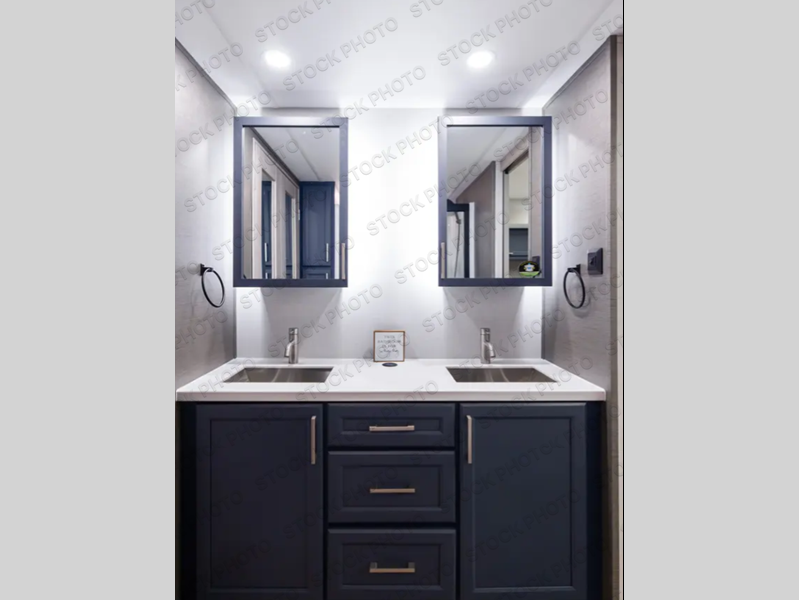 Everyone will stay clean with a bath and a half in this fifth wheel! The kitchen has a pantry big enough for everyone's favorite snacks, a gas cooktop, and a kitchen island to prepare your best meals. You can have game night indoors at the table and chairs or set up a table and chairs underneath the two power awnings. The rear living area offers a comfortable place to watch the big game too with a sofa/sleeper and theater seating directly across from the entertainment center with a 50" Smart TV and fireplace. Two can get ready at once in the front bathroom featuring a vanity with dual sinks, and since there is washer and dryer prep, you have the option to make wash day easier!