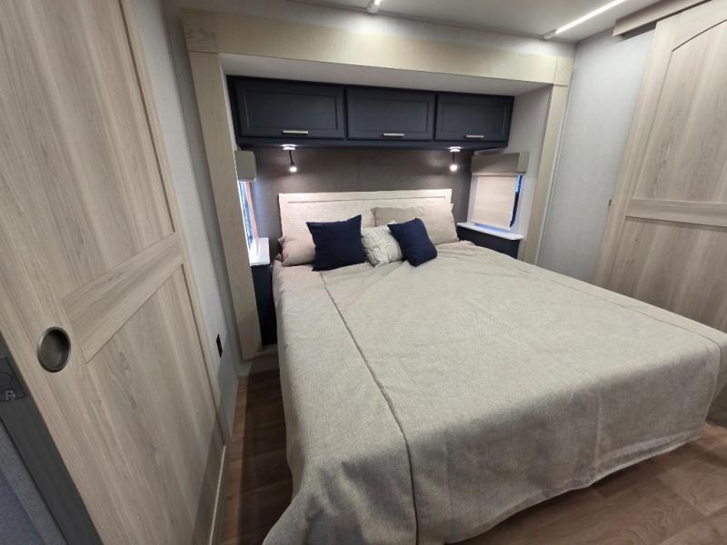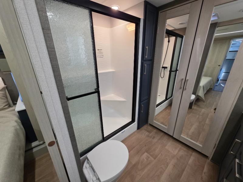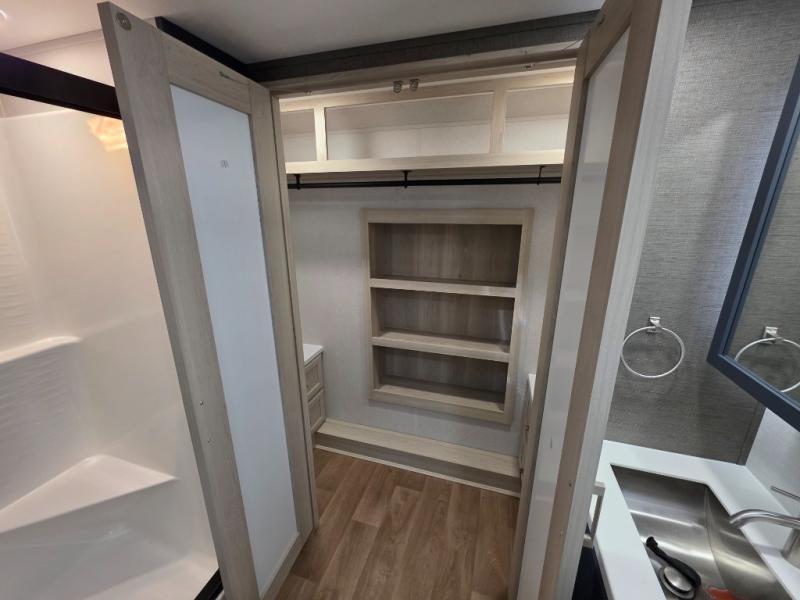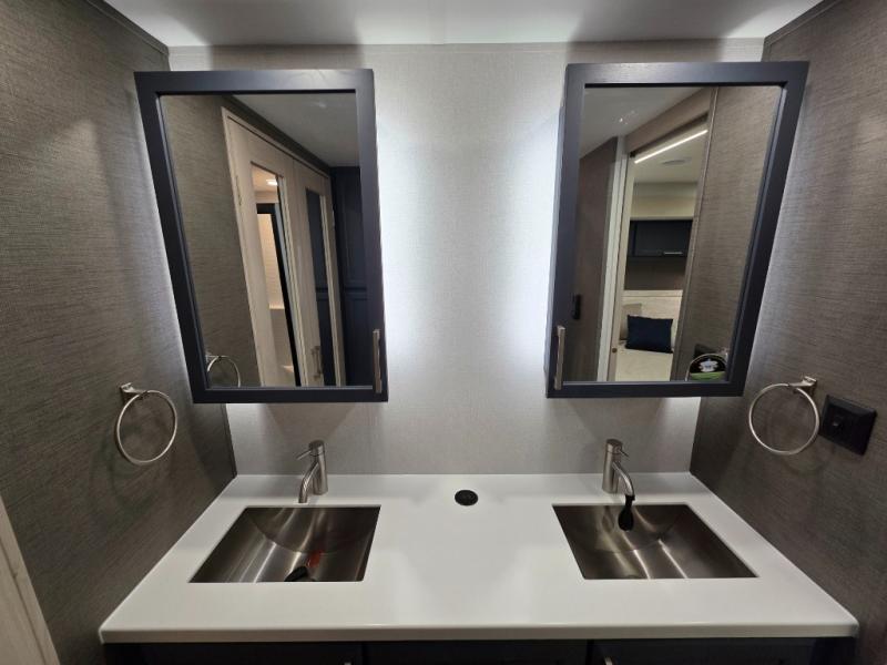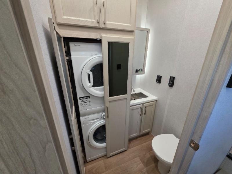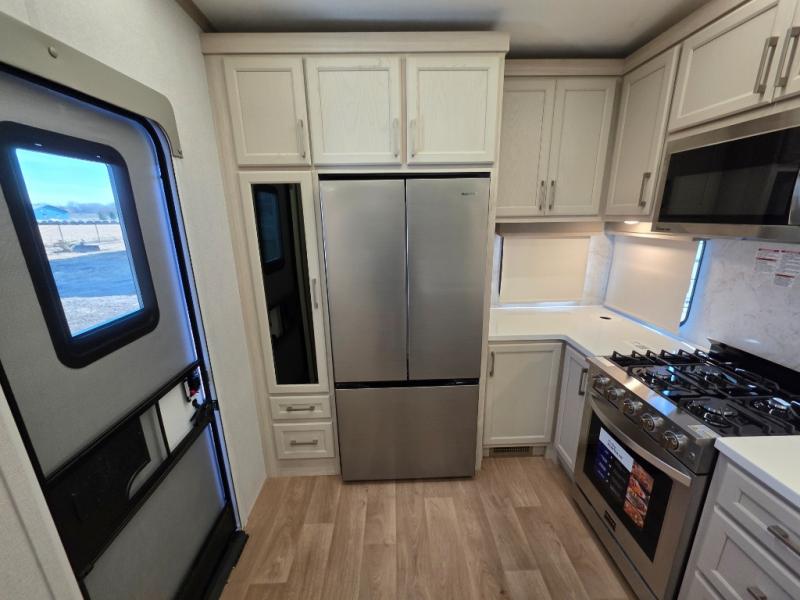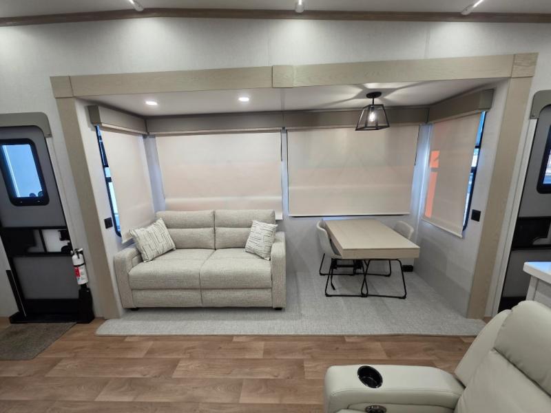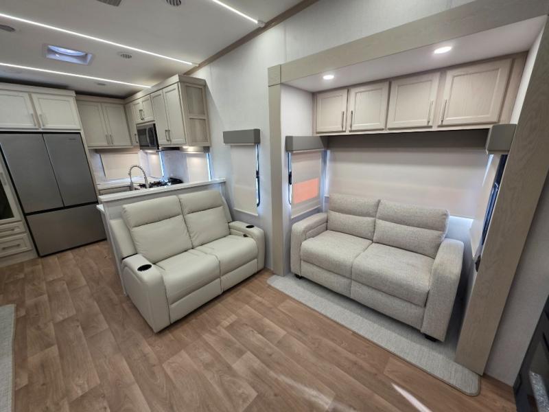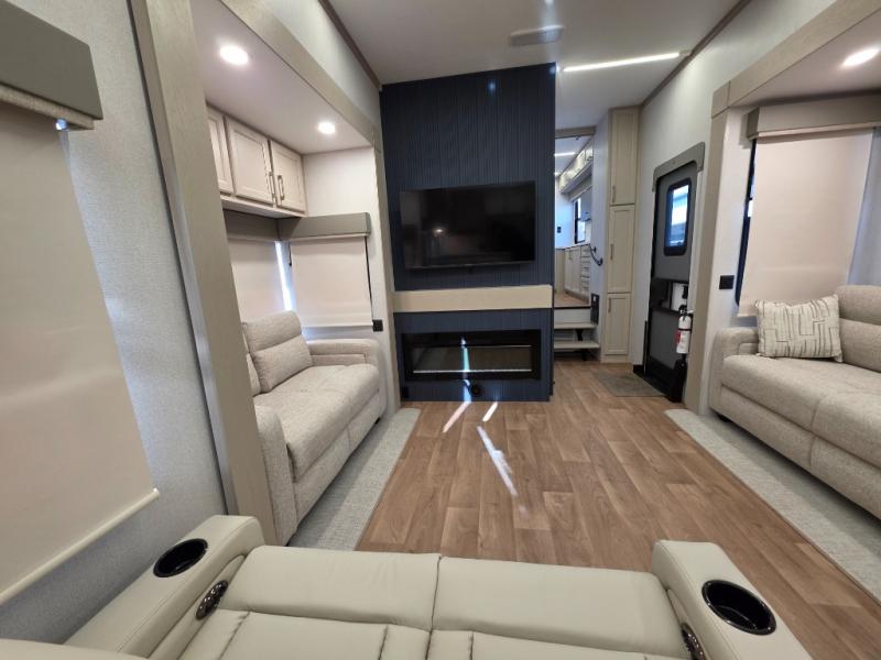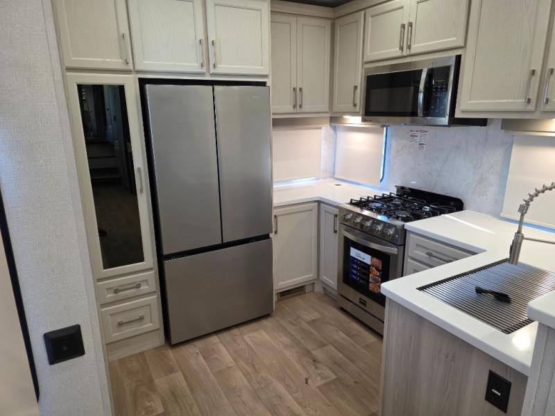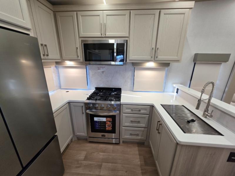 You won't believe all that this fifth wheel has to offer! Starting with the rear kitchen which has plenty of countertop space to prepare your delicious meals, a gas cooktop with a stainless steel 24" oven to cook them, and a large single bowl stainless steel sink for easy clean up. The living area has opposing sofas and a theater seat with USB charging and storage across from an entertainment center with 50" Smart TV. The half bathroom is close to the living area so you can get back to watching your movie faster. You will feel right at home sleeping in the master suite on a slide out king bed across from a dresser and hamper to keep your space tidy, plus entrance into the front full bathroom. Inside the bathroom, you will find a vanity with dual sinks for two to get ready at once, a spacious shower with a seat, and a walk-in closet for clothes, shoes, and more!