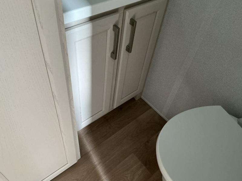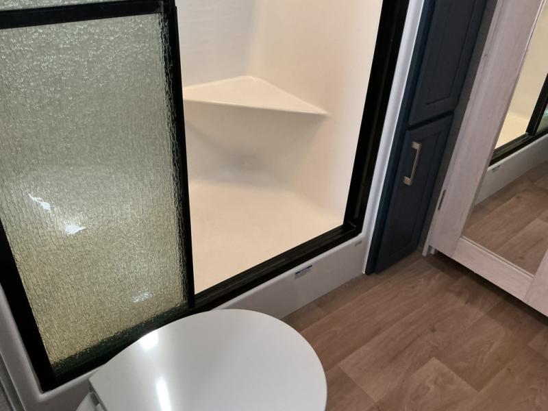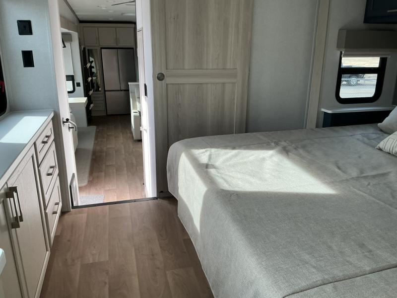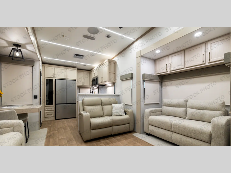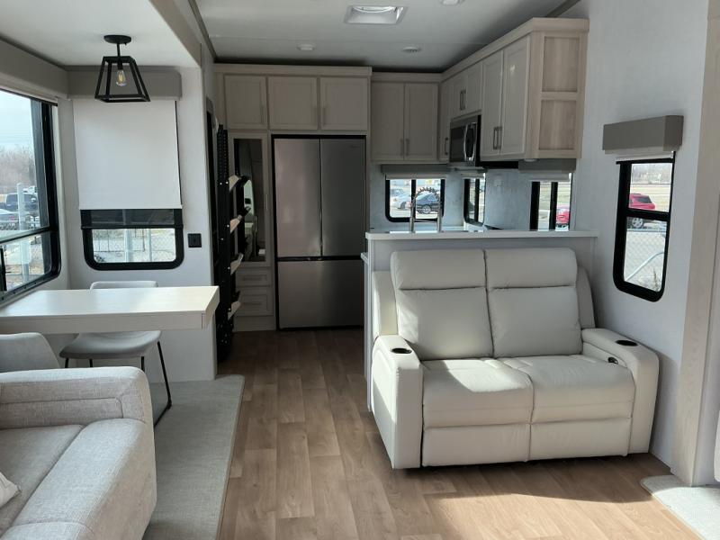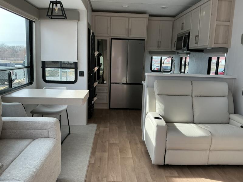 You won't believe all that this fifth wheel has to offer! Starting with the rear kitchen which has plenty of countertop space to prepare your delicious meals, a gas cooktop with a stainless steel 24" oven to cook them, and a large single bowl stainless steel sink for easy clean up. The living area has opposing sofas and a theater seat with USB charging and storage across from an entertainment center with 50" Smart TV. The half bathroom is close to the living area so you can get back to watching your movie faster. You will feel right at home sleeping in the master suite on a slide out king bed across from a dresser and hamper to keep your space tidy, plus entrance into the front full bathroom. Inside the bathroom, you will find a vanity with dual sinks for two to get ready at once, a spacious shower with a seat, and a walk-in closet for clothes, shoes, and more!