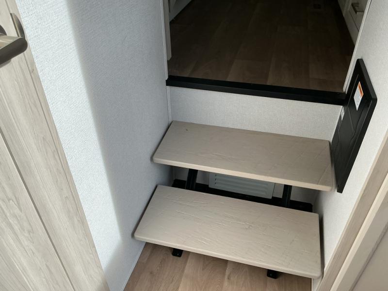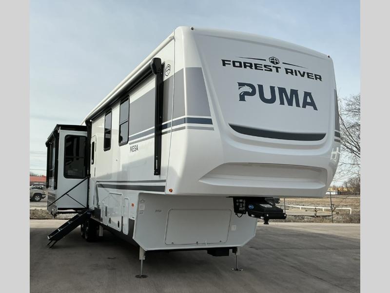 With the Puma Mesa fifth wheel by Forest River redefine your camping experience with a perfect blend of practical living, durable construction, and high-end style! These models are built on a rock-solid foundation featuring an all-welded aluminum frame superstructure and high gloss fiberglass vacuum bonded walls with Dual Azdel for long-lasting quality. The expansive 101" wide-body design maximizes interior space, and the worry-free composite slide floors provide excellent stability. Outside, the Puma Mesa ensures effortless travel and setup with a standard 6-point hydraulic leveling system and reliable 7,000 lb. axles with ABS and a Tire Pressure Monitoring System (TPMS). These fifth wheels also include practical features like a heated utility convenience center, 12V heat pads on all holding tanks for extended season use, and convenient slam latches on all storage doors. You will also love the outdoor living space created by the power awnings with LED lights and the accessibility provided by the standard ladder!