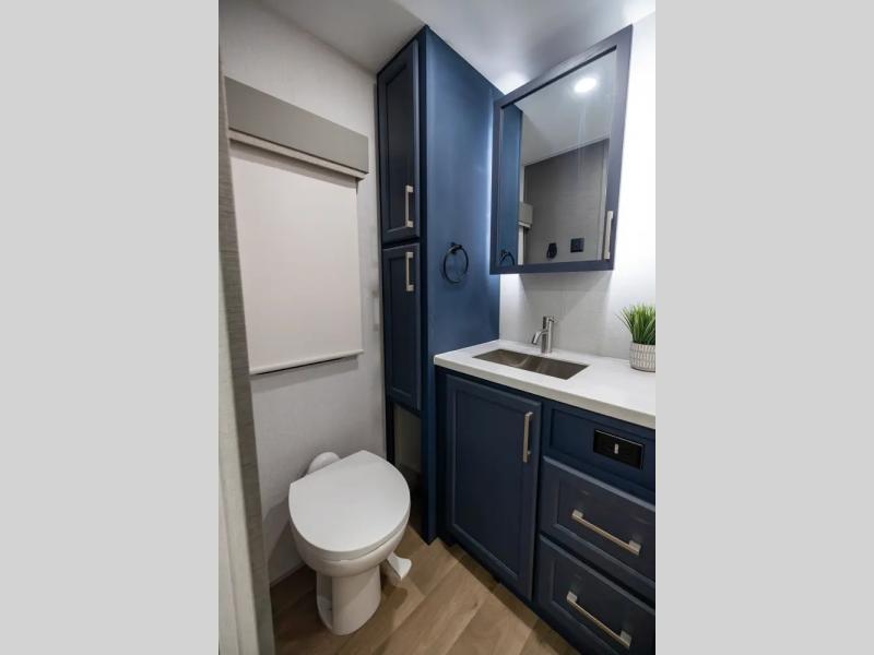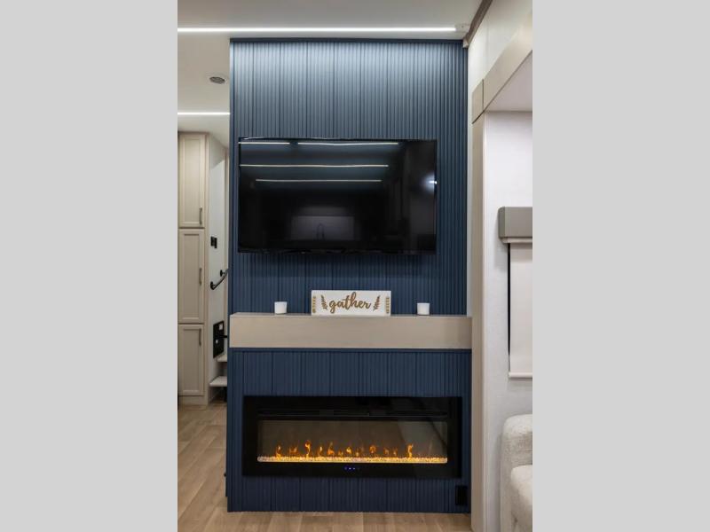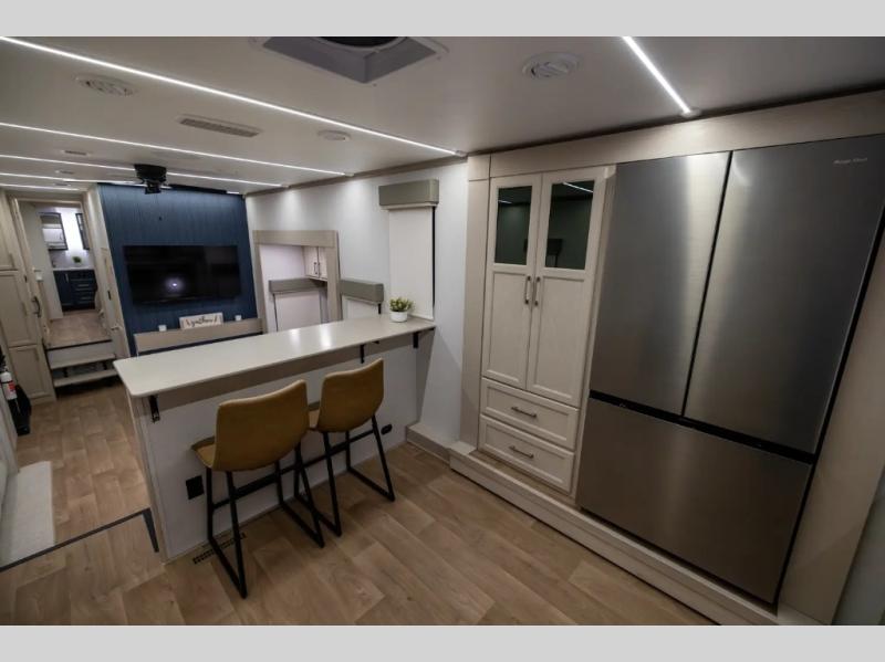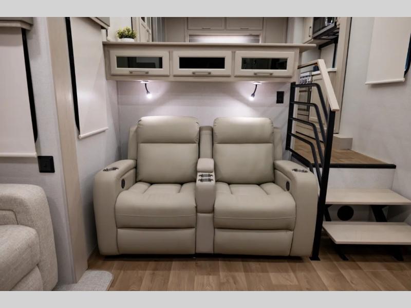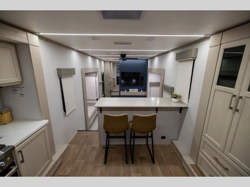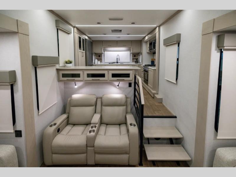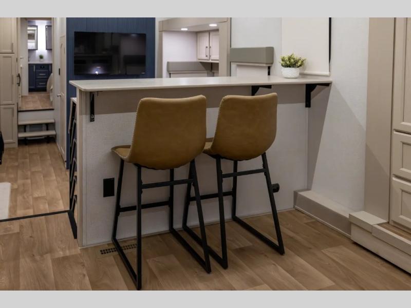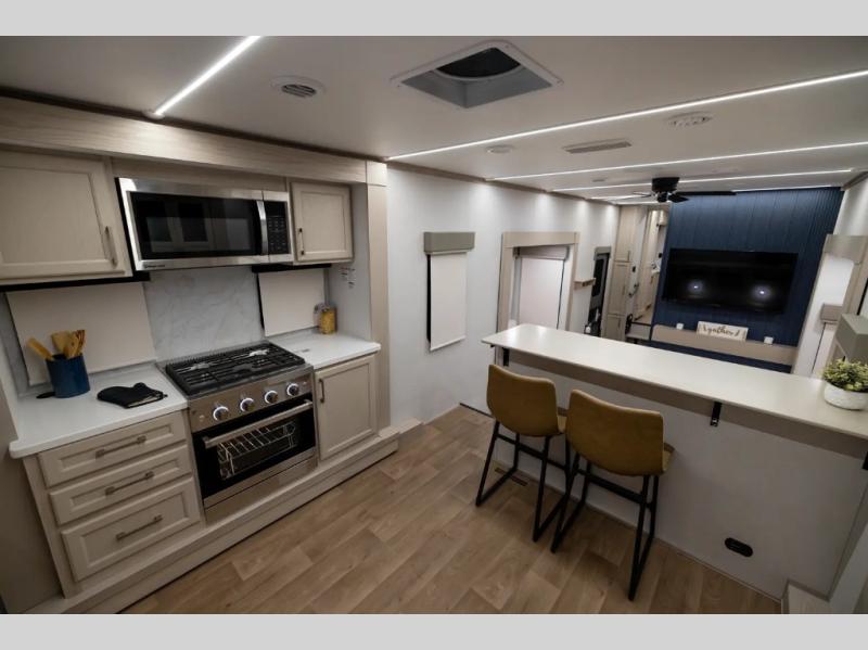 The front kitchen in this fifth wheel is a chef's dream come true while camping! There is generous counter space up front and beside the range, plus a pantry and 12V refrigerator with an ice maker. There is also a hi-top table with two bar stools that overlooks the living area. Inside the living area there are opposing sofa sleeper slides and power theater seating across from an entertainment center with a 50" Smart TV. A mid-coach half bath is easily accessible, and the full rear bath with dual bath sinks will create a master bedroom you are sure to love. There is a king bed slide out, a wardrobe, hamper, and a TV/storage.