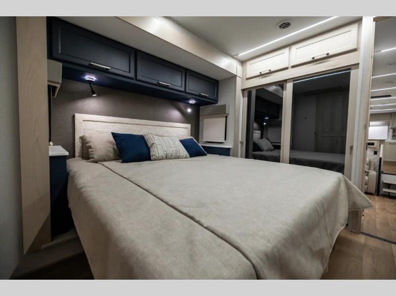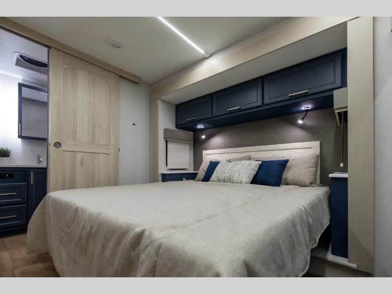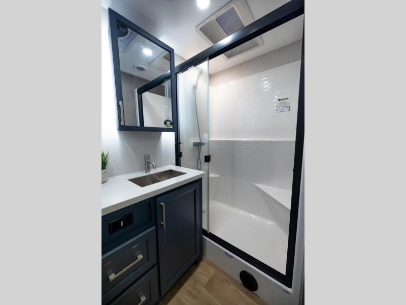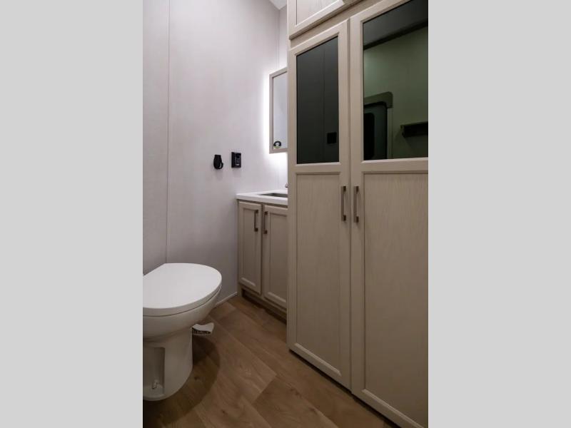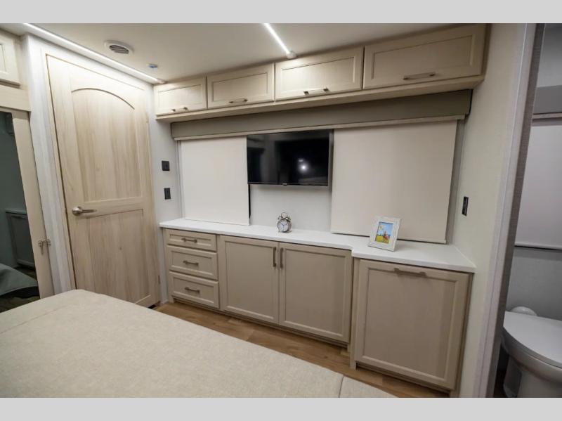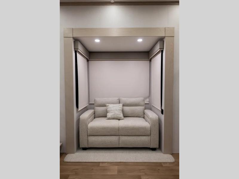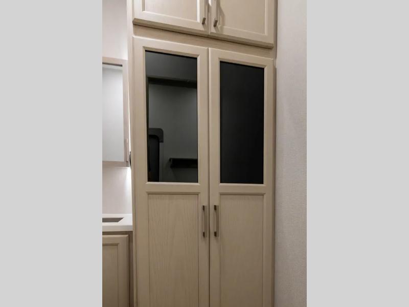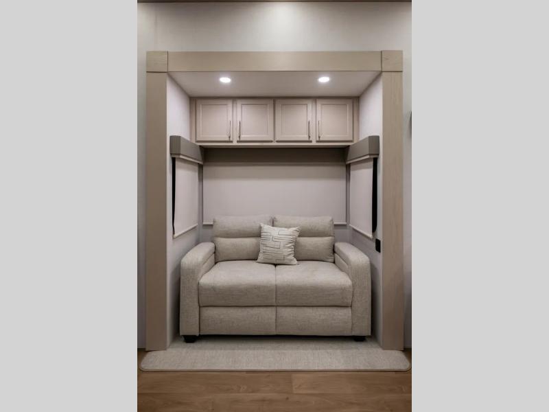 The front kitchen in this fifth wheel is a chef's dream come true while camping! There is generous counter space up front and beside the range, plus a pantry and 12V refrigerator with an ice maker. There is also a hi-top table with two bar stools that overlooks the living area. Inside the living area there are opposing sofa sleeper slides and power theater seating across from an entertainment center with a 50" Smart TV. A mid-coach half bath is easily accessible, and the full rear bath with dual bath sinks will create a master bedroom you are sure to love. There is a king bed slide out, a wardrobe, hamper, and a TV/storage.