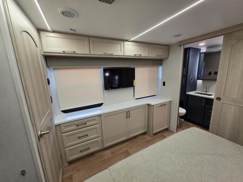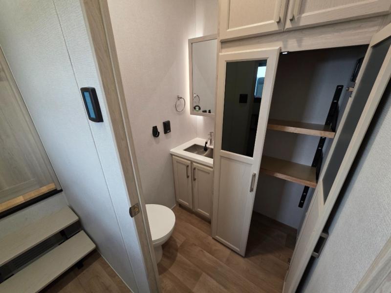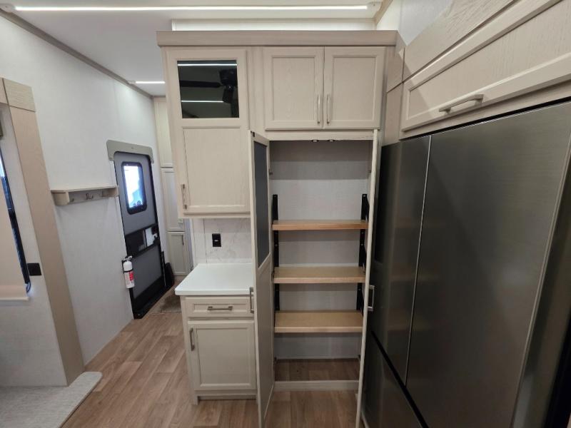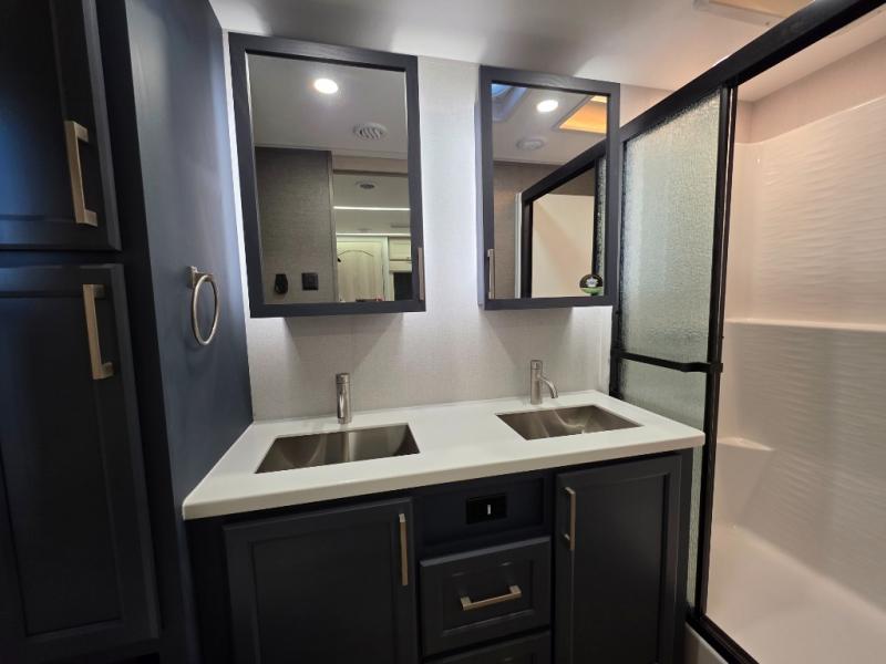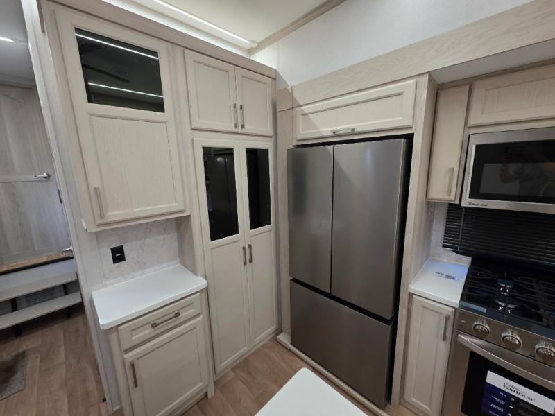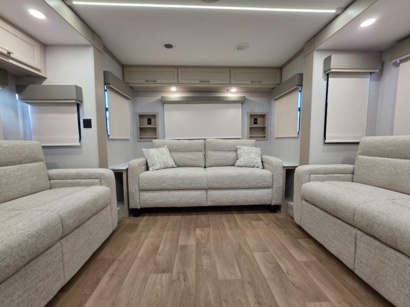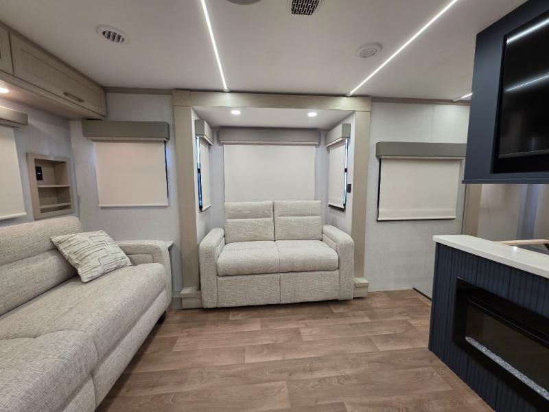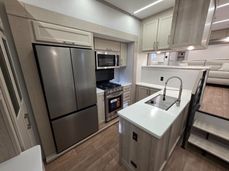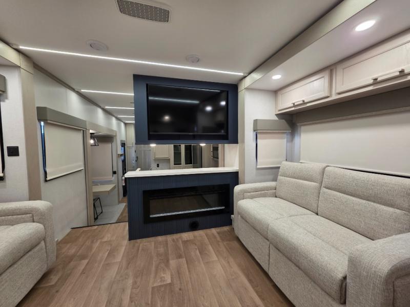 Comfort is found at every turn in this spacious fifth wheel! The front living area will be a favorite place to hang out with its dual 60" split tri-fold sofas, 78" sofa, and entertainment center with a fireplace. The chef of your group will find a middle kitchen, complete with a counter peninsula, a gas cooktop, a stainless-steel oven, plus a 12V stainless-steel residential style refrigerator with an ice maker. There is also a table and chairs where you can dine together each day. As you head to the rear of the unit, you'll find a half bath, which is convenient for all, and you're sure to enjoy your own space in the master bedroom. There is a king bed slide out here, a hamper, TV with storage, and a full rear bath with dual bath sinks; how convenient!