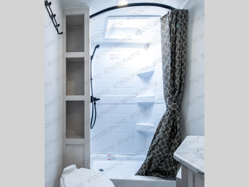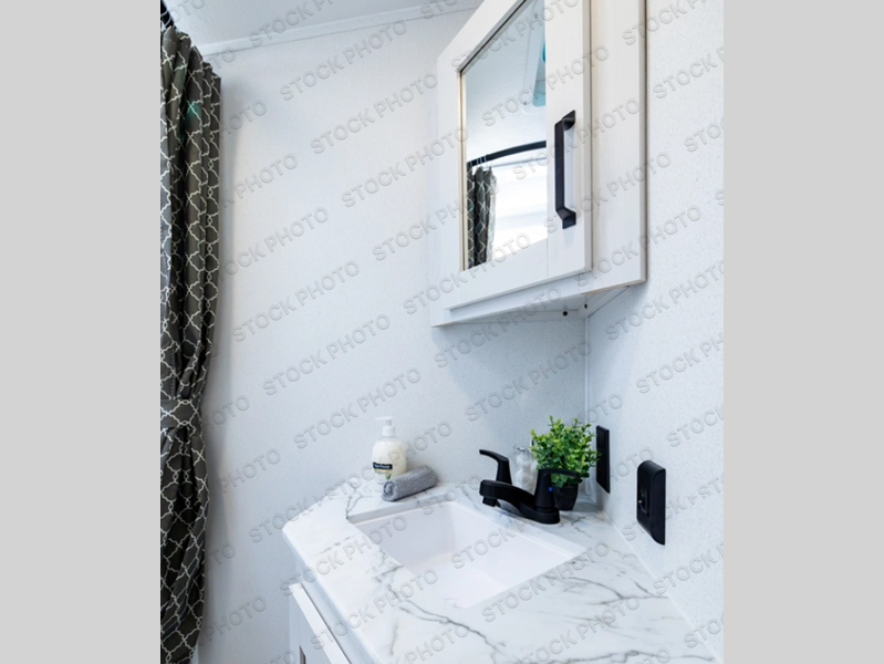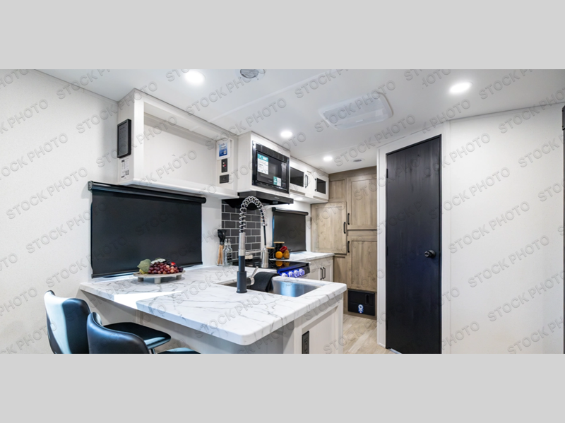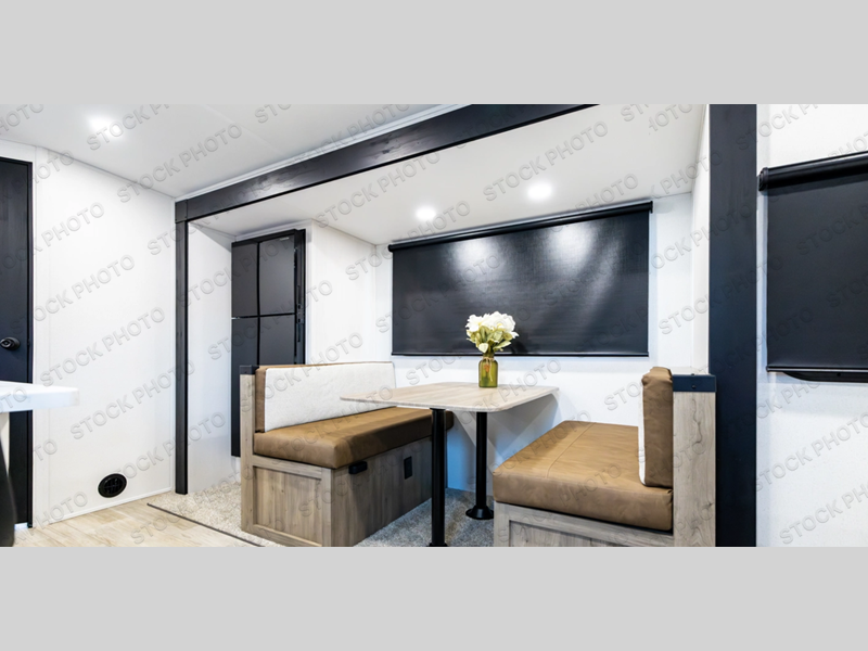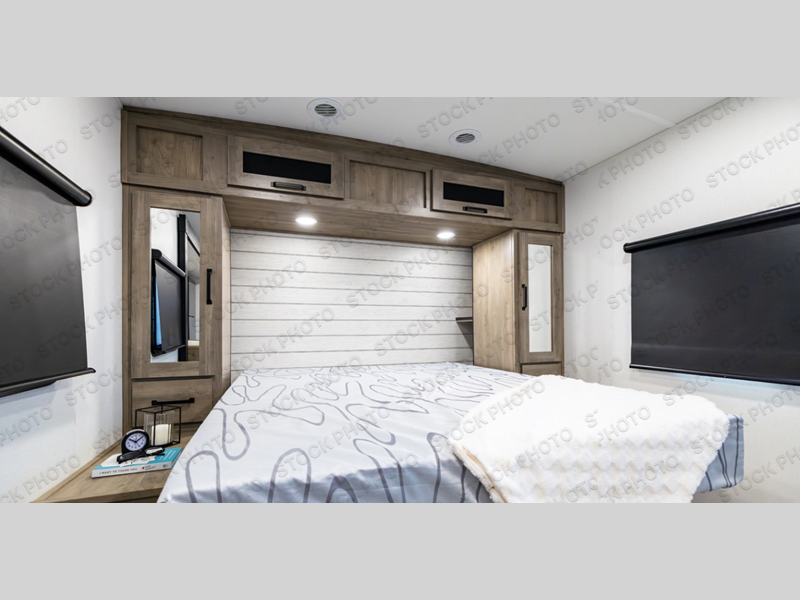 You'll love every minute spent in this travel trailer, whether at the lake or in the woods! Once you arrive at the campground, you can unload the pass-thru storage, then start lunch in the rear corner kitchen. There is a bar top with two seats where you can dine at, and an added booth dinette slide provides more seating space, as well as sleeping space for guests. You'll enjoy having the front RV queen bed to yourselves, and there are dual bedside wardrobes to keep your things tidy.