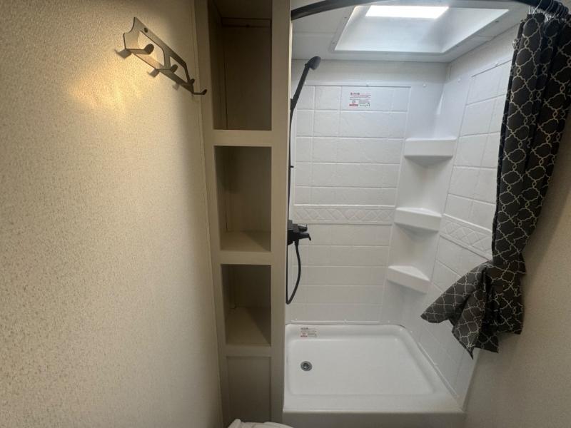 You'll love every minute spent in this travel trailer, whether at the lake or in the woods! Once you arrive at the campground, you can unload the pass-thru storage, then start lunch in the rear corner kitchen. There is a bar top with two seats where you can dine at, and an added booth dinette slide provides more seating space, as well as sleeping space for guests. You'll enjoy having the front RV queen bed to yourselves, and there are dual bedside wardrobes to keep your things tidy.