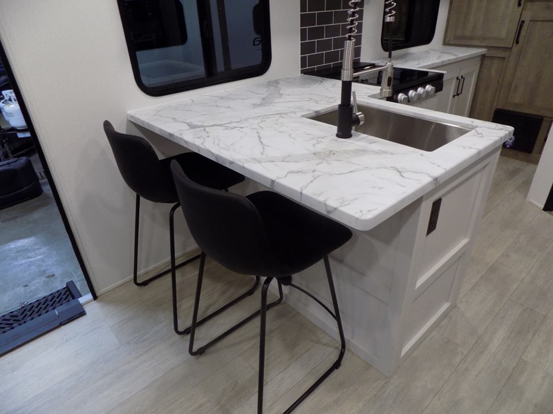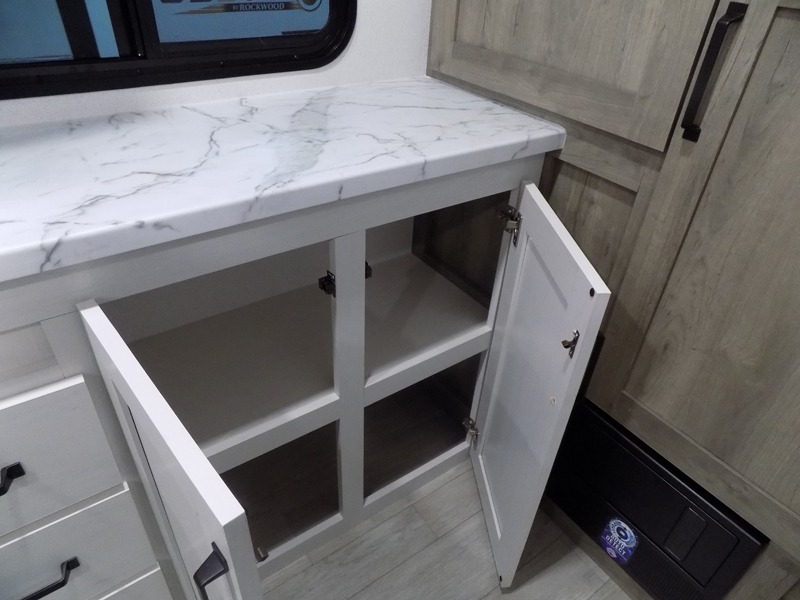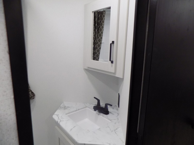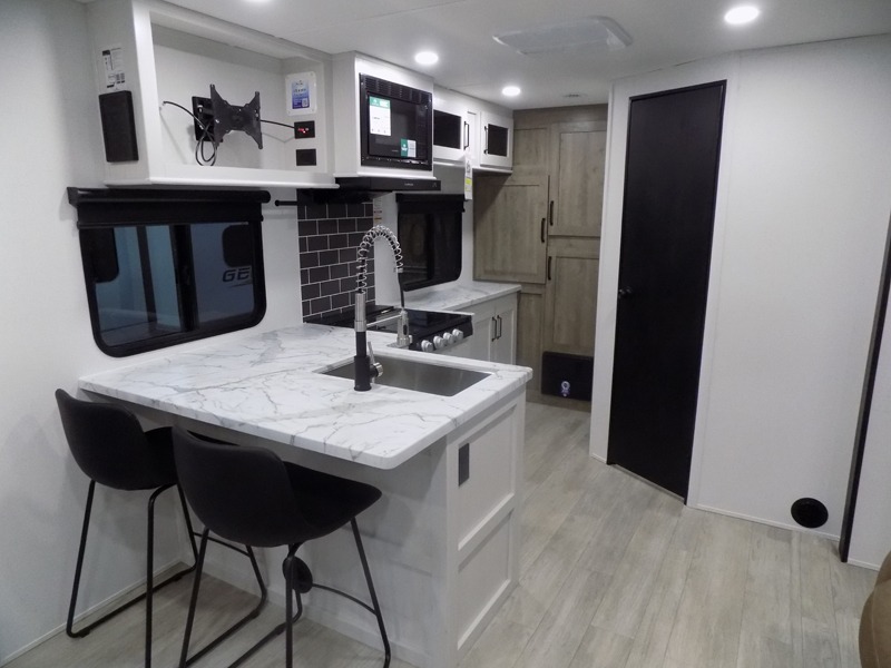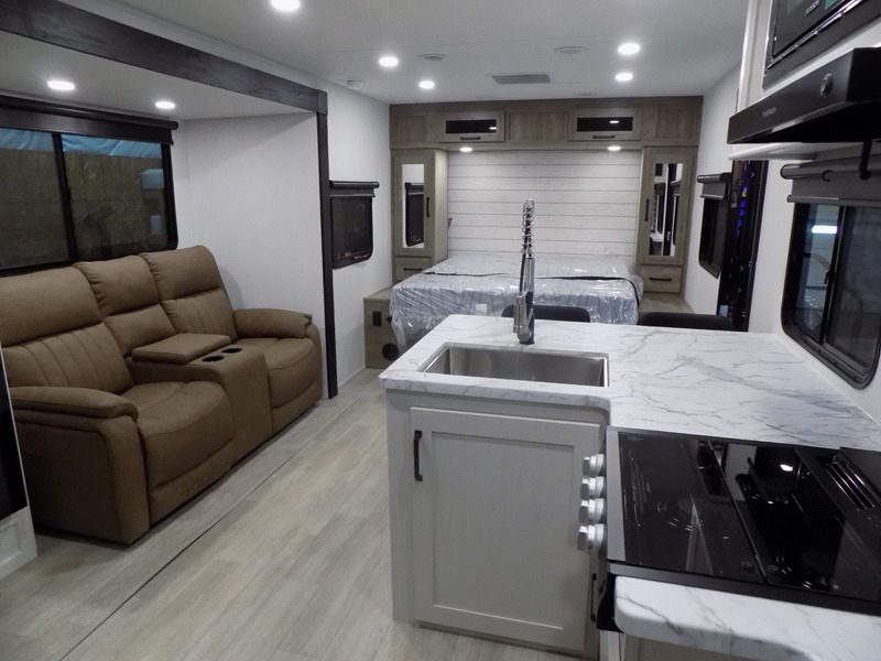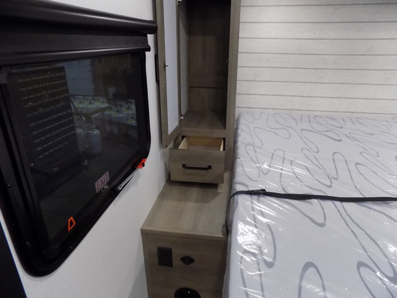 You'll love every minute spent in this travel trailer, whether at the lake or in the woods! Once you arrive at the campground, you can unload the pass-thru storage, then start lunch in the rear corner kitchen. There is a bar top with two seats where you can dine at, and an added booth dinette slide provides more seating space, as well as sleeping space for guests. You'll enjoy having the front RV queen bed to yourselves, and there are dual bedside wardrobes to keep your things tidy.