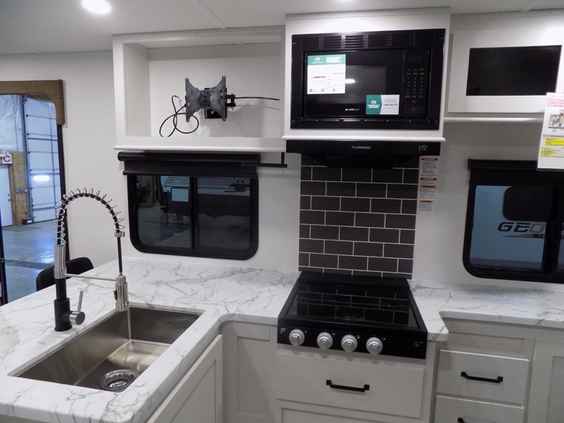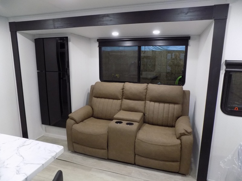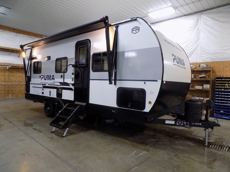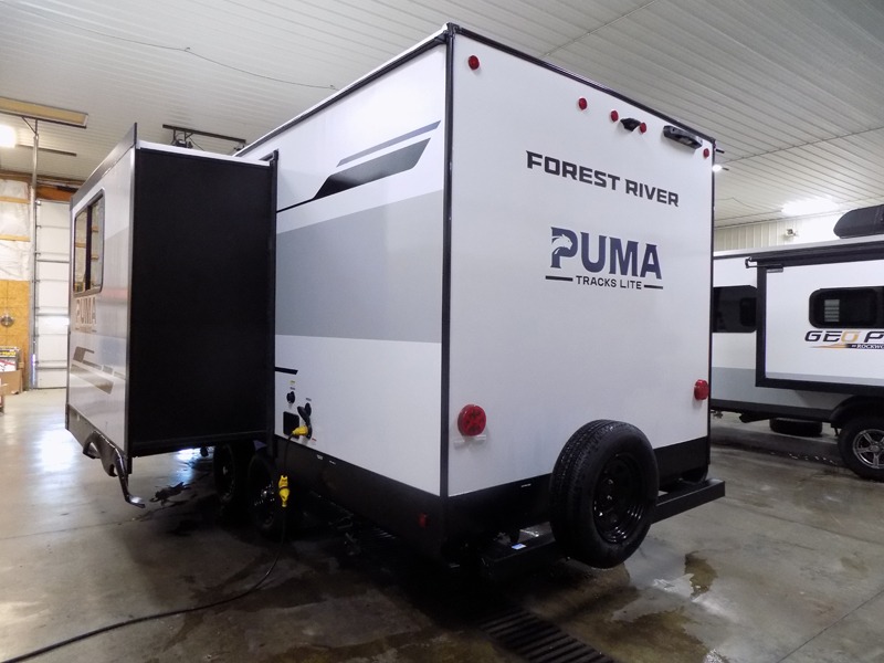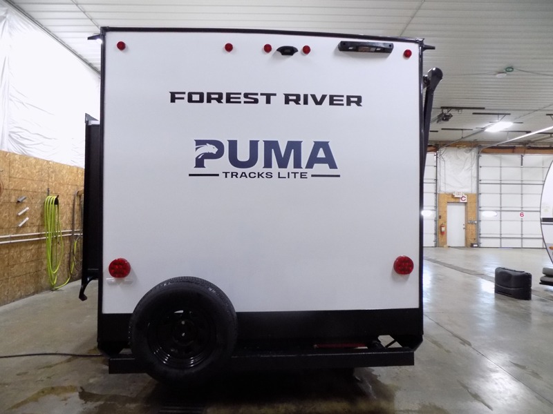 Each Puma Tracks travel trailer by Forest River is constructed with a fully enclosed/heated underbelly for added protection against the elements, plus a fully laminated roof and rear wall for durability. The slam latch baggage doors with magnets will make it easier than ever to pack up your camp gear, and the power awning with LED lights will provide shade during the day and inviting ambiance at night. Head inside to enjoy the roller shades, smoked glass kitchen cabinet doors, stainless-steel sink, and LED lights to keep your space well lit. Some of the available options include a bedroom A/C, a Wi-Fi booster, heated holding tanks, and more!