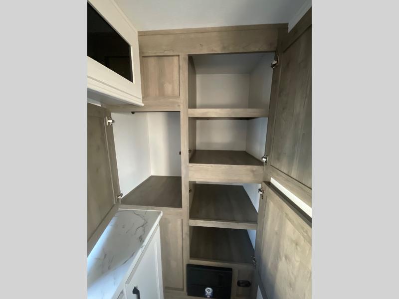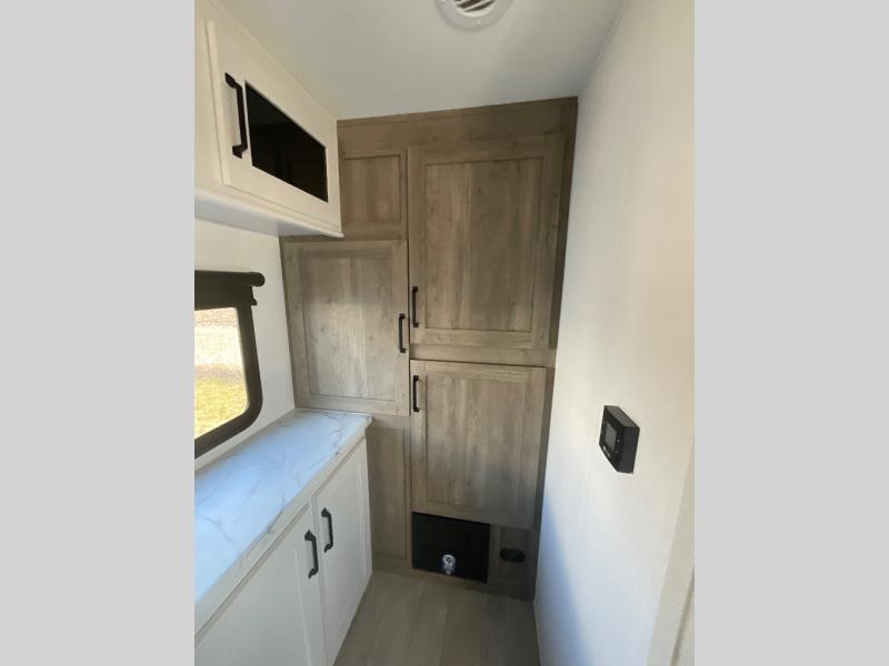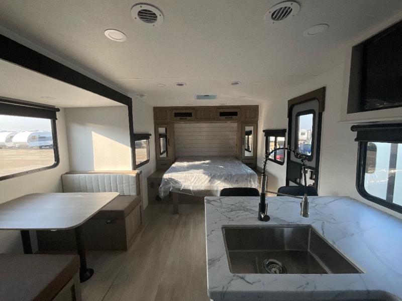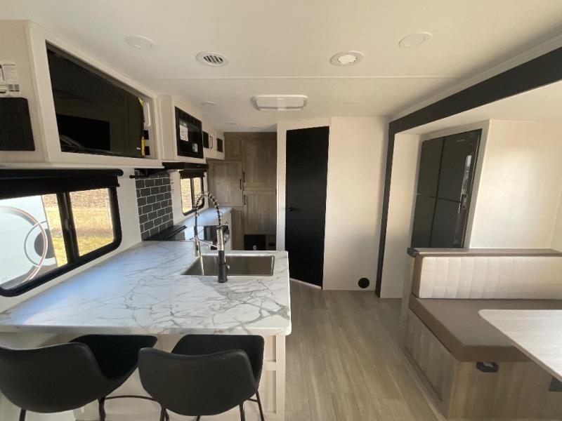 You'll love every minute spent in this travel trailer, whether at the lake or in the woods! Once you arrive at the campground, you can unload the pass-thru storage, then start lunch in the rear corner kitchen. There is a bar top with two seats where you can dine at, and an added booth dinette slide provides more seating space, as well as sleeping space for guests. You'll enjoy having the front RV queen bed to yourselves, and there are dual bedside wardrobes to keep your things tidy.