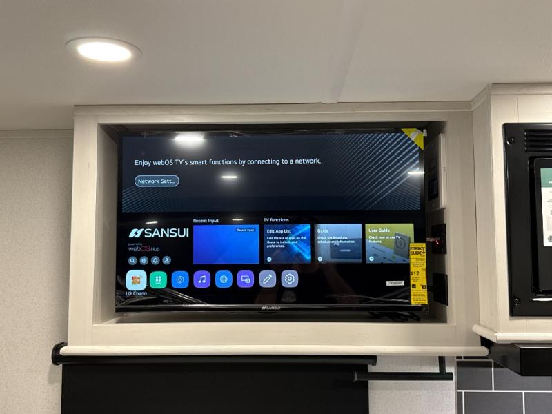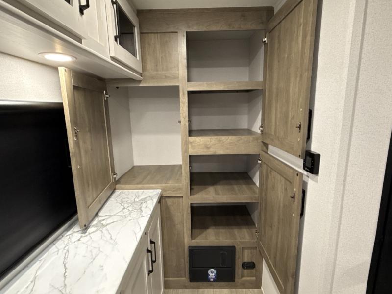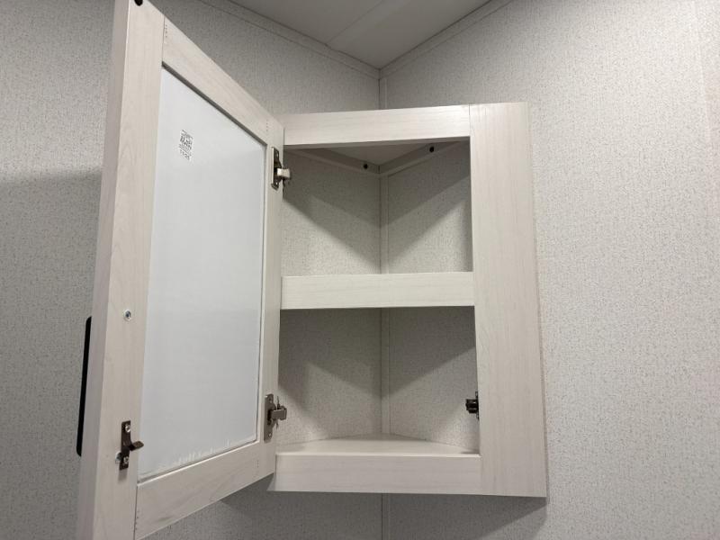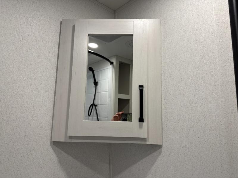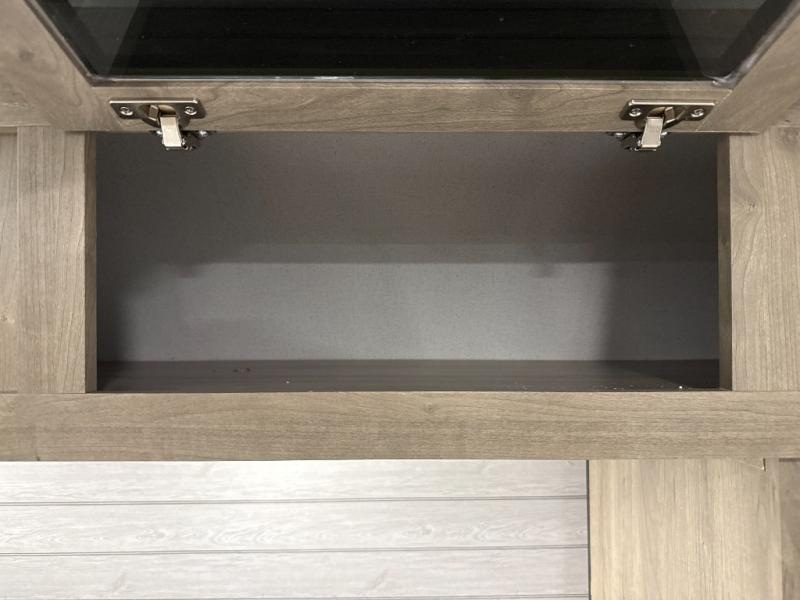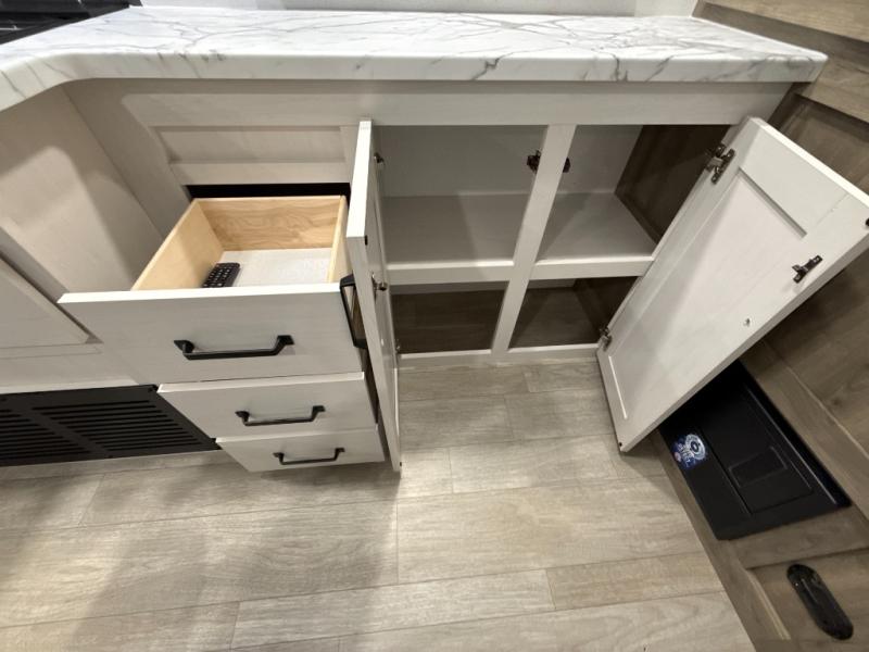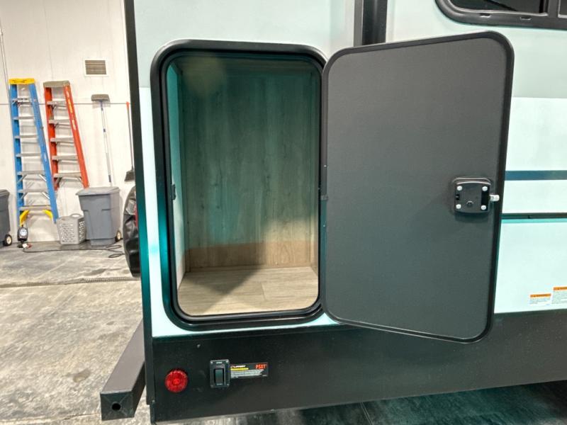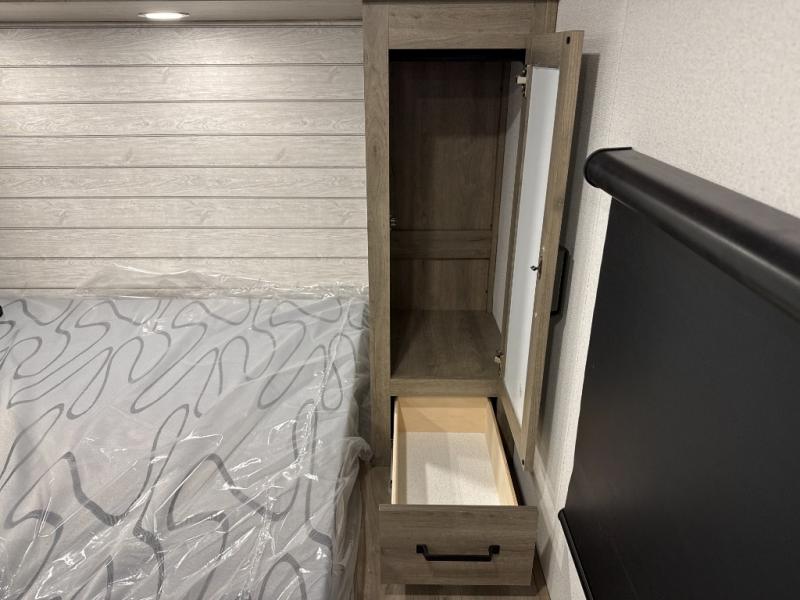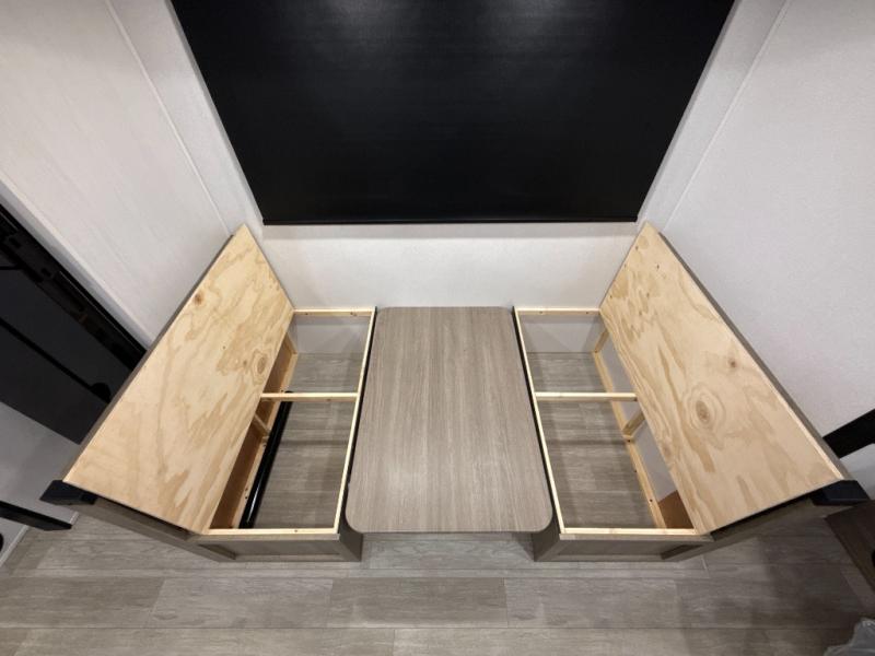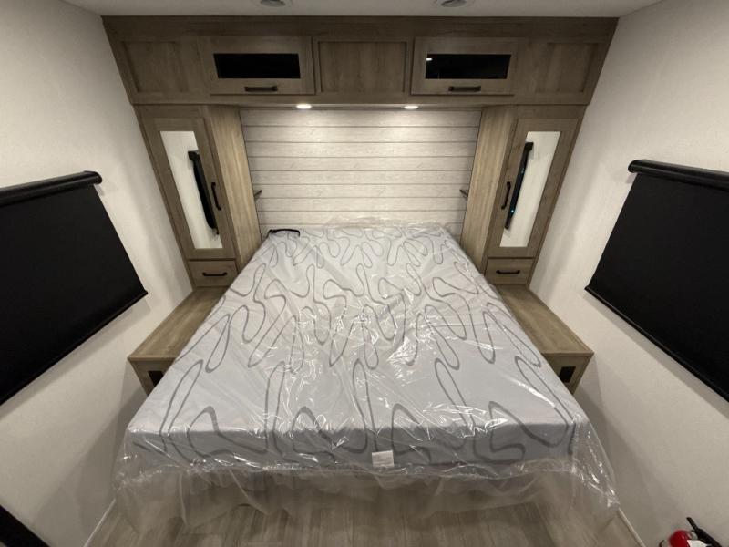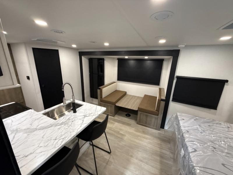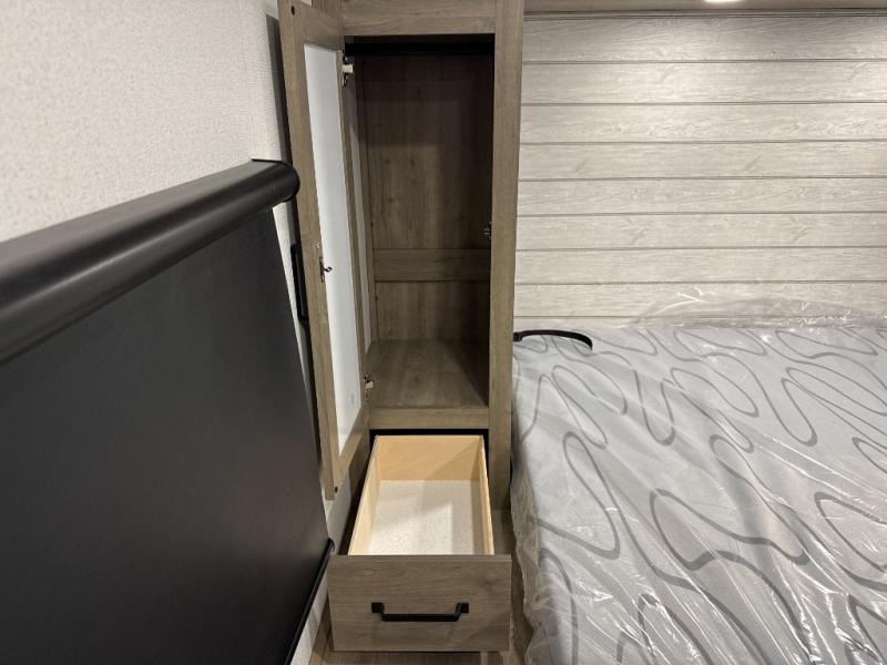 You'll love every minute spent in this travel trailer, whether at the lake or in the woods! Once you arrive at the campground, you can unload the pass-thru storage, then start lunch in the rear corner kitchen. There is a bar top with two seats where you can dine at, and an added booth dinette slide provides more seating space, as well as sleeping space for guests. You'll enjoy having the front RV queen bed to yourselves, and there are dual bedside wardrobes to keep your things tidy.