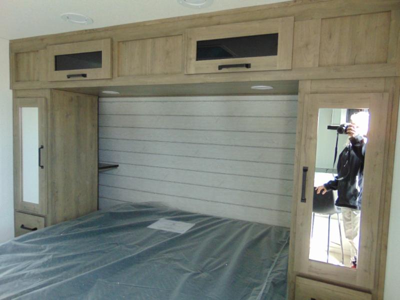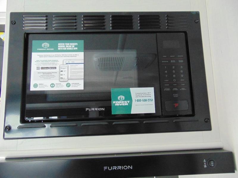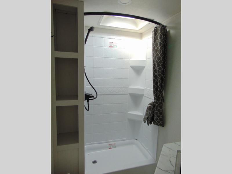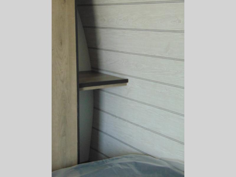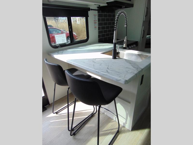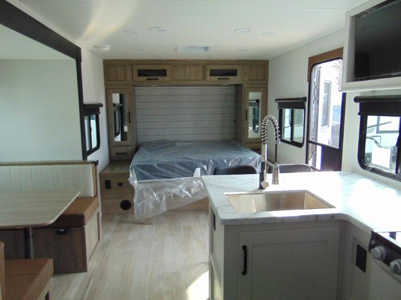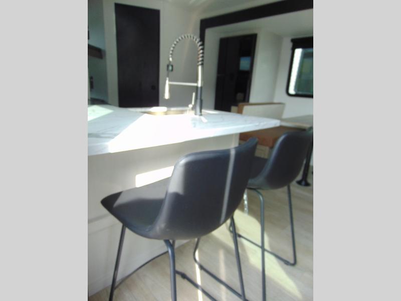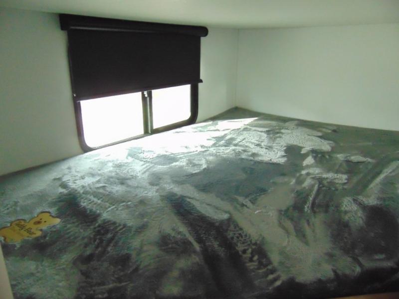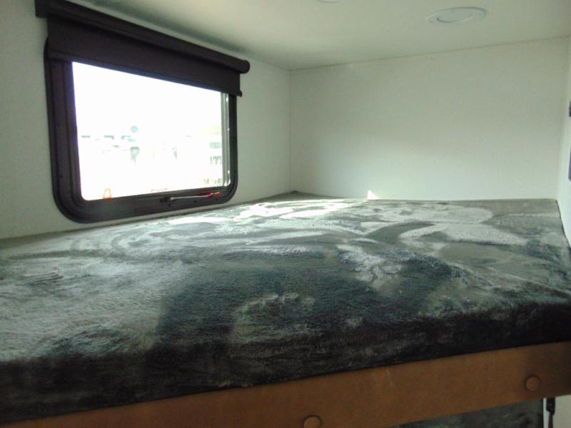 You'll love every minute spent in this travel trailer, whether at the lake or in the woods! Once you arrive at the campground, you can unload the pass-thru storage, then start lunch in the full kitchen inside. There is a bar top with two seats where you can dine at, and an added booth dinette slide provides more seating space, as well as sleeping space for guests. You'll enjoy having the front RV queen bed to yourselves, while your guests or little ones take the 45" x 68" convertible bunk beds!