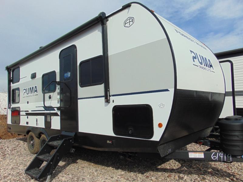 Each Puma Tracks travel trailer by Forest River is constructed with a fully enclosed/heated underbelly for added protection against the elements, plus a fully laminated roof and rear wall for durability. The slam latch baggage doors with magnets will make it easier than ever to pack up your camp gear, and the power awning with LED lights will provide shade during the day and inviting ambiance at night. Head inside to enjoy the roller shades, smoked glass kitchen cabinet doors, stainless-steel sink, and LED lights to keep your space well lit. Some of the available options include a bedroom A/C, a Wi-Fi booster, heated holding tanks, and more!