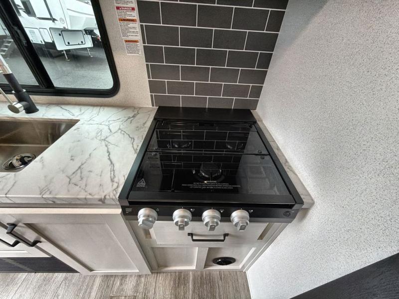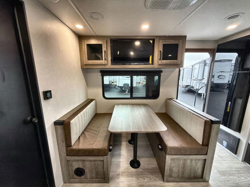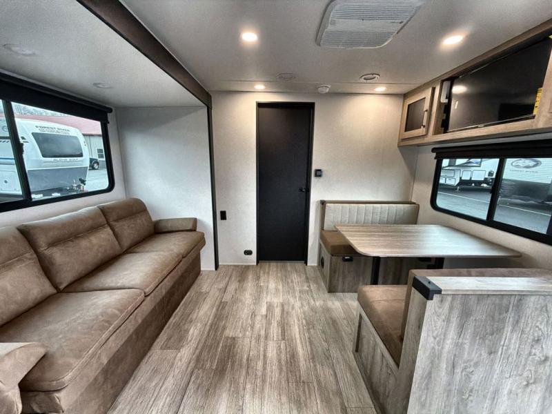 Enjoy time at the campground in this rear kitchen travel trailer. You'll find a cooktop and microwave here, along with a pantry and 11-cu. ft. electric refrigerator to keep your food fresh. There is a booth dinette to dine at plus a sofa sleeper slide out for more seating and sleeping space for guests. The walk-thru bath leads to the front master bedroom where you'll enjoy a 60" x 74" RV queen bed and dual bedside wardrobes to keep your things tidy. Outside, more storage space is found in the pass-thru, and there is a 17' power awning with LED lights where you can visit with friends!