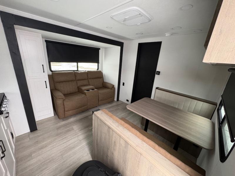Enjoy time at the campground in this rear kitchen travel trailer. You'll find a cooktop and microwave here, along with a pantry and 11-cu. ft. electric refrigerator to keep your food fresh. There is a booth dinette to dine at plus a sofa sleeper slide out for more seating and sleeping space for guests. The walk-thru bath leads to the front master bedroom where you'll enjoy a 60" x 74" RV queen bed and dual bedside wardrobes to keep your things tidy. Outside, more storage space is found in the pass-thru, and there is a 17' power awning with LED lights where you can visit with friends!