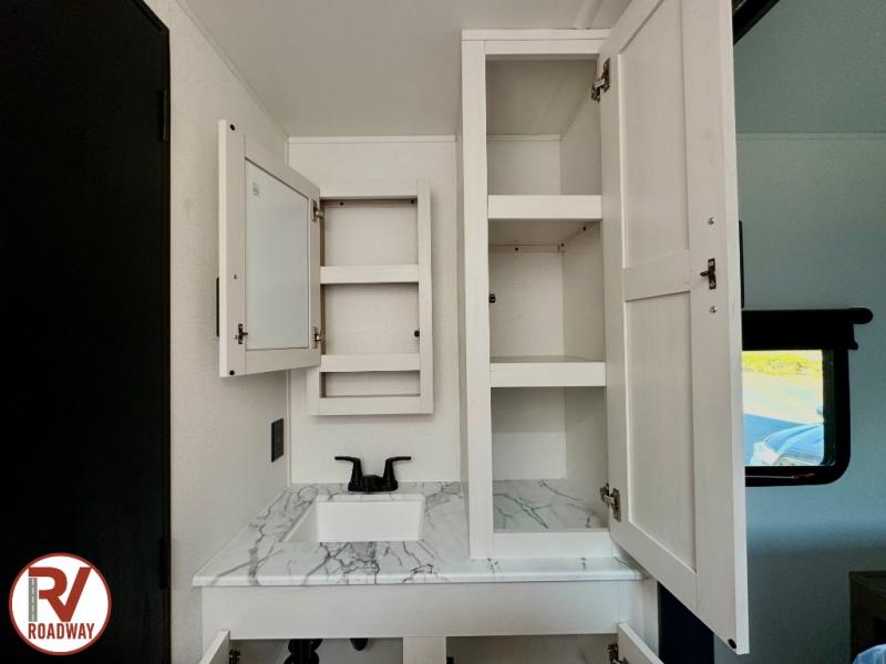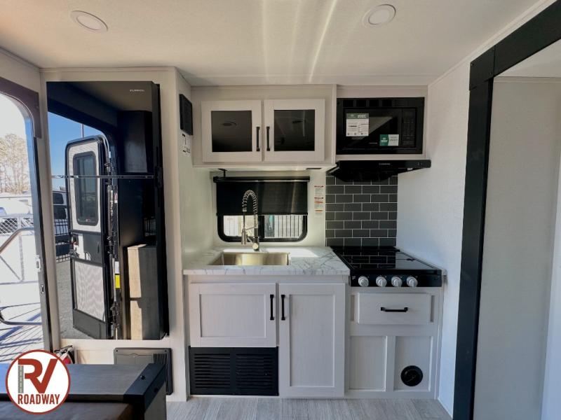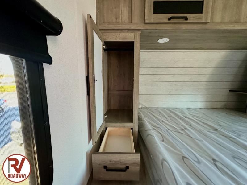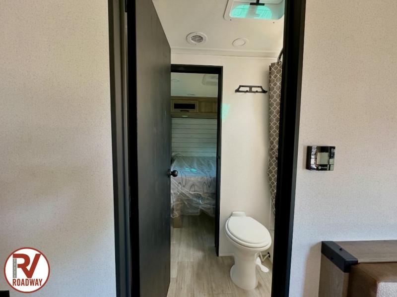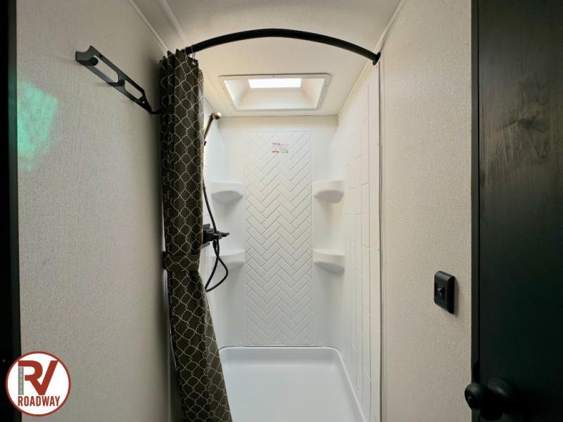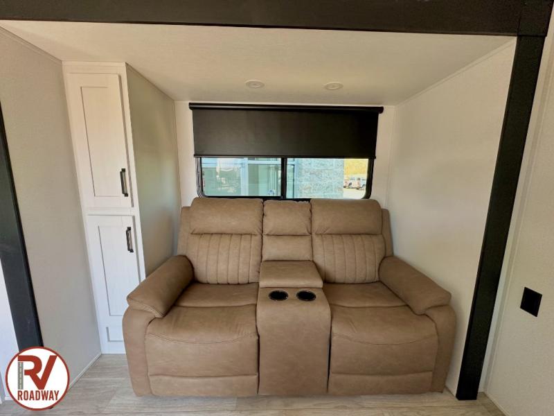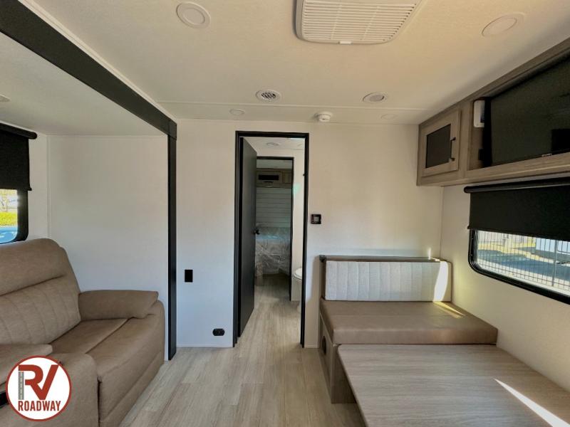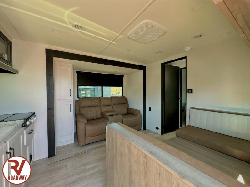 Enjoy time at the campground in this rear kitchen travel trailer. You'll find a cooktop and microwave here, along with a pantry and 11-cu. ft. electric refrigerator to keep your food fresh. There is a booth dinette to dine at plus a sofa sleeper slide out for more seating and sleeping space for guests. The walk-thru bath leads to the front master bedroom where you'll enjoy a 60" x 74" RV queen bed and dual bedside wardrobes to keep your things tidy. Outside, more storage space is found in the pass-thru, and there is a 17' power awning with LED lights where you can visit with friends!