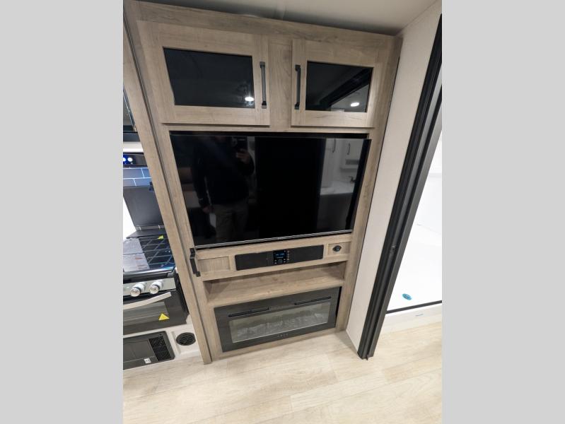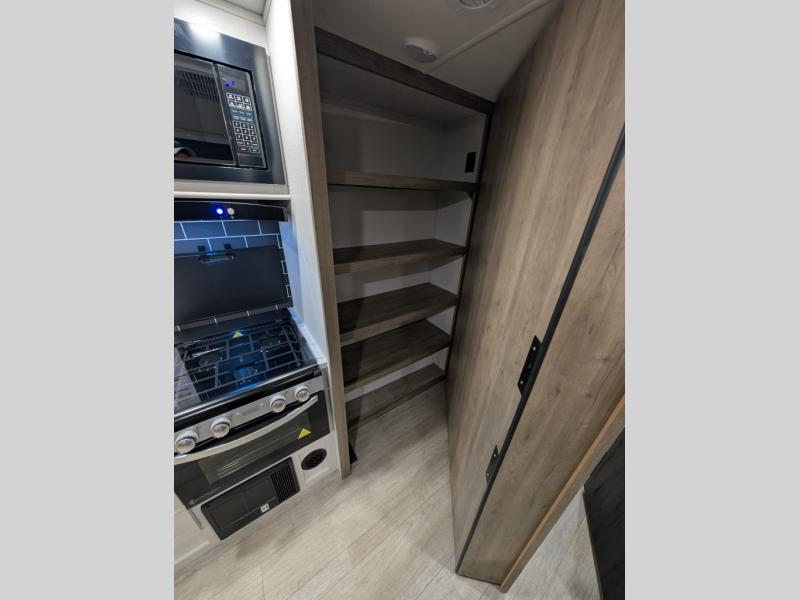 This couple's trailer is perfect for weekend trips to the campground. You can relax inside on the theater seats that are within a large slide out, and there is a hidden pantry behind the entertainment center to keep snacks stocked. The full rear bathroom gives you the space you need as well as a shower with a seat plus washer and dryer prep. And the front bedroom provides a queen bed, dual wardrobes and privacy.
